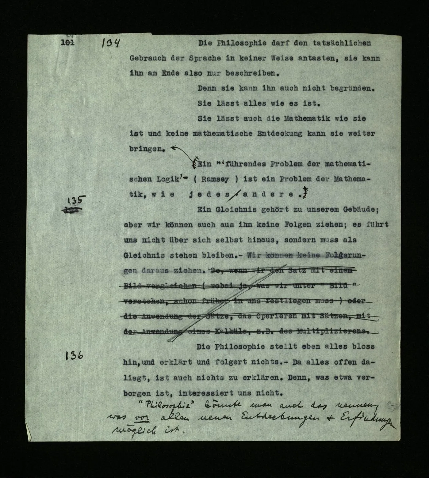 136 Die Philosophie stellt eben alles bloß hin, und erklärt und folgert nichts. – Da alles offen daliegt, ist auch nichts zu erklären. Denn, was etwa verborgen ist, interessiert uns nicht. “Philosophie” könnte man auch das nennen, was vor allen neuen Entdeckungen & Empfindungen möglich ist.