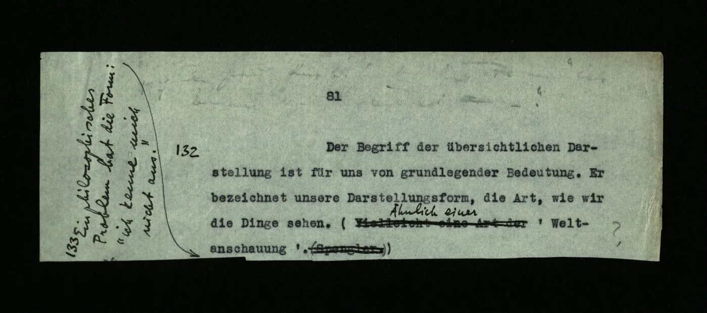 132 Der Begriff der übersichtlichen Darstellung ist für uns von grundlegender Bedeutung. Er bezeichnet unsere Darstellungsform, die Art, wie wir die Dinge sehen. (Ähnlich einer ‘Weltanschauung’.)