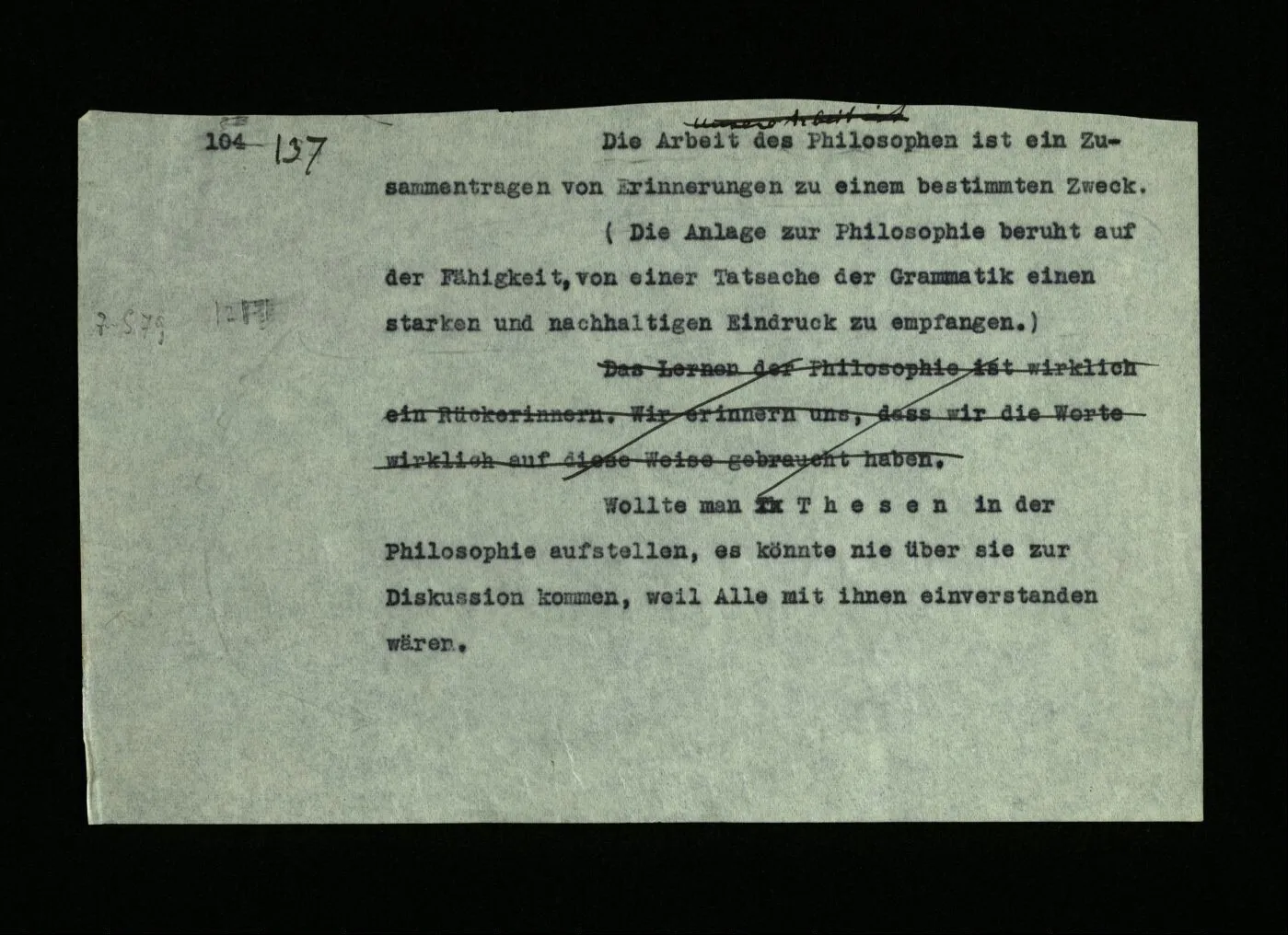137 Die Arbeit des Philosophen ist ein Zusammentragen von Erinnerungen zu einem bestimmten Zweck. (Die Anlage zur Philosophie beruht auf der Fähigkeit, von einer Tatsache der Grammatik einen starken und nachhaltigen Eindruck zu empfangen.)