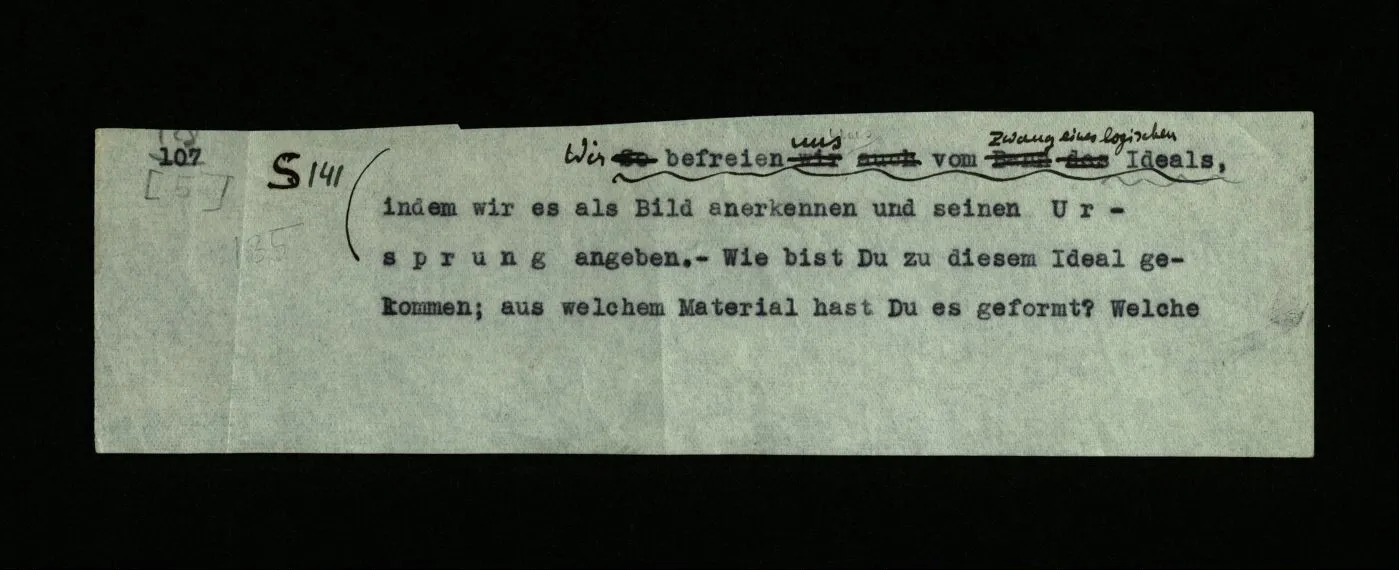 141 Wir befreien uns vom Zwang eines logischen Ideals, indem wir es als Bild anerkennen und seinen Ursprung angeben. – Wie bist Du zu diesem Ideal gekommen; aus welchem Material hast Du es geformt? Welche konkrete Vorstellung war sein eigentliches Urbild? Dies müssen wir uns fragen, sonst können wir seinen irreführenden Aspekt nicht los werden.