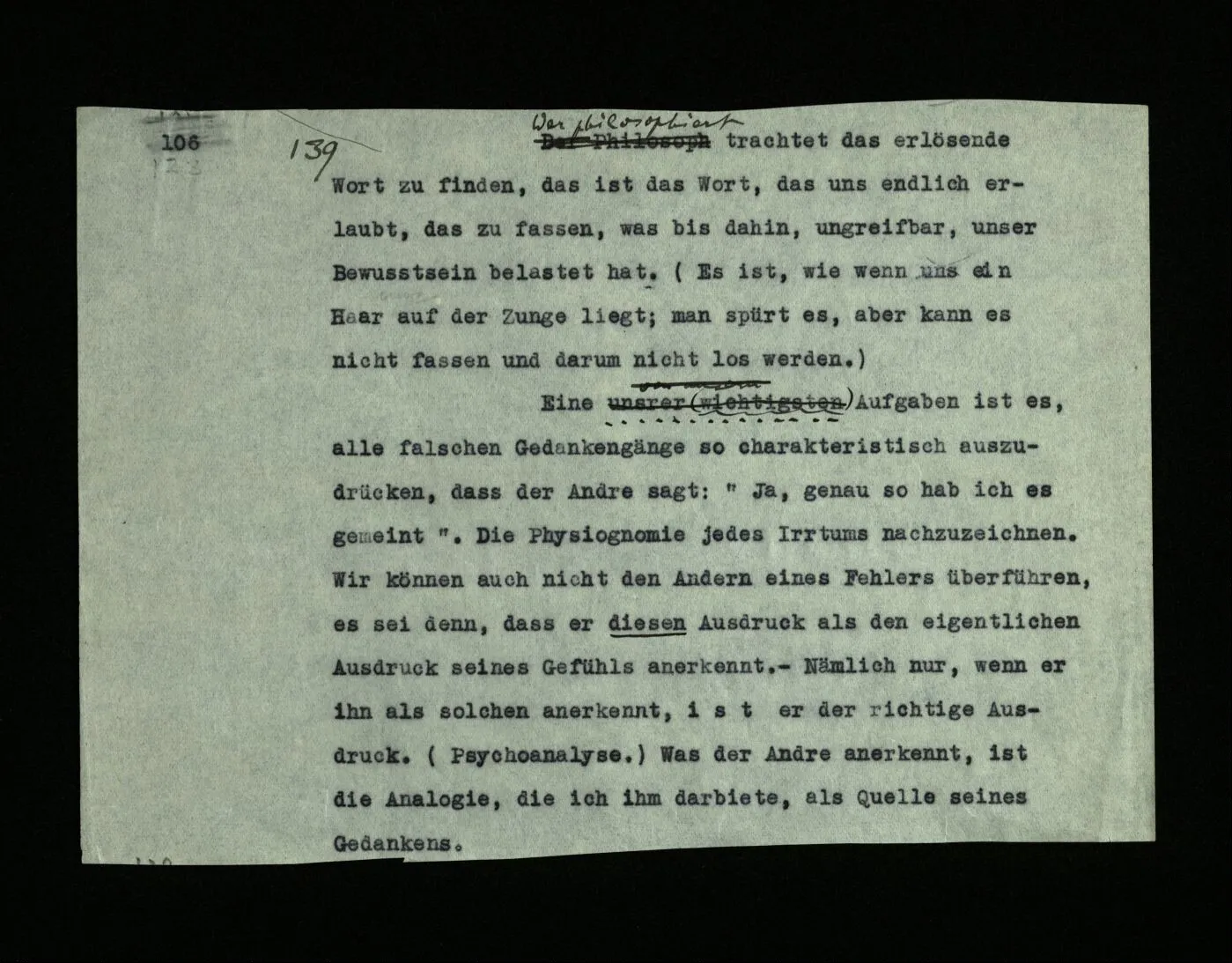 139 Wer philosophiert trachtet das erlösende Wort zu finden, das ist das Wort, das uns endlich erlaubt, das zu fassen, was bis dahin, ungreifbar, unser Bewußtsein belastet hat. (Es ist, wie wenn uns ein Haar auf der Zunge liegt; man spürt es, aber kann es nicht fassen und darum nicht loswerden.) Eine unsrer (wichtigsten) Aufgaben ist es, alle falschen Gedankengänge so charakteristisch auszudrücken, daß der Andre sagt: “Ja, genau so hab ich es gemeint”. Die Physiognomie jedes Irrtums nachzuzeichnen. Wir können auch nicht den Andern eines Fehlers überführen, es sei denn, daß er diesen Ausdruck als den eigentlichen Ausdruck seines Gefühls anerkennt. – Nämlich nur, wenn er ihn als solchen anerkennt, ist er der richtige Ausdruck. (Psychoanalyse.) Was der Andre anerkennt, ist die Analogie, die ich ihm darbiete, als Quelle seines Gedankens.
