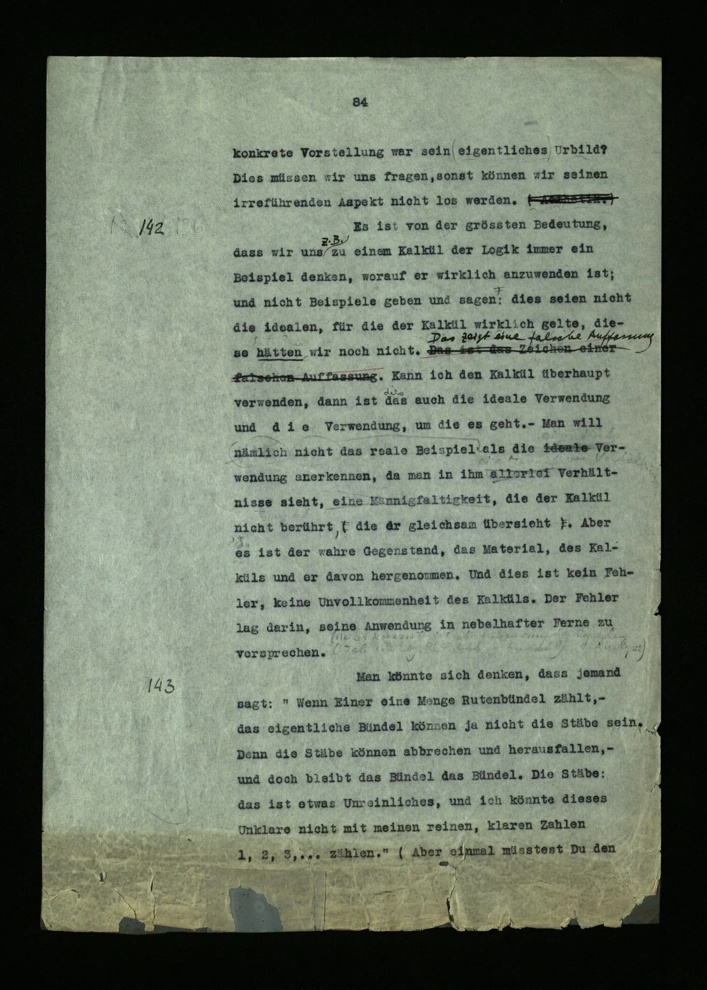 142 Es ist von der größten Bedeutung, daß wir uns z.B. zu einem Kalkül der Logik immer ein Beispiel denken, worauf er wirklich anzuwenden ist; und nicht Beispiele geben und sagen: dies seien nicht die idealen, für die der Kalkül wirklich gelte, diese hätten wir noch nicht. Das zeigt eine falsche Auffassung. Kann ich den Kalkül überhaupt verwenden, dann ist das auch die ideale Verwendung und die Verwendung, um die es geht. – Man will nämlich nicht das reale Beispiel als die Verwendung anerkennen, da man in ihm Verhältnisse sieht, eine Mannigfaltigkeit, die der Kalkül nicht berührt, die er gleichsam übersieht. Aber es ist der wahre Gegenstand, das Material, des Kalküls und er davon hergenommen. Und dies ist kein Fehler, keine Unvollkommenheit des Kalküls. Der Fehler lag darin, seine Anwendung in nebelhafter Ferne zu versprechen.