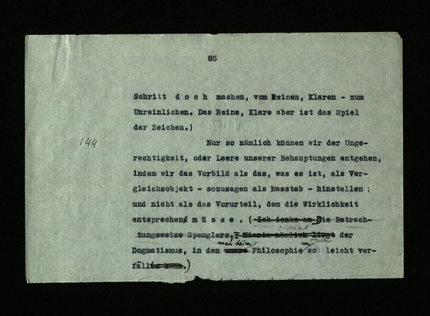 144 Nur so nämlich können wir der Ungerechtigkeit, oder Leere unserer Behauptungen entgehen, indem wir das Vorbild als das, was es ist, als Vergleichsobjekt – sozusagen als Maßstab – hinstellen; und nicht als das Vorurteil, dem die Wirklichkeit entsprechen müsse. (Die Betrachtungsweise Spenglers. Der Dogmatismus, in den man beim philosophieren so leicht verfällt).