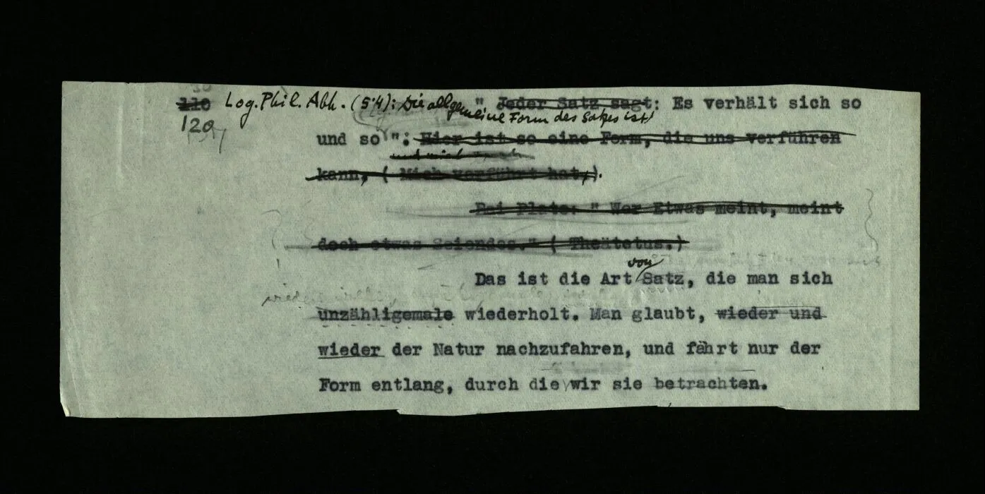 Log. phil. Abh. (5.4) “Die allgemeine Form des Satzes ist: Es verhält sich so und so”. Das ist die Art von Satz, die man sich unzähligemale wiederholt. Man glaubt, wieder der Natur nachzufahren, und fährt nur der Form entlang, durch die wir sie betrachten.