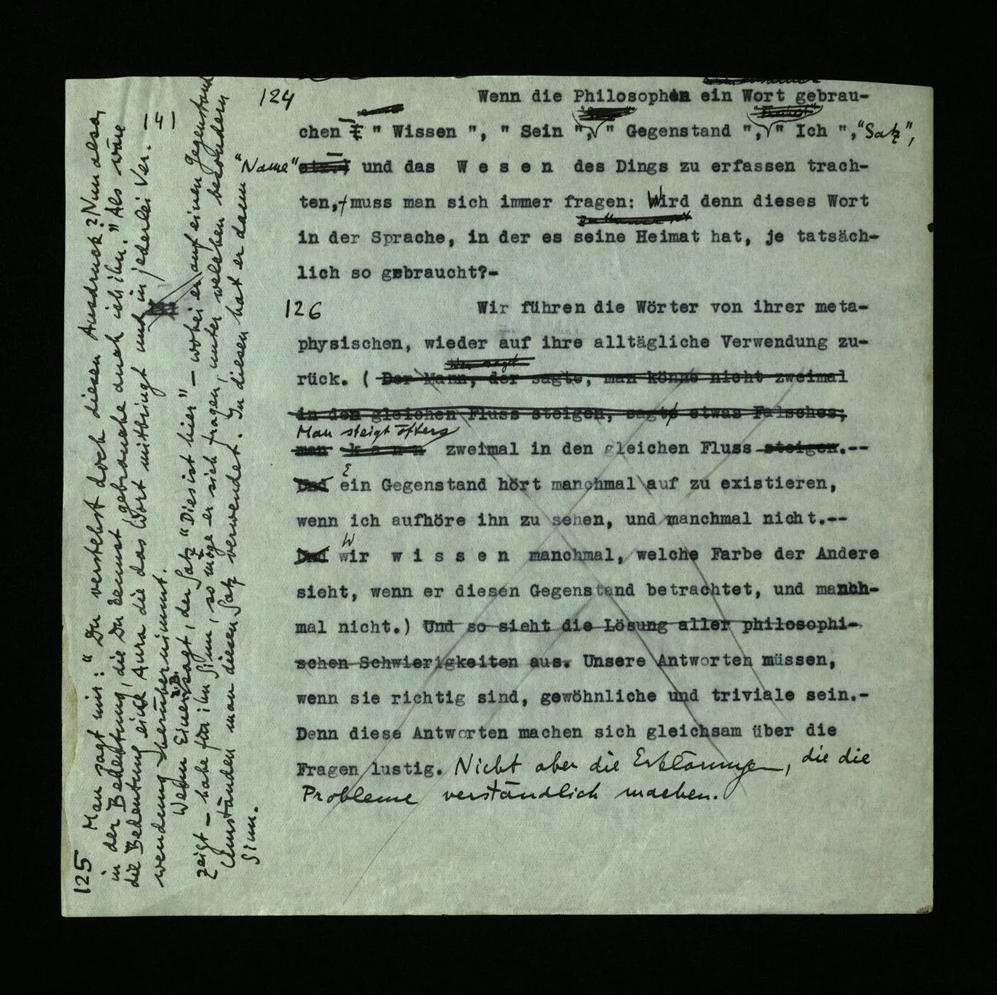 126 Wir führen die Wörter von ihrer metaphysischen, wieder auf ihre alltägliche Verwendung zurück. (Man steigt öfters zweimal in den gleichen Fluß . – – – Ein Gegenstand hört manchmal auf zu existieren, wenn ich aufhöre ihn zu sehen, und manchmal nicht. – – – Wir wissen manchmal, welche Farbe der Andere sieht, wenn er diesen Gegenstand betrachtet, und manchmal nicht.) Unsere Antworten müssen, wenn sie richtig sind, gewöhnliche und triviale sein. – Denn diese Antworten machen sich gleichsam über die Fragen lustig. Nicht aber die Erklärungen, die die Probleme verständlich machen.