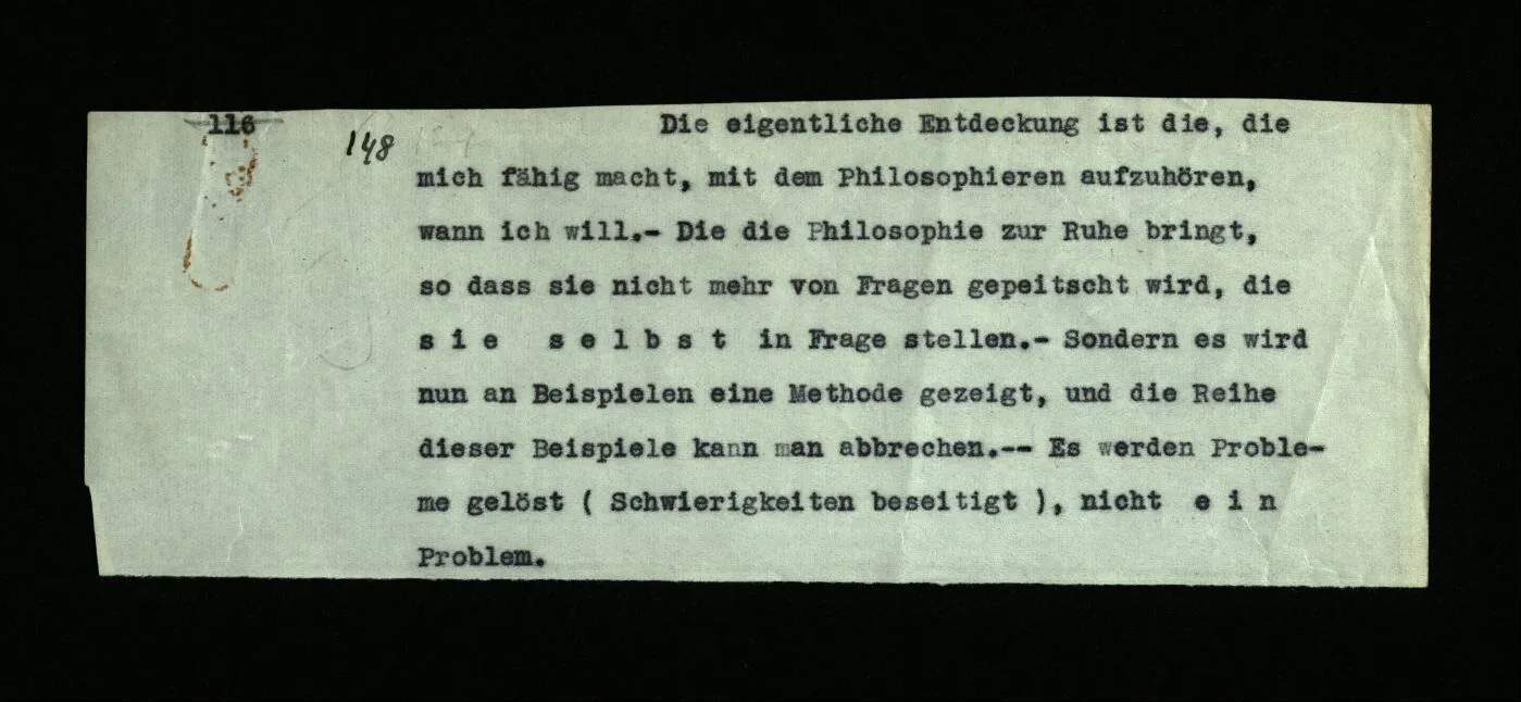 148 Die eigentliche Entdeckung ist die, die mich fähig macht, mit dem Philosophieren aufzuhören, wann ich will. – Die die Philosophie zur Ruhe bringt, so daß sie nicht mehr von Fragen gepeitscht wird, die sie selbst in Frage stellen. – Sondern es wird nur an Beispielen eine Methode gezeigt, und die Reihe dieser Beispiele kann man abbrechen. – – – Es werden Probleme gelöst (Schwierigkeiten beseitigt), nicht ein Problem.