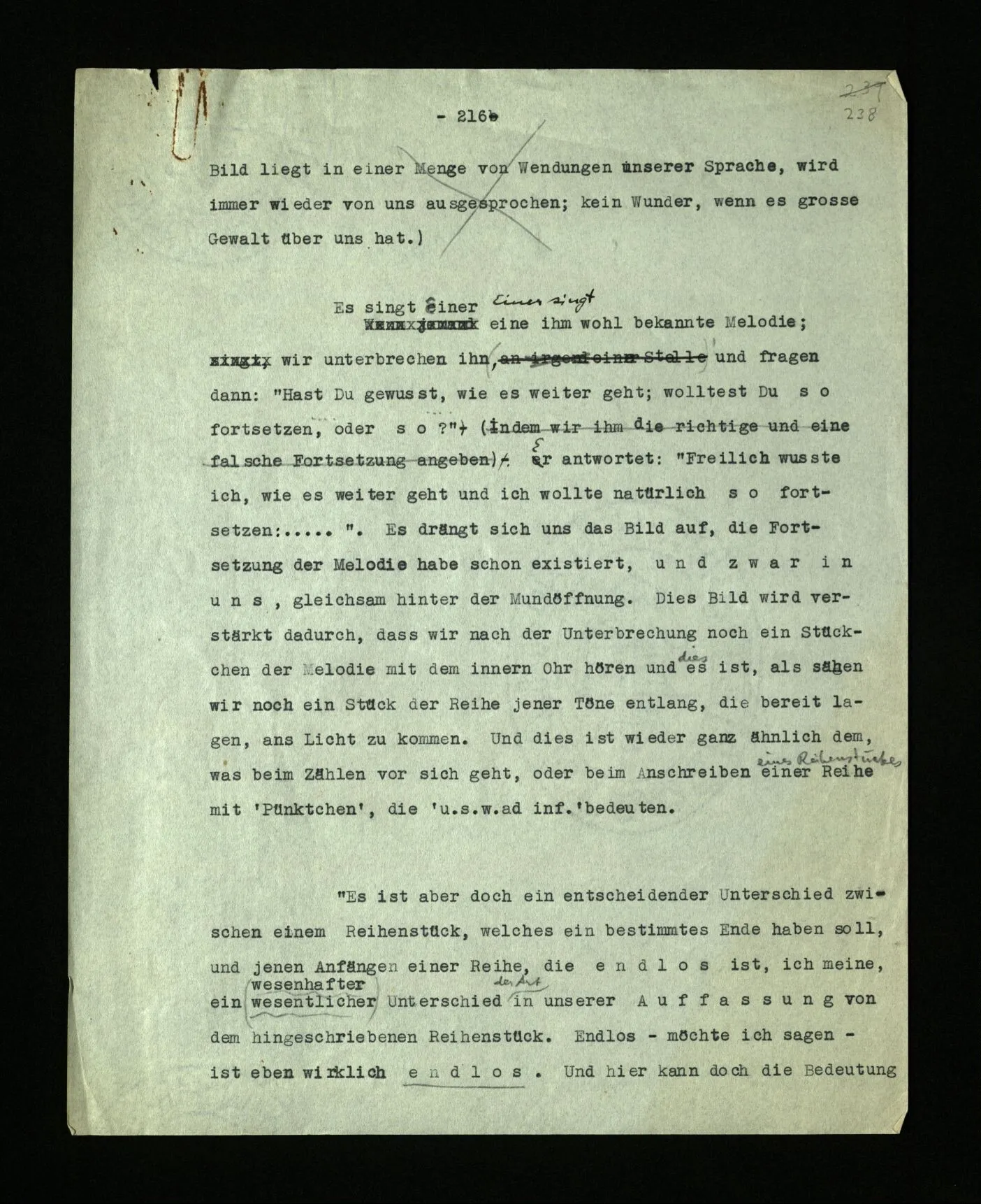 Es singt einer eine ihm wohl bekannte Melodie; wir unterbrechen ihn, und fragen dann: “Hast Du gewußt, wie es weiter geht; wolltest Du so fortsetzen, oder so?” Er antwortet: “Freilich wußte ich, wie es weiter geht und ich wollte natürlich so fortsetzen:…”. Es drängt sich uns das Bild auf, die Fortsetzungen der Melodie habe schon existiert, und zwar in uns, gleichsam hinter der Mundöffnung. Dies Bild wird verstärkt dadurch, daß wir nach der Unterbrechung noch ein Stückchen der Melodie mit dem innern Ohr hören und es ist, als sähen wir noch ein Stück der Reihe jener Töne entlang, die bereit lagen, ans Licht zu kommen. Und dies ist wieder ganz ähnlich dem, was beim Zählen vor sich geht, oder beim Anschreiben einer Reihe mit ‘Pünktchen’, die ‘u.s.w. ad inf.’ bedeuten.