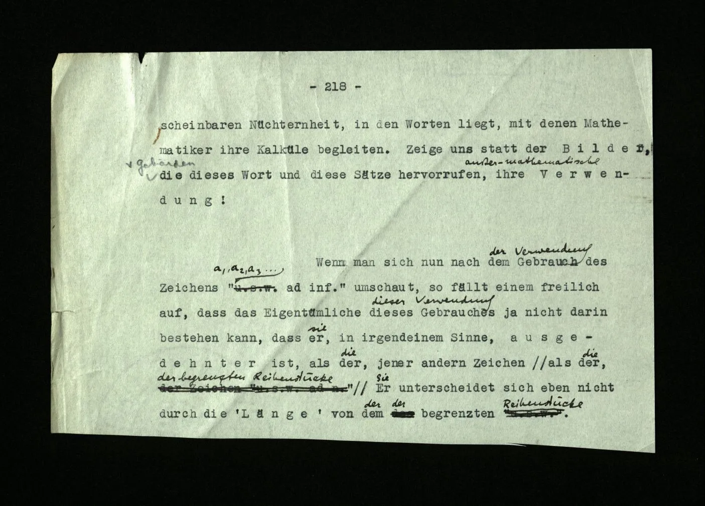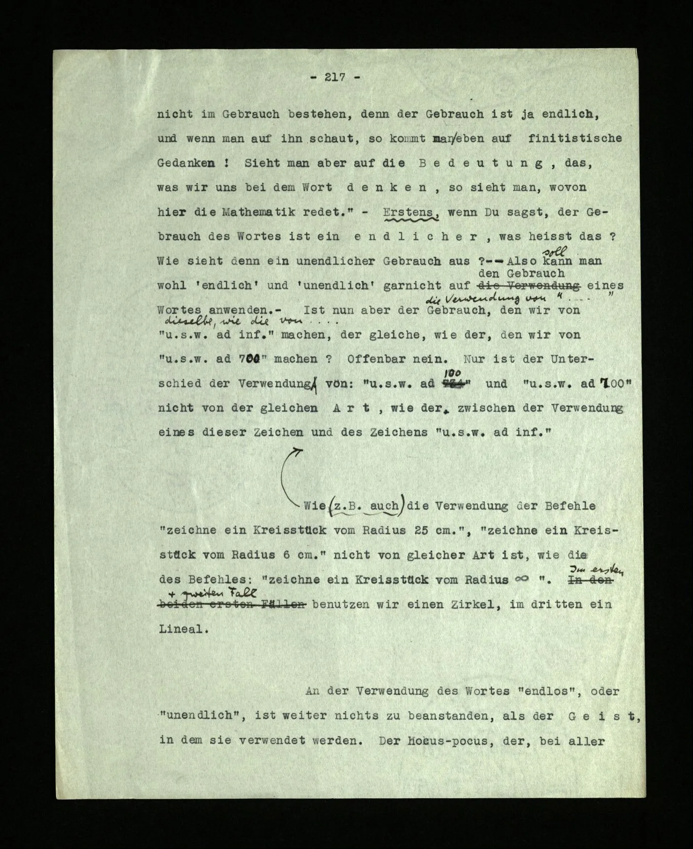 “Es ist aber doch ein entscheidender Unterschied zwischen einem Reihenstück, welches ein bestimmtes Ende haben soll, und jenen Anfängen einer Reihe, die endlos ist, ich meine, ein (wesentlicher) Unterschied der Art in unserer Auffassung von dem hingeschriebenen Reihenstück. Endlos – möchte ich sagen – ist eben wirklich endlos. Und hier kann doch die Bedeutung nicht im Gebrauch bestehen, denn der Gebrauch ist ja endlich, und wenn man auf ihn schaut, so kommt man eben auf finitistische Gedanken! Sieht man aber auf die Bedeutung, das, was wir uns bei dem Wort denken, so sieht man, wovon hier die Mathematik redet.“ – Erstens, wenn Du sagst, der Gebrauch des Wortes ist ein endlicher, was heißt das? Wie sieht denn ein unendlicher Gebrauch aus? ‒ ‒ Also kann man wohl ‘endlich’ und ‘unendlich’ garnicht auf den Gebrauch eines Wortes anwenden. – Ist nun aber der Gebrauch, den wir von “u.s.w. ad inf.” machen, der gleiche, wie der, den wir von “u.s.w. ad 700” machen? Offenbar nein. Nur ist der Unterschied der Verwendung von: “u.s.w. ad 100” und “u.s.w. ad 700” nicht von der gleichen Art, wie der zwischen der Verwendung eines dieser Zeichen und des Zeichens “u.s.w. ad inf.”