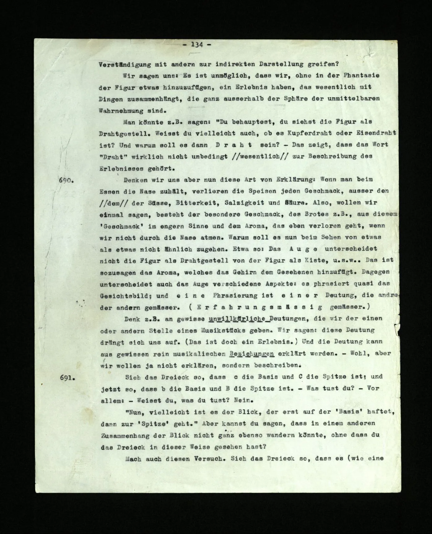 690. Denken wir uns aber nun diese Art von Erklärung: Wenn man beim Essen die Nase zuhält, verlieren die Speisen jeden Geschmack, außer den der Süße, Bitterkeit, Salzigkeit und Säure. Also, wollen wir einmal sagen, besteht der besondere Geschmack, des Brotes z.B., aus diesem ‘Geschmack’ im engern Sinne und dem Aroma, das eben verloren geht, wenn wir nicht durch die Nase atmen. Warum soll es nun beim Sehen von etwas als etwas nicht ähnlich zugehen. Etwa so: Das Auge unterscheidet nicht die Figur als Drahtgestell von der Figur als Kiste, u.s.w.. Das ist sozusagen das Aroma, welches das Gehirn dem Gesehenen hinzufügt. Dagegen unterscheidet auch das Auge verschiedene Aspekte: es phrasiert quasi das Gesichtsbild; und eine Phrasierung ist einer Deutung, die andre der andern gemäßer. (Erfahrungsmäßig gemäßer.) Denk z.B. an gewisse unwillkürliche Deutungen, die wir der einen oder andern Stelle eines Musikstücks geben. Wir sagen: diese Deutung drängt sich uns auf. (Das ist doch ein Erlebnis.) Und die Deutung kann aus gewissen rein musikalischen Beziehungen erklärt werden. – Wohl, aber wir wollen ja nicht erklären, sondern beschreiben.