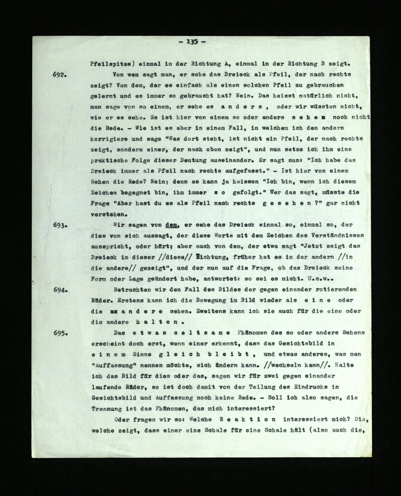 693. Wir sagen von dem, er sehe das Dreieck einmal so, einmal so, der dies von sich aussagt, der diese Worte mit dem Zeichen des Verständnisses ausspricht, oder hört; aber auch von dem, der etwa sagt “Jetzt zeigt das Dreieck in dieser Richtung, früher hat es in der andern gezeigt”, und der nun auf die Frage, ob das Dreieck seine Form oder Lage geändert habe, antwortet: so sei es nicht. U.s.w..