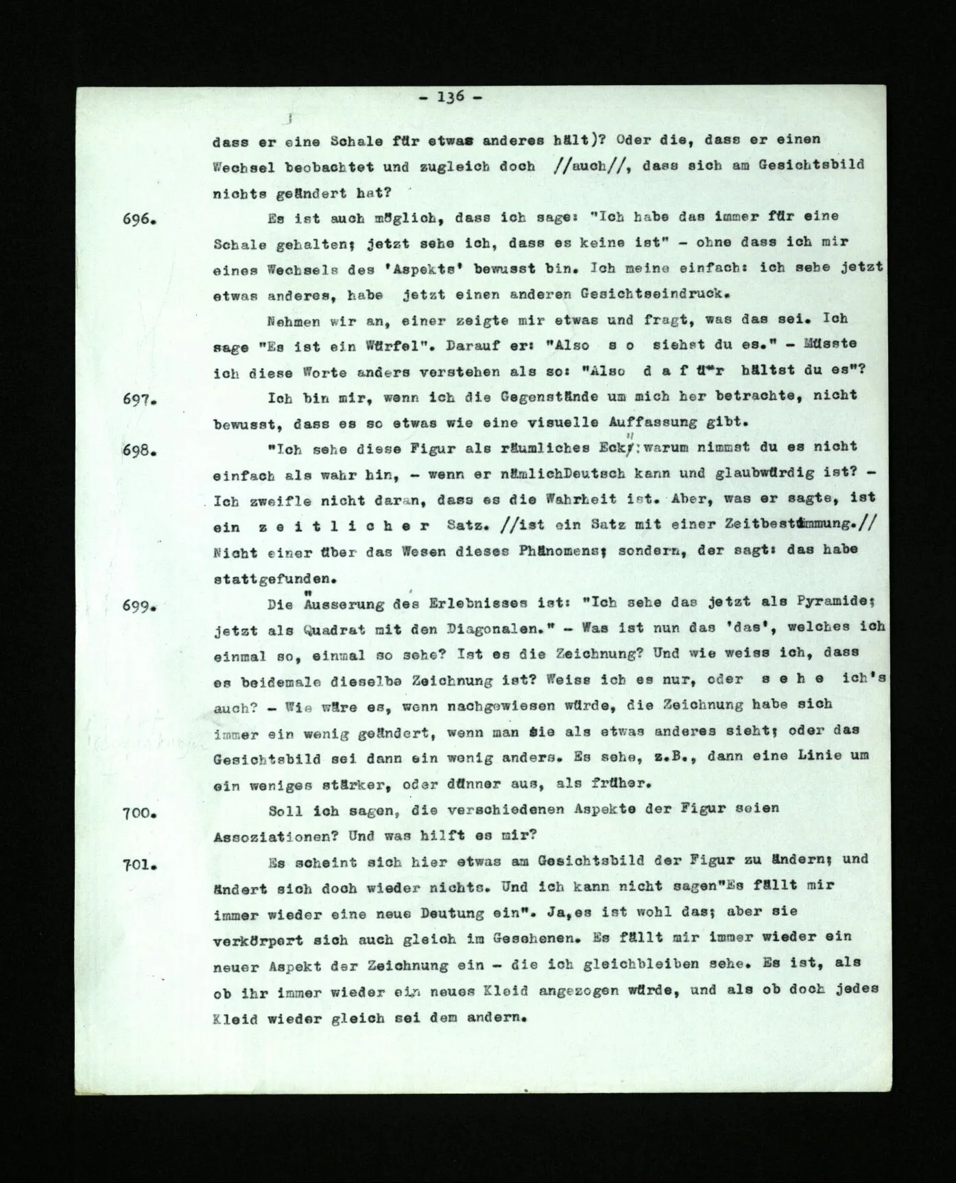 696. Es ist auch möglich, daß ich sage: “Ich habe das immer für eine Schale gehalten; jetzt sehe ich, daß es keine ist” – ohne daß ich mir eines Wechsels des ‘Aspekts’ bewußt bin. Ich meine einfach: ich sehe jetzt etwas anderes, habe jetzt einen anderen Gesichtseindruck. Nehmen wir an, einer zeigte mir etwas und fragt, was das sei. Ich sage “Es ist ein Würfel”. Darauf er: “Also so siehst du es.” – Müßte ich diese Worte anders verstehen als so: “Also dafür hältst du es”?