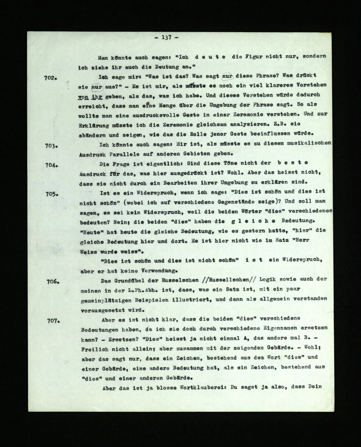 702. Ich sage mir: Was ist das? Was sagt nur diese Phrase? Was drückt sie nur aus?”– Es ist mir, als müßte es noch ein viel klareres Verstehen von ihr geben, als das, was ich habe. Und dieses Verstehen würde dadurch erreicht, daß man eine Menge über die Umgebung der Phrase sagt. So als wollte man eine ausdrucksvolle Geste in einer Zeremonie verstehen. Und zur Erklärung müßte ich die Zeremonie gleichsam analysieren. Z.B. sie abändern und zeigen, wie das die Rolle jener Geste beeinflussen würde.