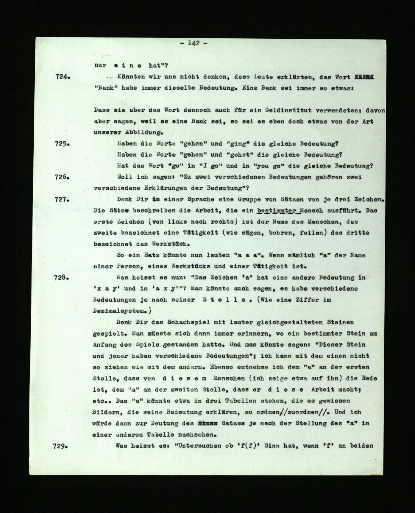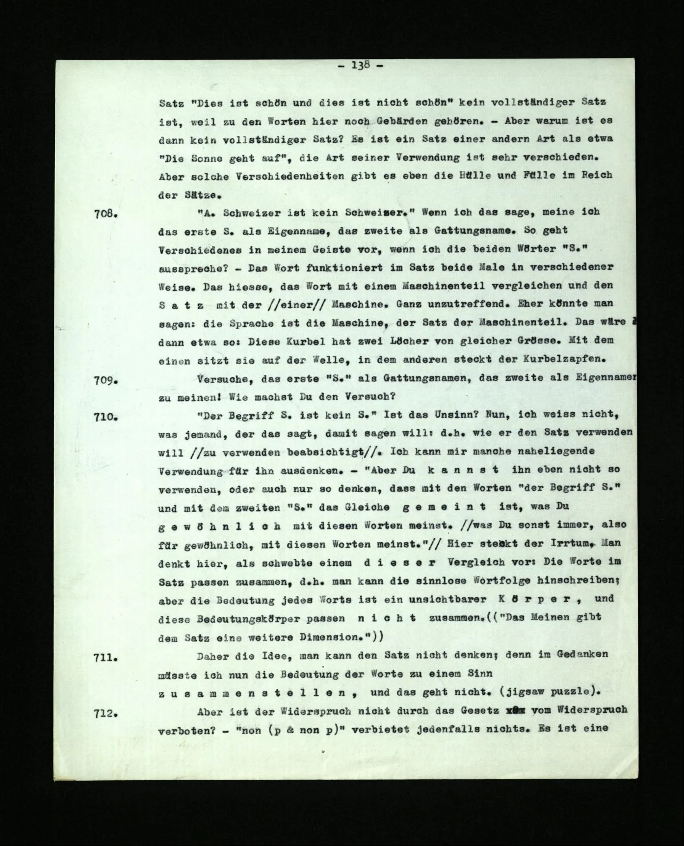 710. “Der Begriff S. ist kein S.”. Ist das Unsinn? Nun, ich weiß nicht, was jemand, der das sagt, damit sagen will: d.h. wie er den Satz verwenden will. Ich kann mir manche naheliegende Verwendung für ihn ausdenken. – “Aber Du kannst ihn eben nicht so verwenden, oder auch nur so denken, daß mit den Worten “der Begriff S.” und mit dem zweiten “S.” das Gleiche gemeint ist, was Du gewöhnlich mit diesen Worten meinst. Hier steckt der Irrtum. Man denkt hier, als schwebte einem dieser Vergleich vor: Die Worte im Satz passen zusammen, d.h. man kann die sinnlose Wortfolge hinschreiben; aber die Bedeutung jedes Worts ist ein unsichtbarer Körper, und diese Bedeutungskörper passen nicht zusammen. ((“Das Meinen gibt dem Satz eine weitere Dimension.”))