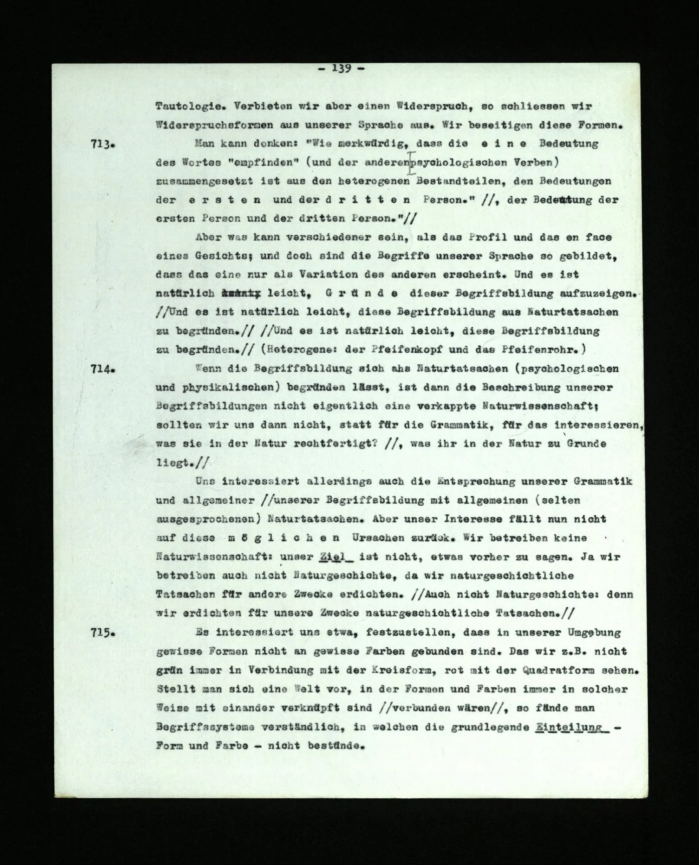 713. Man kann denken: “Wie merkwürdig, daß die eine Bedeutung des Wortes “empfinden” (und der anderen psychologischen Verben) zusammengesetzt ist aus den heterogenen Bestandteilen, den Bedeutungen der ersten und der dritten Person.” Aber was kann verschiedener sein, als das Profil und das en face eines Gesichts; und doch sind die Begriffe unserer Sprache so gebildet, daß das eine nur als Variation des anderen erscheint. Und es ist natürlich leicht, Gründe dieser Begriffsbildung aufzuzeigen. (Heterogene: der Pfeifenkopf und das Pfeifenrohr.)