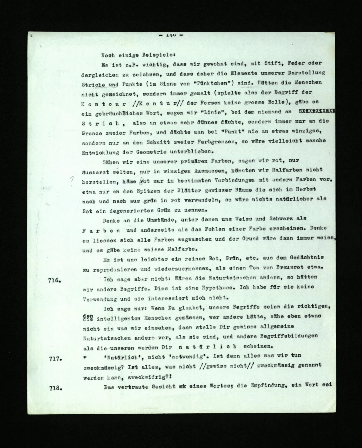 716. Ich sage aber nicht: Wären die Naturtatsachen anders, so hätten wir andere Begriffe. Dies ist eine Hypothese. Ich habe für sie keine Verwendung und sie interessiert mich nicht. Ich sage nur: Wenn Du glaubst, unsere Begriffe seien die richtigen, die intelligenten Menschen gemäßen, wer andere hätte, sähe eben etwas nicht ein was wir einsehen, dann stelle Dir gewisse allgemeine Naturtatsachen anders vor, als sie sind, und andere Begriffsbildungen als die unseren werden Dir natürlich scheinen