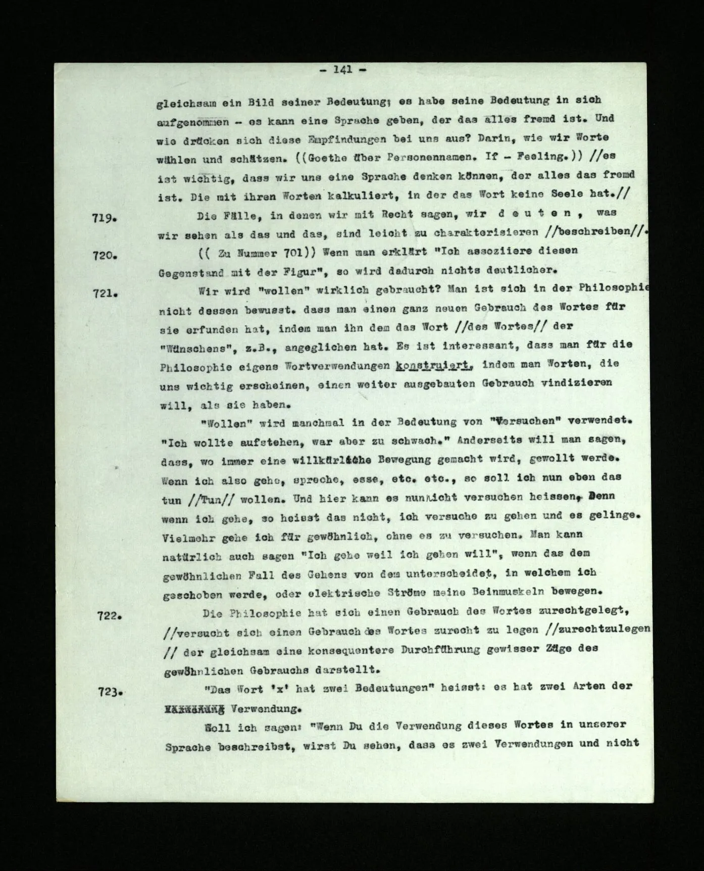 721. Wie wird “wollen” wirklich gebraucht? Man ist sich in der Philosophie nicht dessen bewußt, daß man einen ganz neuen Gebrauch des Wortes für sie erfunden hat, indem man ihn dem des “Wünschens”, z.B., angeglichen hat. Es ist interessant, daß man für die Philosophie eigens Wortverwendungen konstruiert, indem man Worten, die uns wichtig erscheinen, einen weiter ausgebauten Gebrauch vindizieren will, als sie haben. “Wollen” wird manchmal in der Bedeutung von “Versuchen” verwendet. “Ich wollte aufstehen, war aber zu schwach.” Anderseits will man sagen, daß, wo immer eine willkürliche Bewegung gemacht wird, gewollt werde. Wenn ich also gehe, spreche, esse, etc. etc., so soll ich nun eben das tun wollen. Und hier kann es nun nicht versuchen heißen. Denn wenn ich gehe, so heißt das nicht, ich versuche zu gehen und es gelingen. Vielmehr gehe ich für gewöhnlich, ohne es zu versuchen. Man kann natürlich auch sagen “Ich gehe weil das gehen will”, wenn das dem gewöhnlichen Fall des Gehens von dem unterscheidet, in welchem ich geschoben werde, oder elektrische Ströme meine Beinmuskeln bewegen.