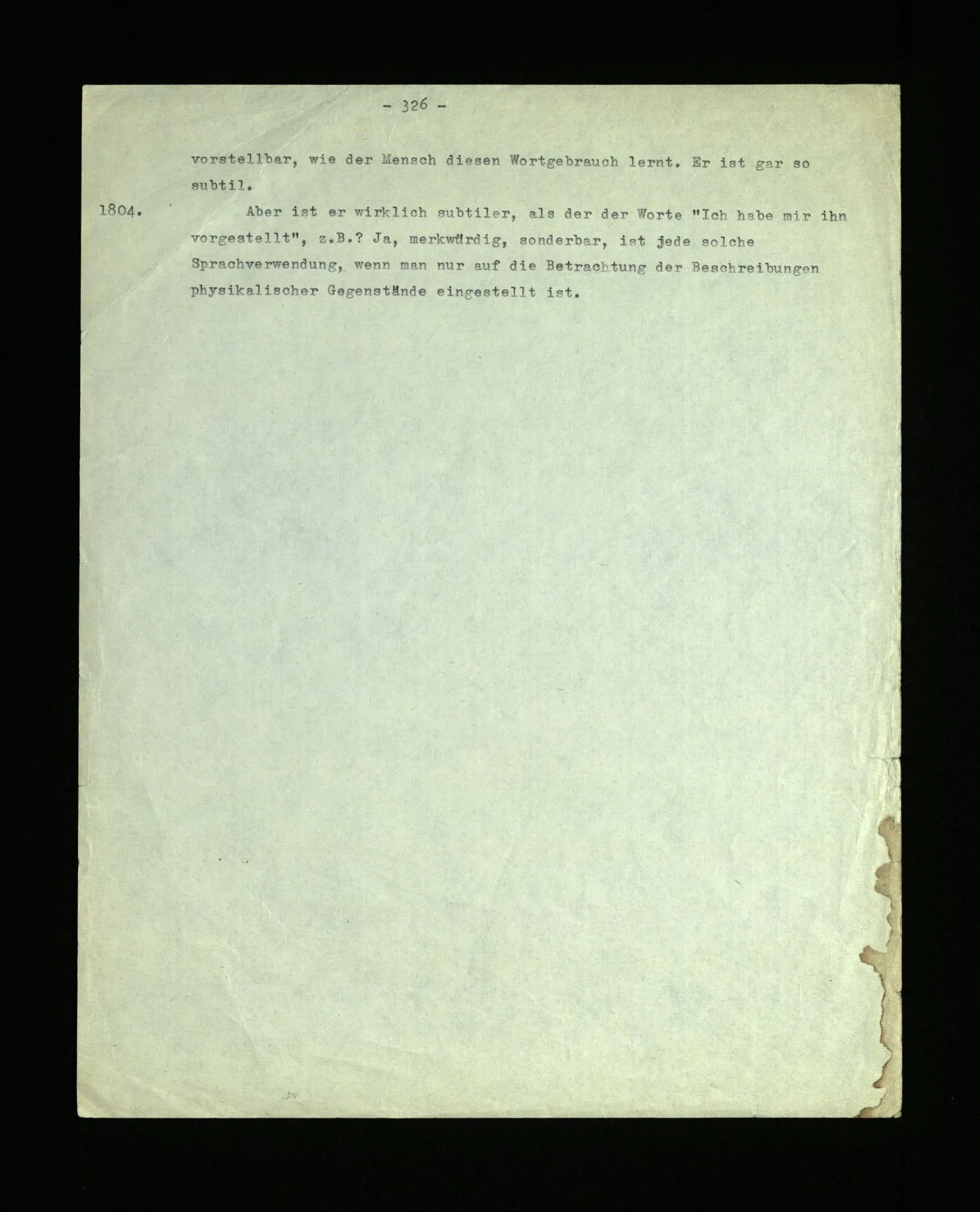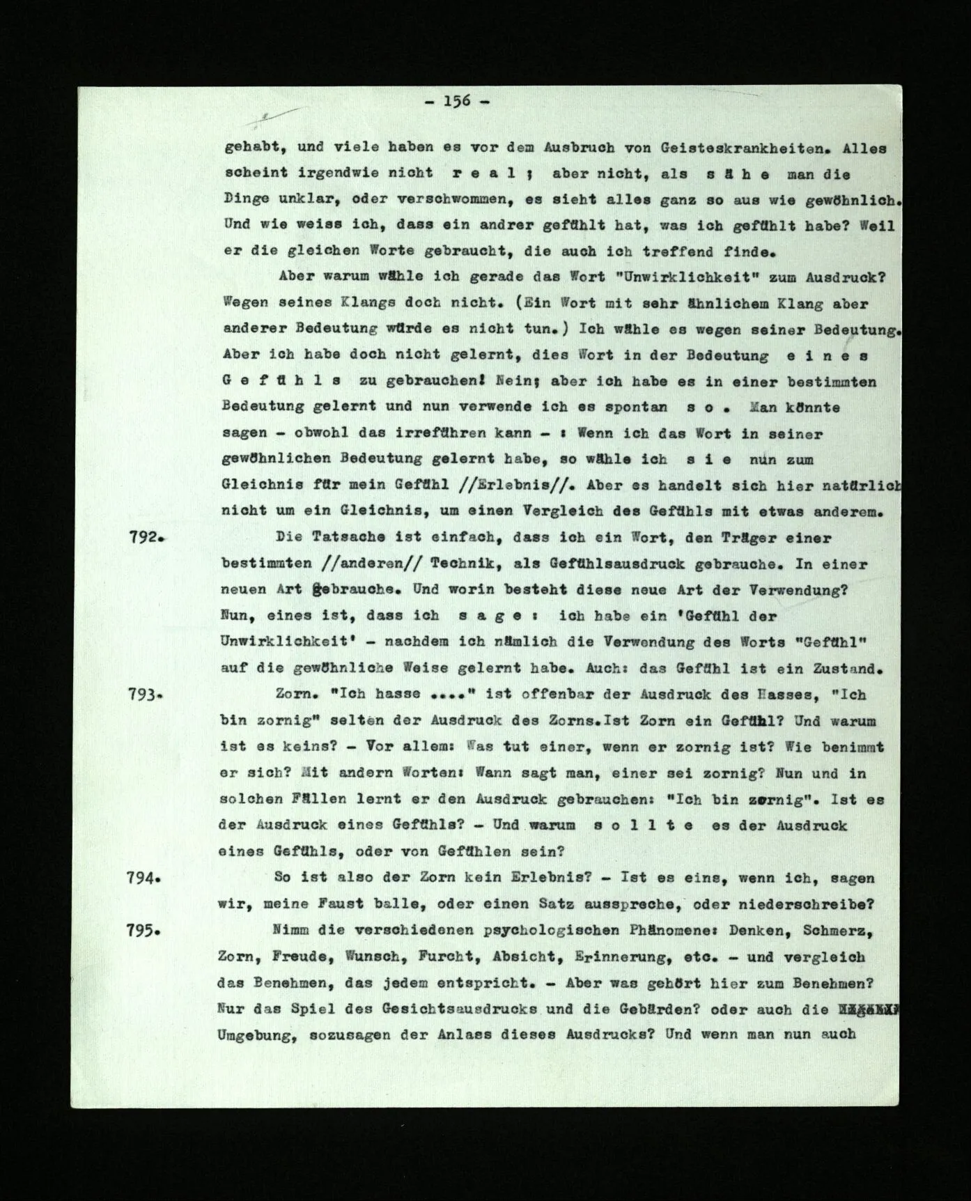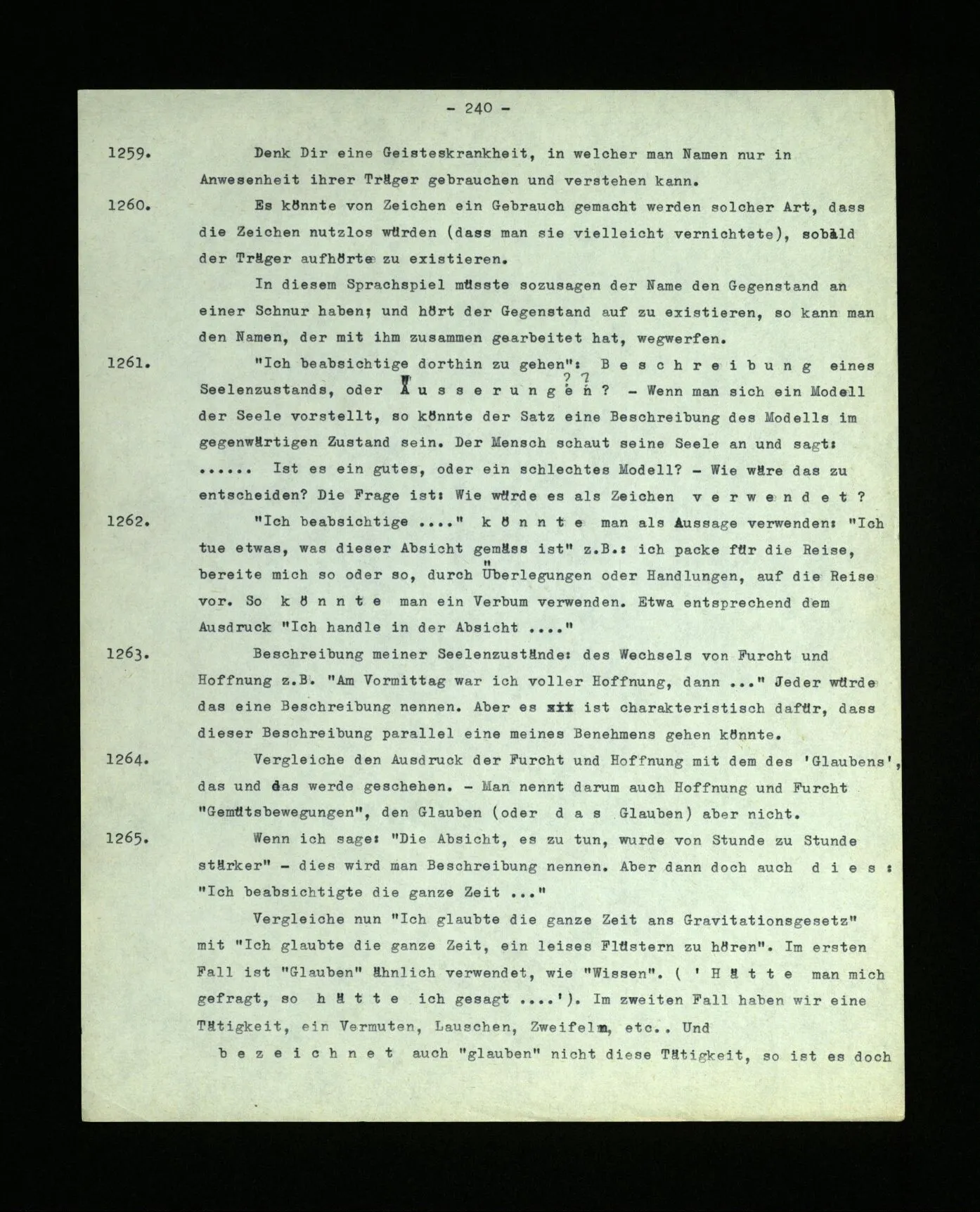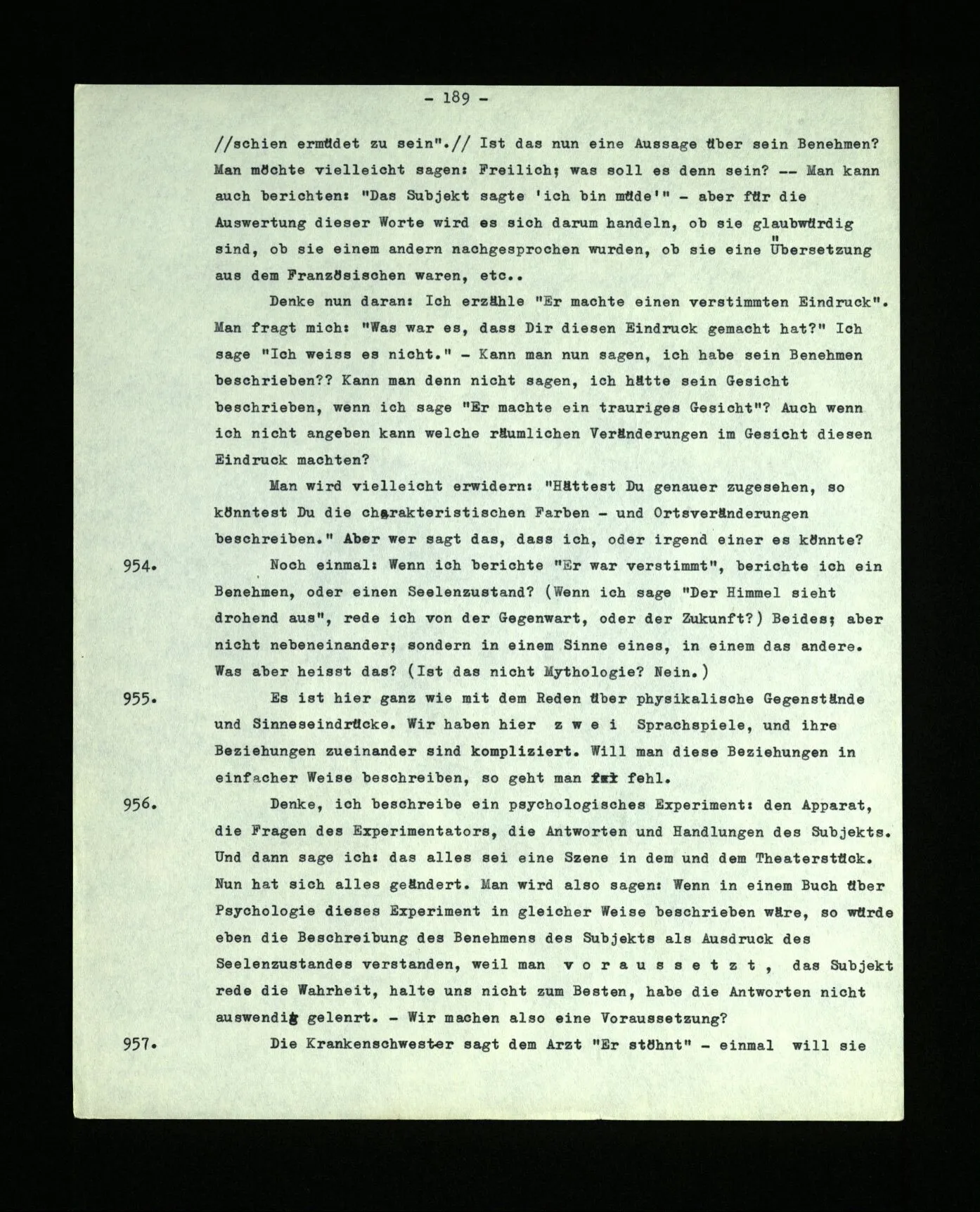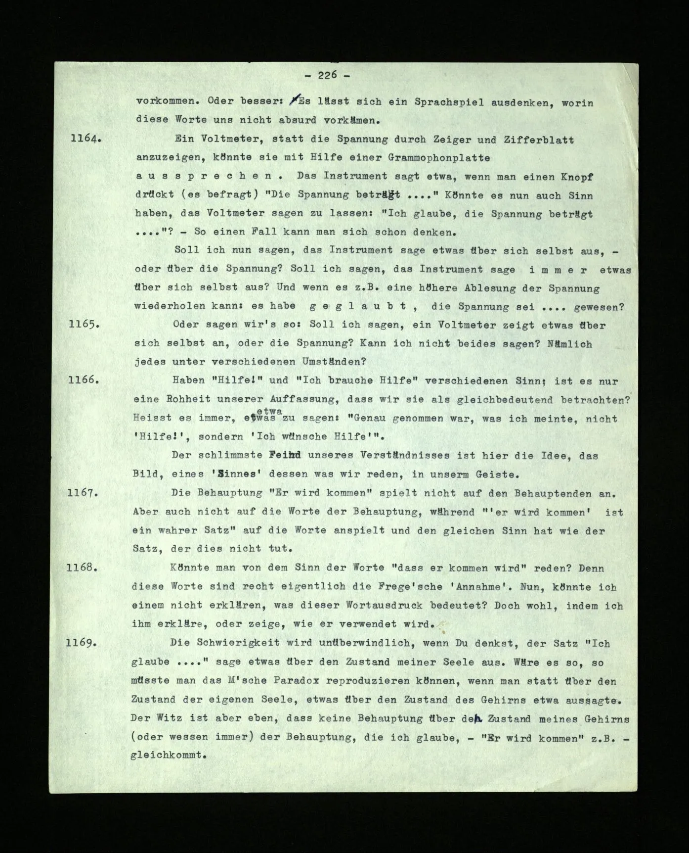 1803. Ist es aber nicht sonderbar, daß es so eine Reaktion so ein Geständnis der Intention gibt? Ist es nicht ein höchst merkwürdiges Sprachinstrument? Was ist eigentlich merkwürdig daran? Nun, – es ist schwer vorstellbar, wie der Mensch diesen Wortgebrauch lernt. Es ist gar so subtil.