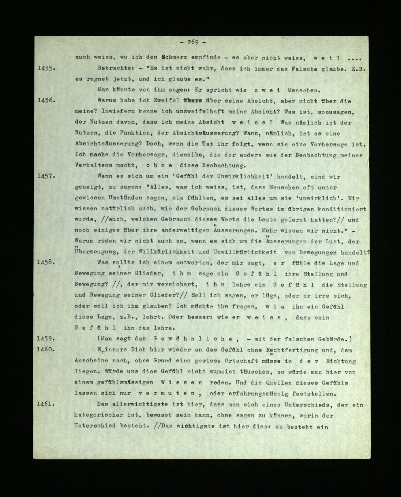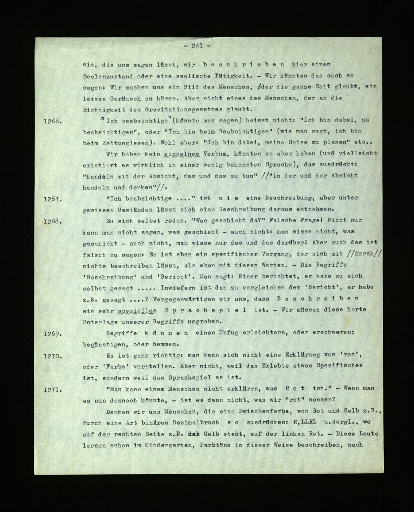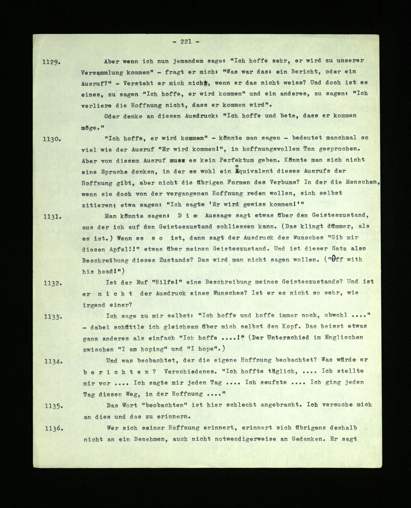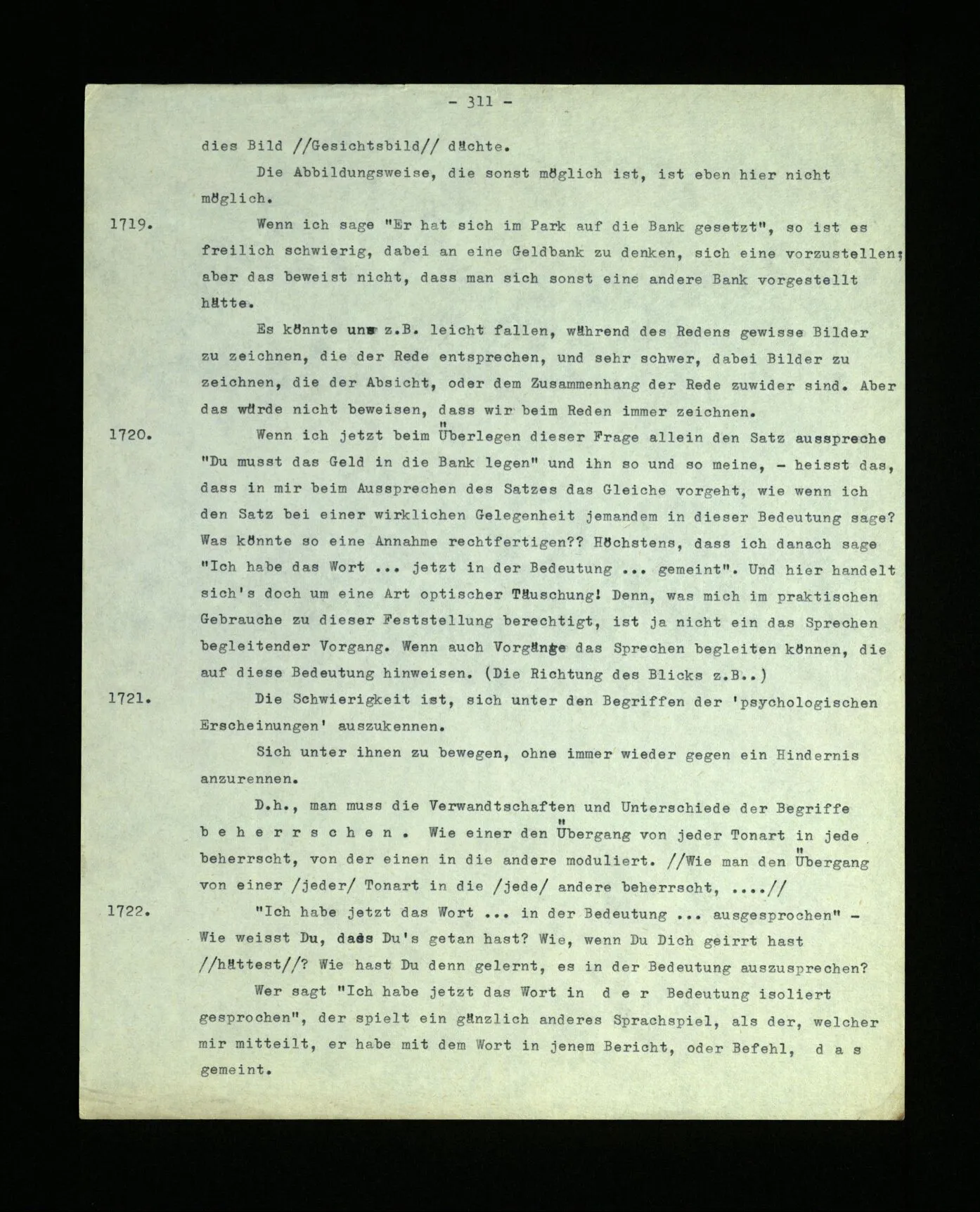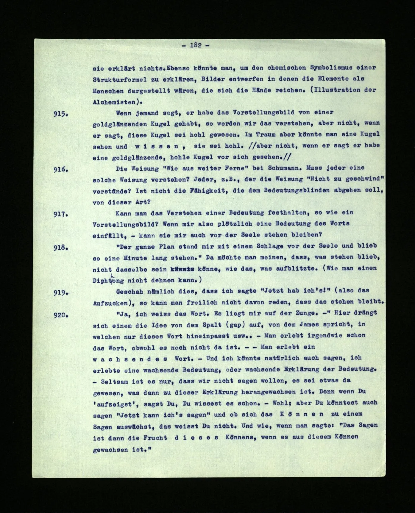 1803. Ist es aber nicht sonderbar, daß es so eine Reaktion so ein Geständnis der Intention gibt? Ist es nicht ein höchst merkwürdiges Sprachinstrument? Was ist eigentlich merkwürdig daran? Nun, – es ist schwer vorstellbar, wie der Mensch diesen Wortgebrauch lernt. Es ist gar so subtil.