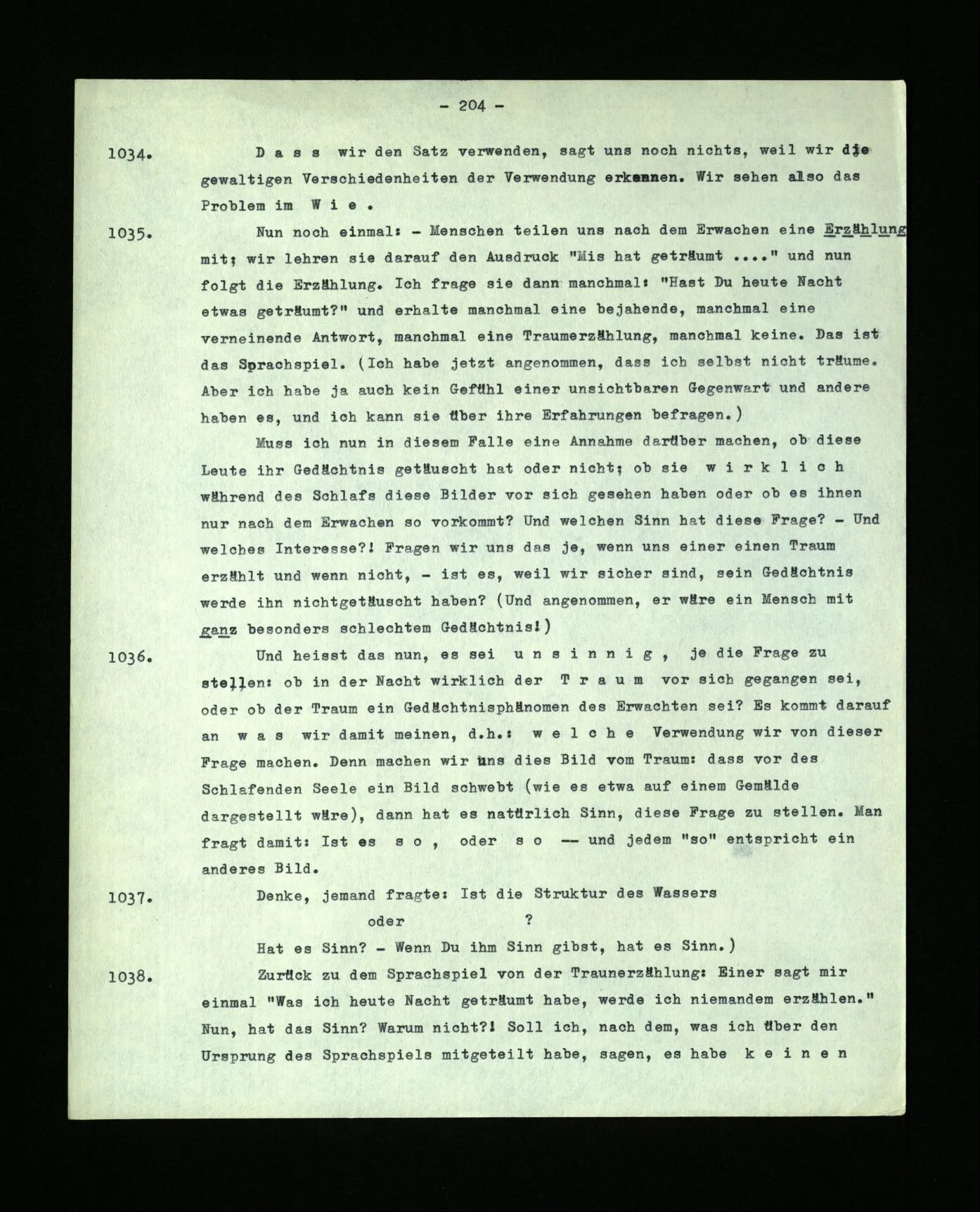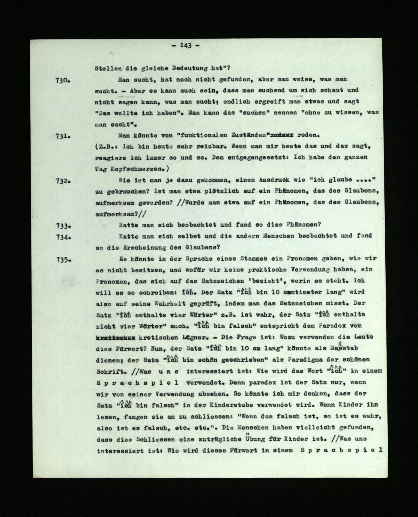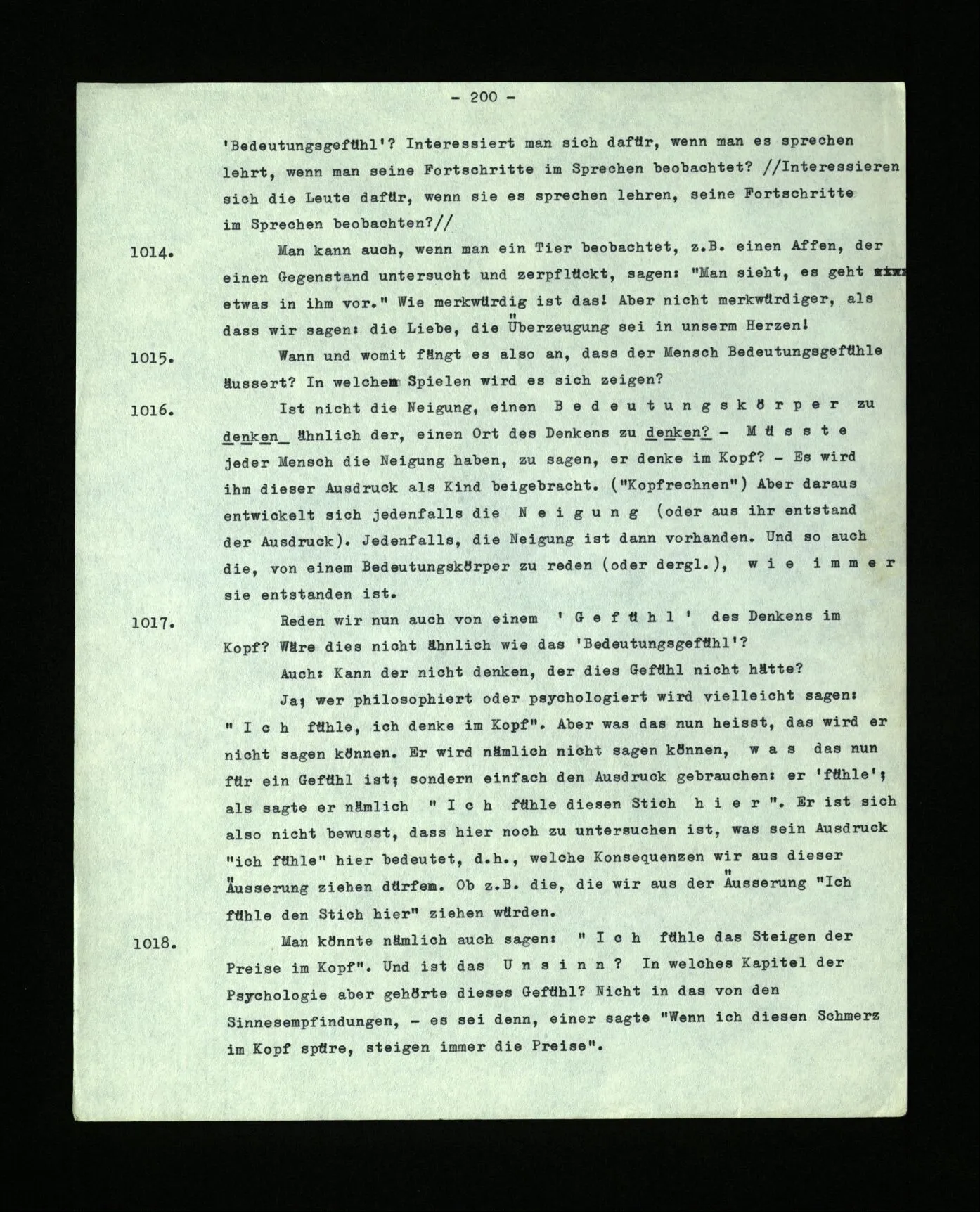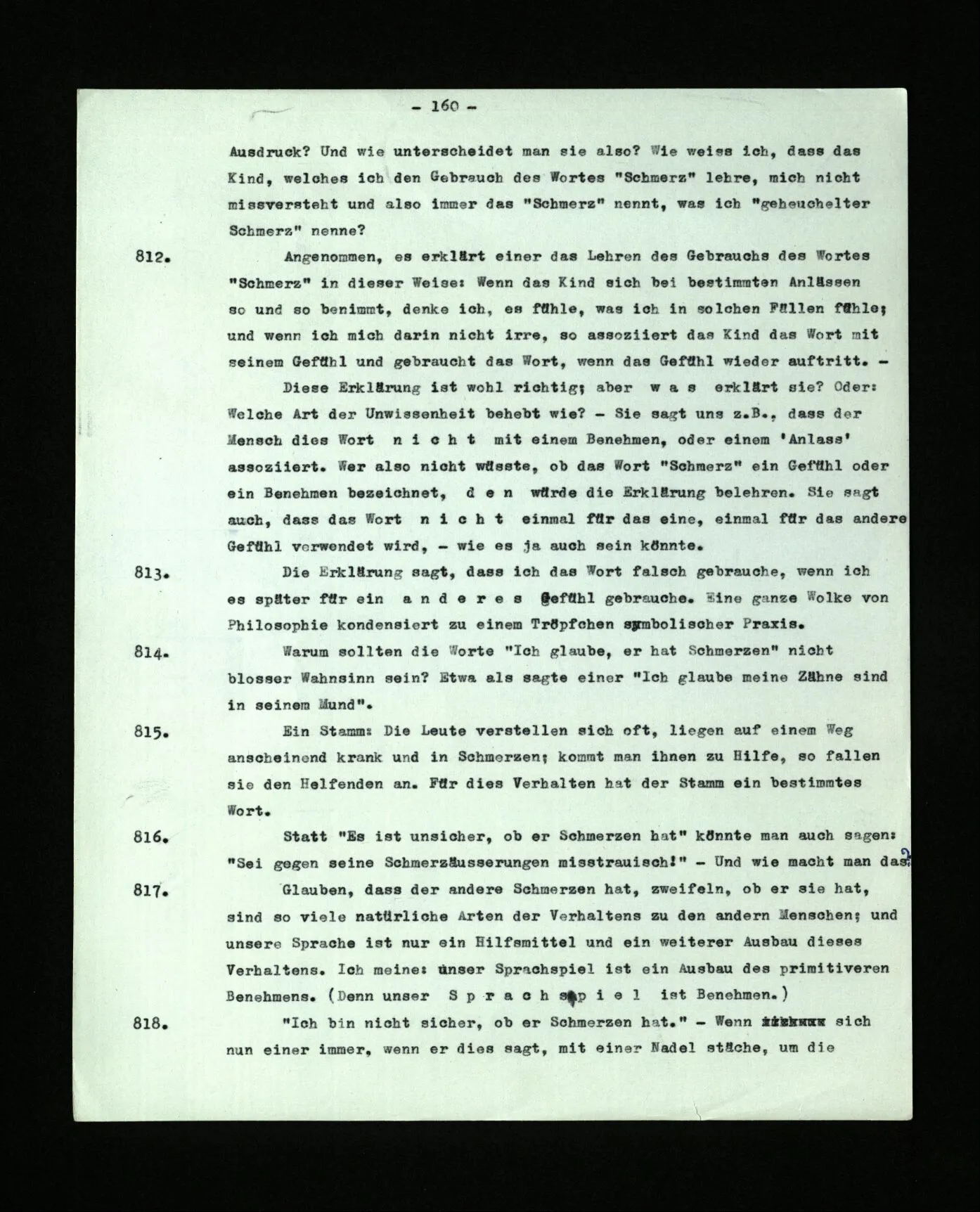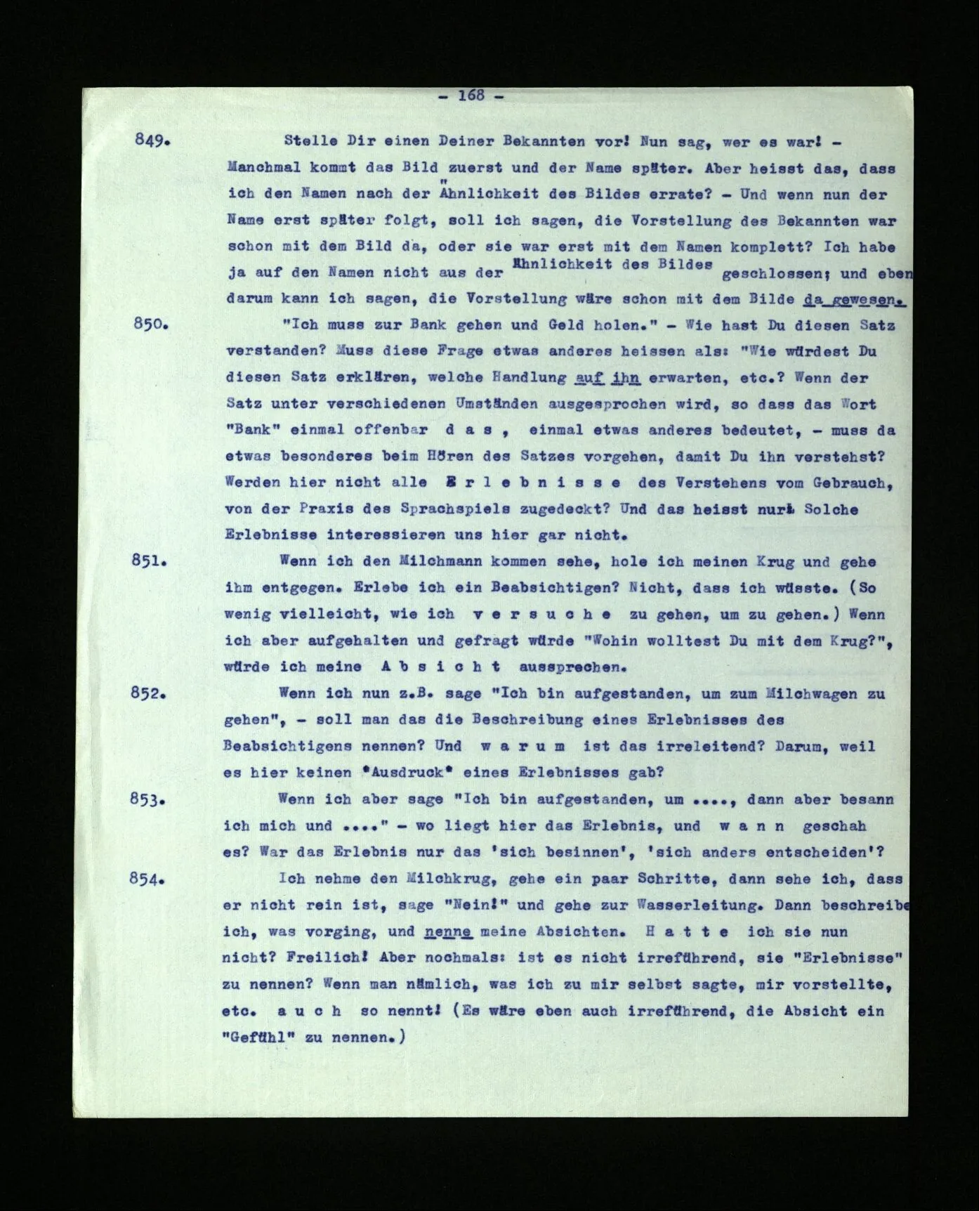 1803. Ist es aber nicht sonderbar, daß es so eine Reaktion so ein Geständnis der Intention gibt? Ist es nicht ein höchst merkwürdiges Sprachinstrument? Was ist eigentlich merkwürdig daran? Nun, – es ist schwer vorstellbar, wie der Mensch diesen Wortgebrauch lernt. Es ist gar so subtil.