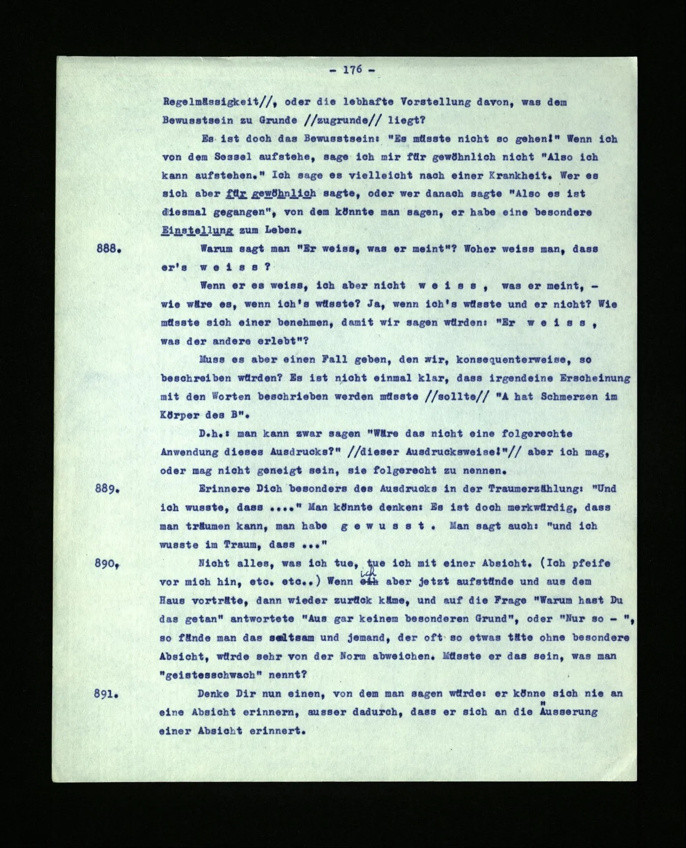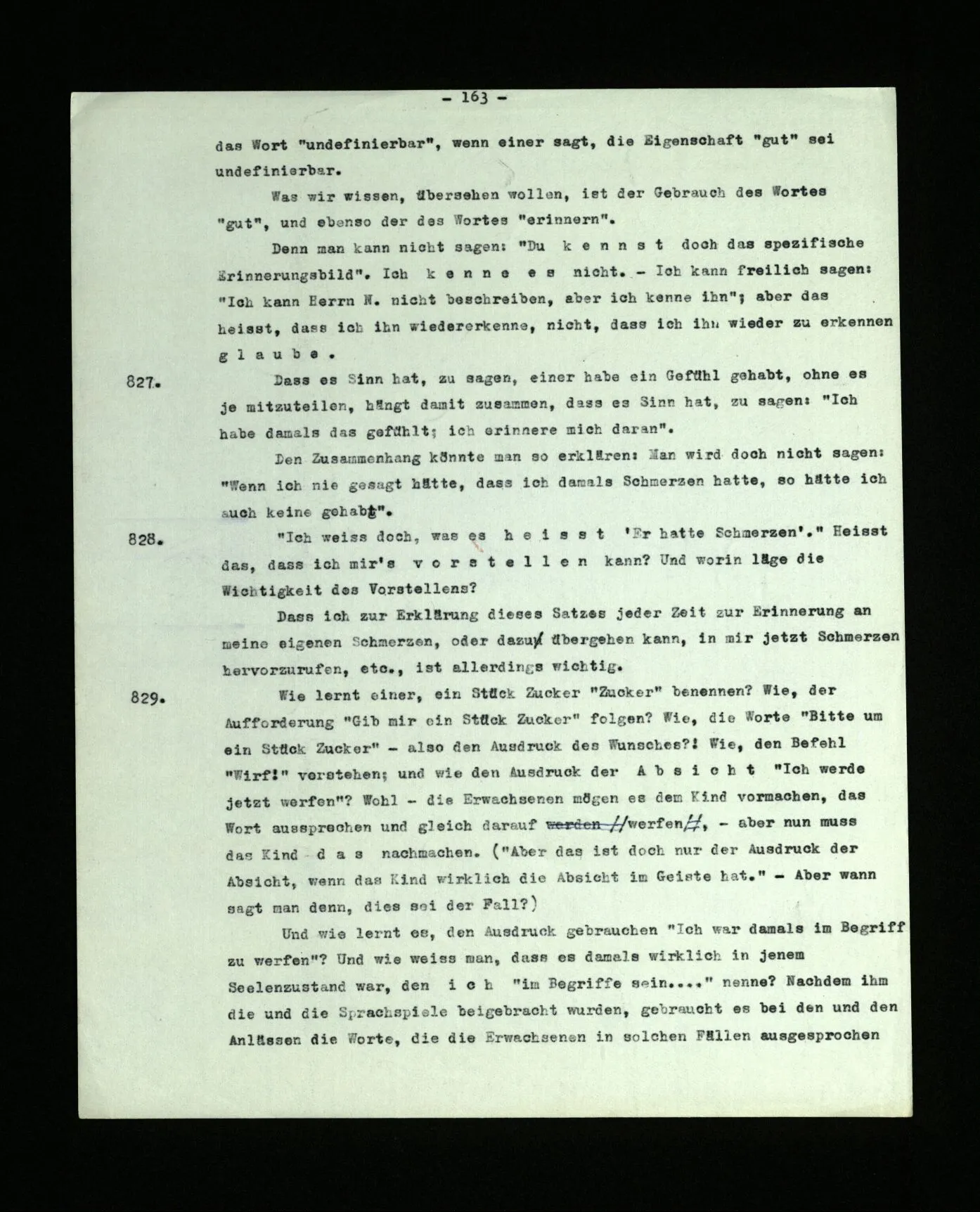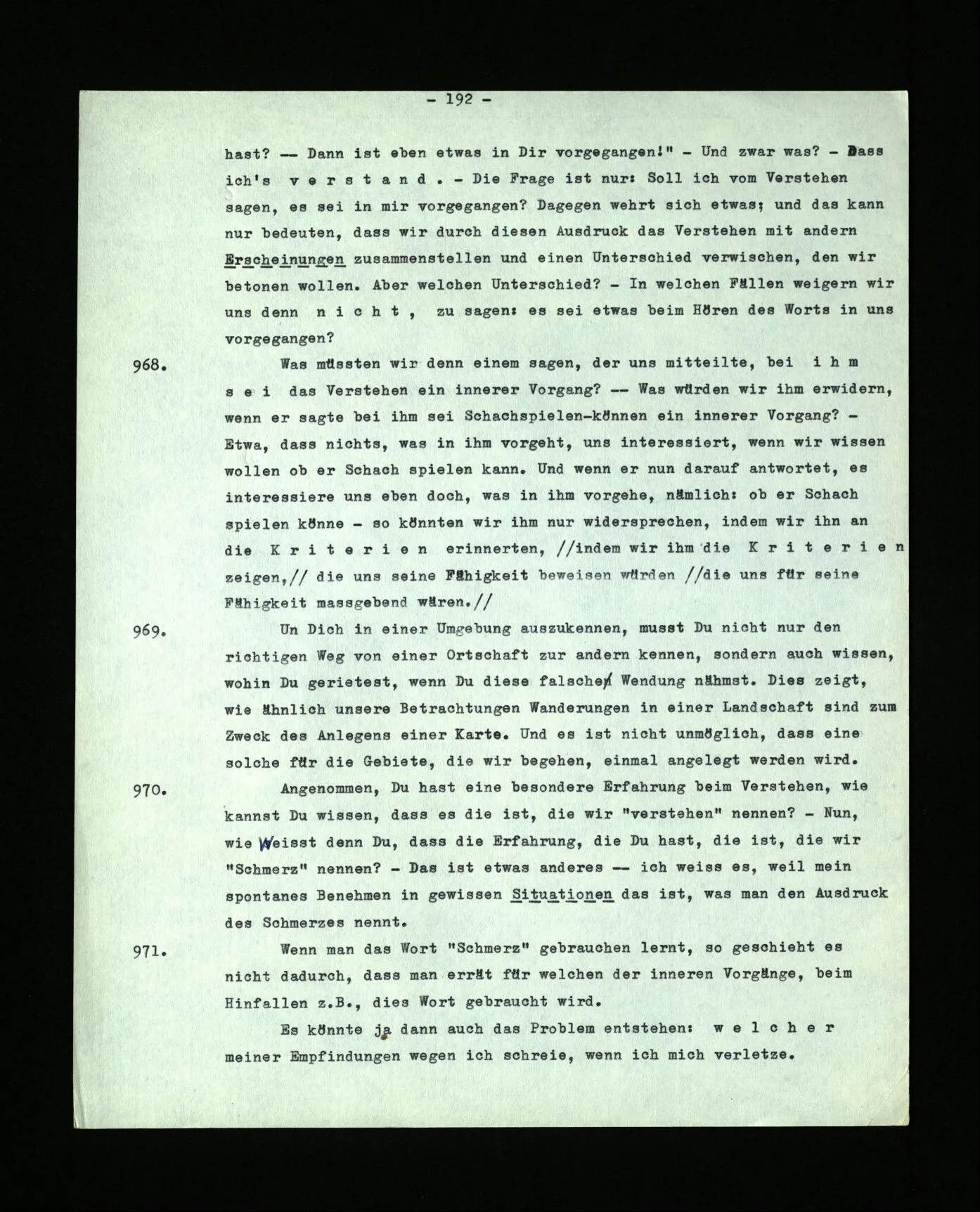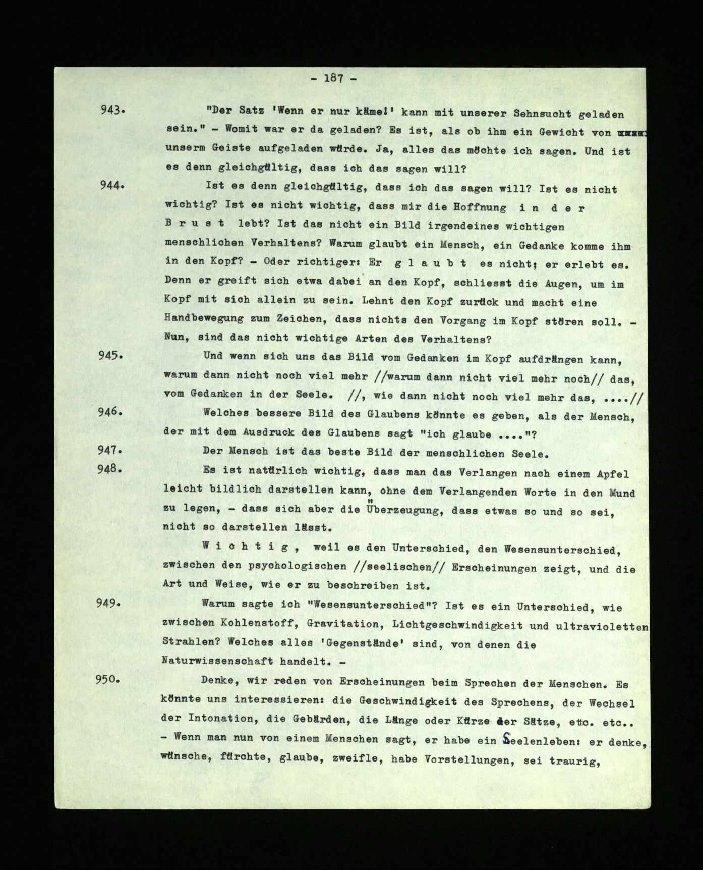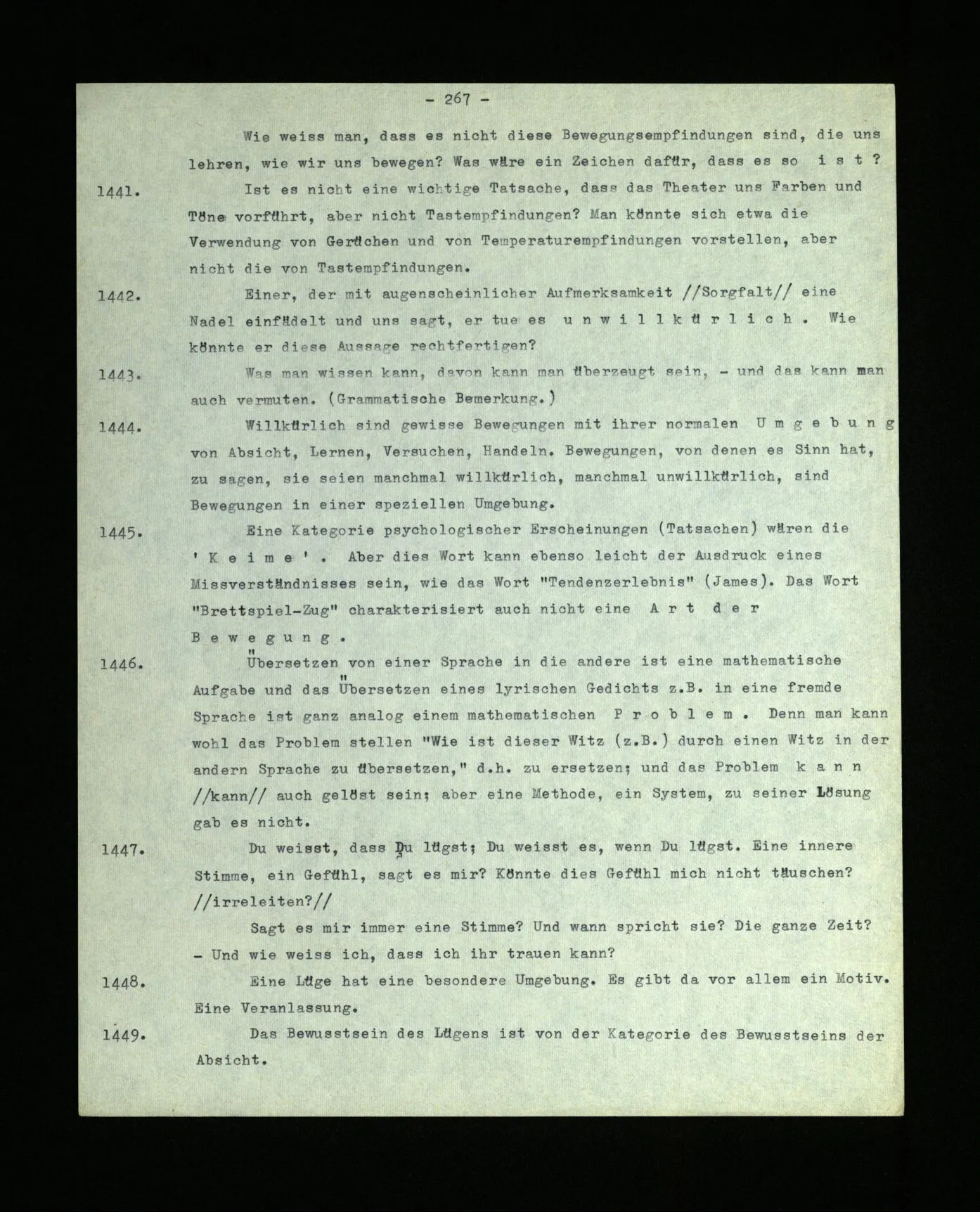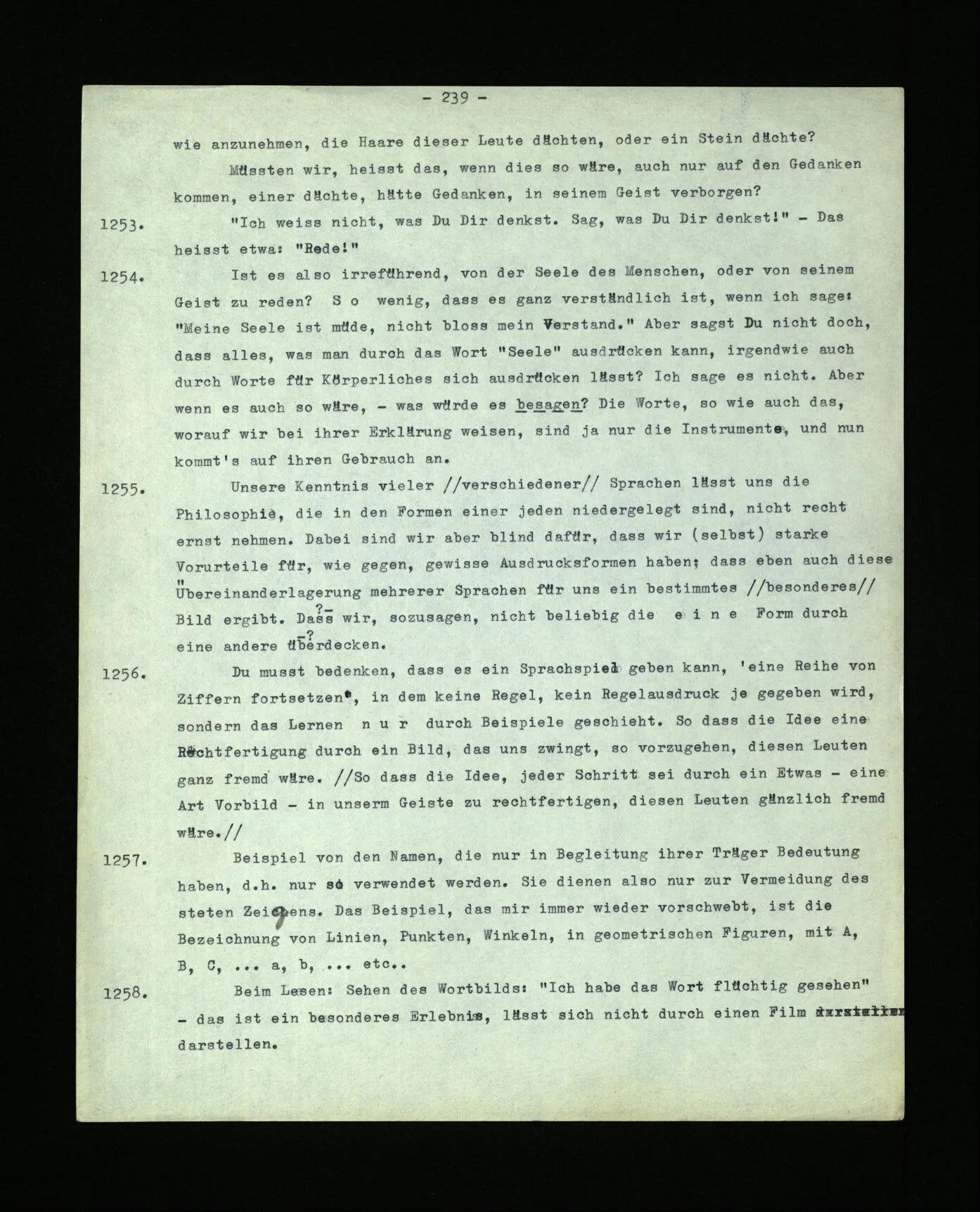 1803. Ist es aber nicht sonderbar, daß es so eine Reaktion so ein Geständnis der Intention gibt? Ist es nicht ein höchst merkwürdiges Sprachinstrument? Was ist eigentlich merkwürdig daran? Nun, – es ist schwer vorstellbar, wie der Mensch diesen Wortgebrauch lernt. Es ist gar so subtil.