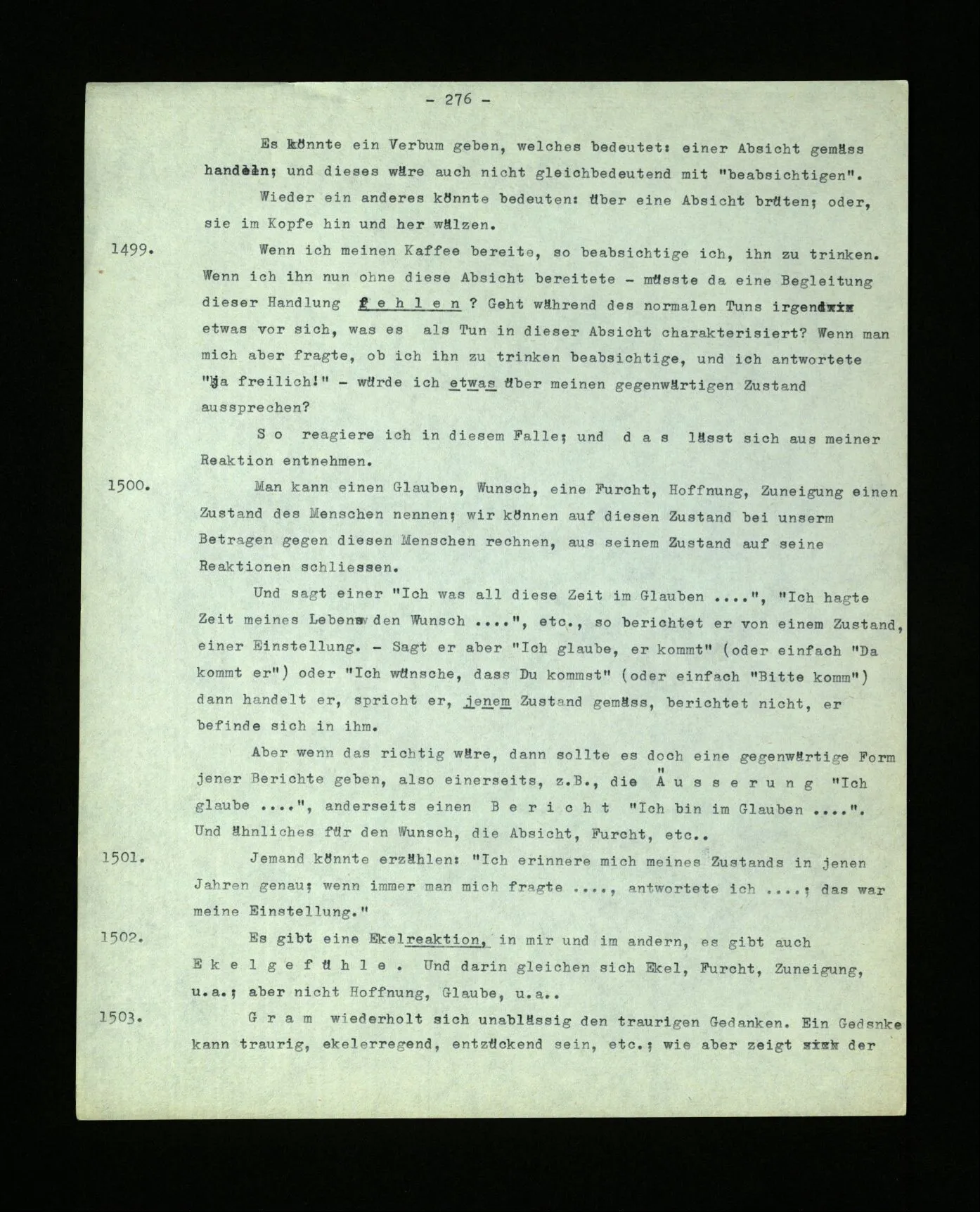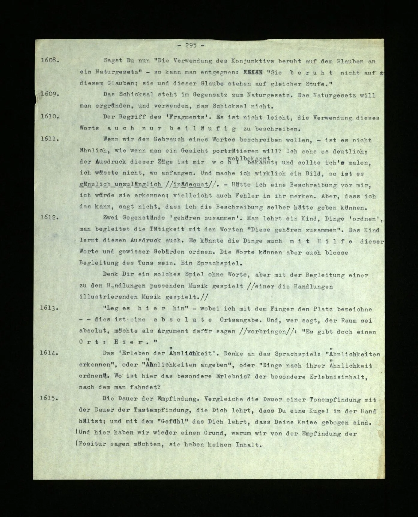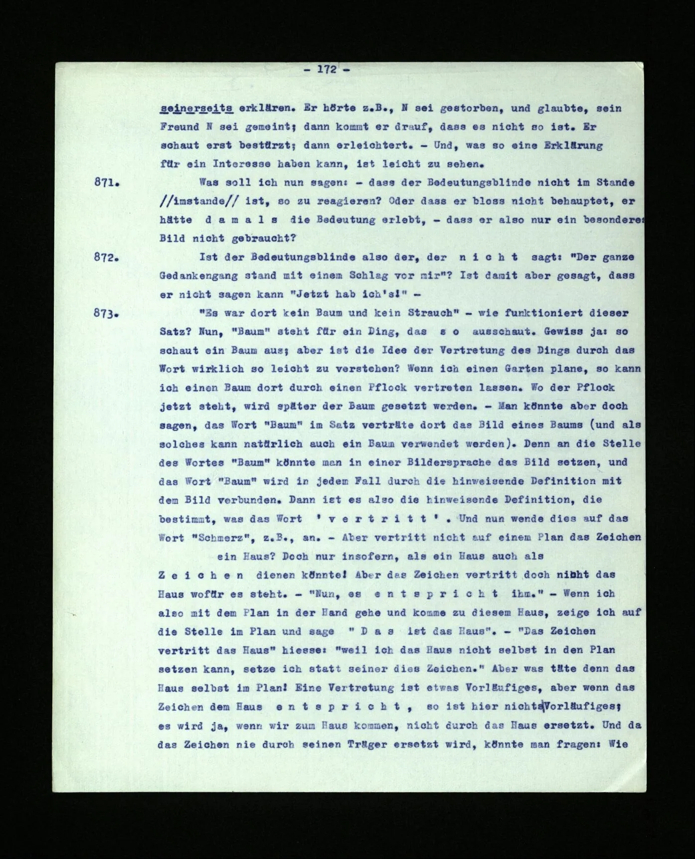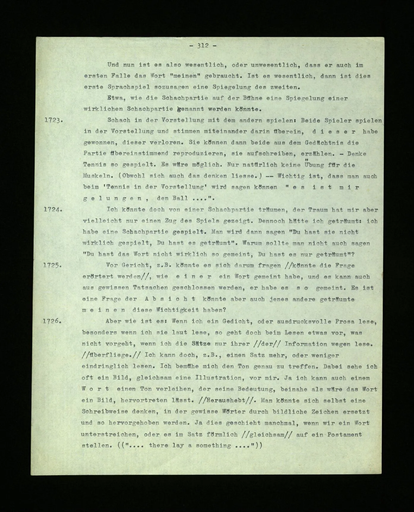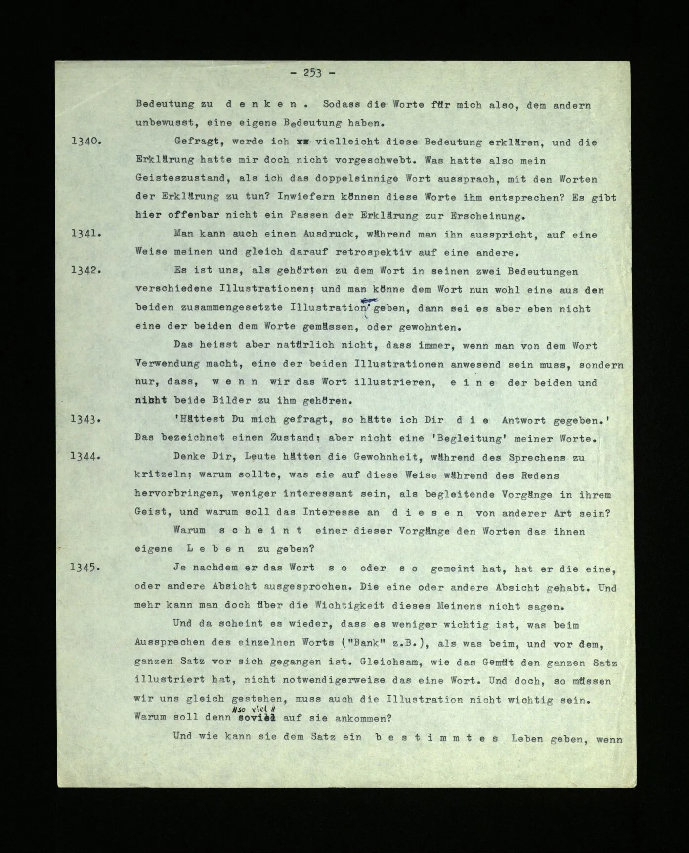 1803. Ist es aber nicht sonderbar, daß es so eine Reaktion so ein Geständnis der Intention gibt? Ist es nicht ein höchst merkwürdiges Sprachinstrument? Was ist eigentlich merkwürdig daran? Nun, – es ist schwer vorstellbar, wie der Mensch diesen Wortgebrauch lernt. Es ist gar so subtil.