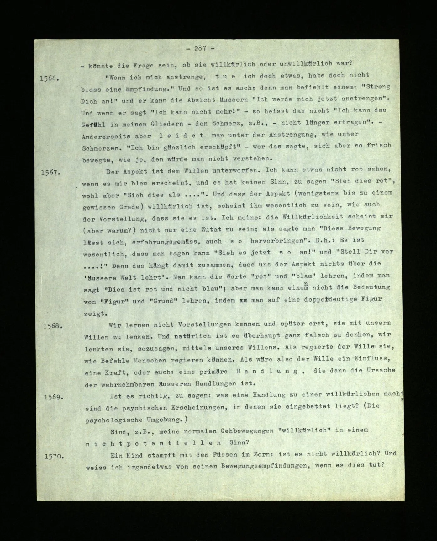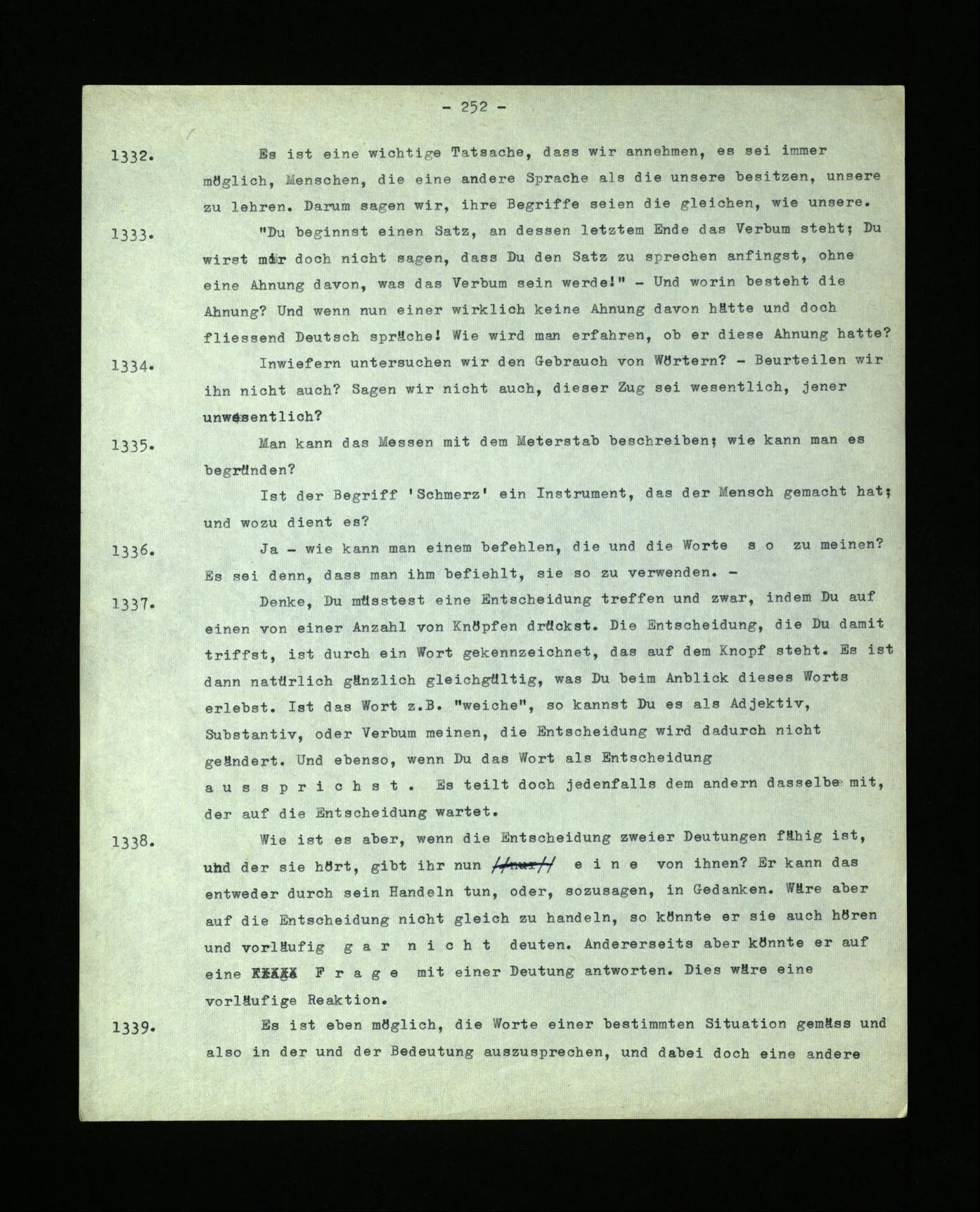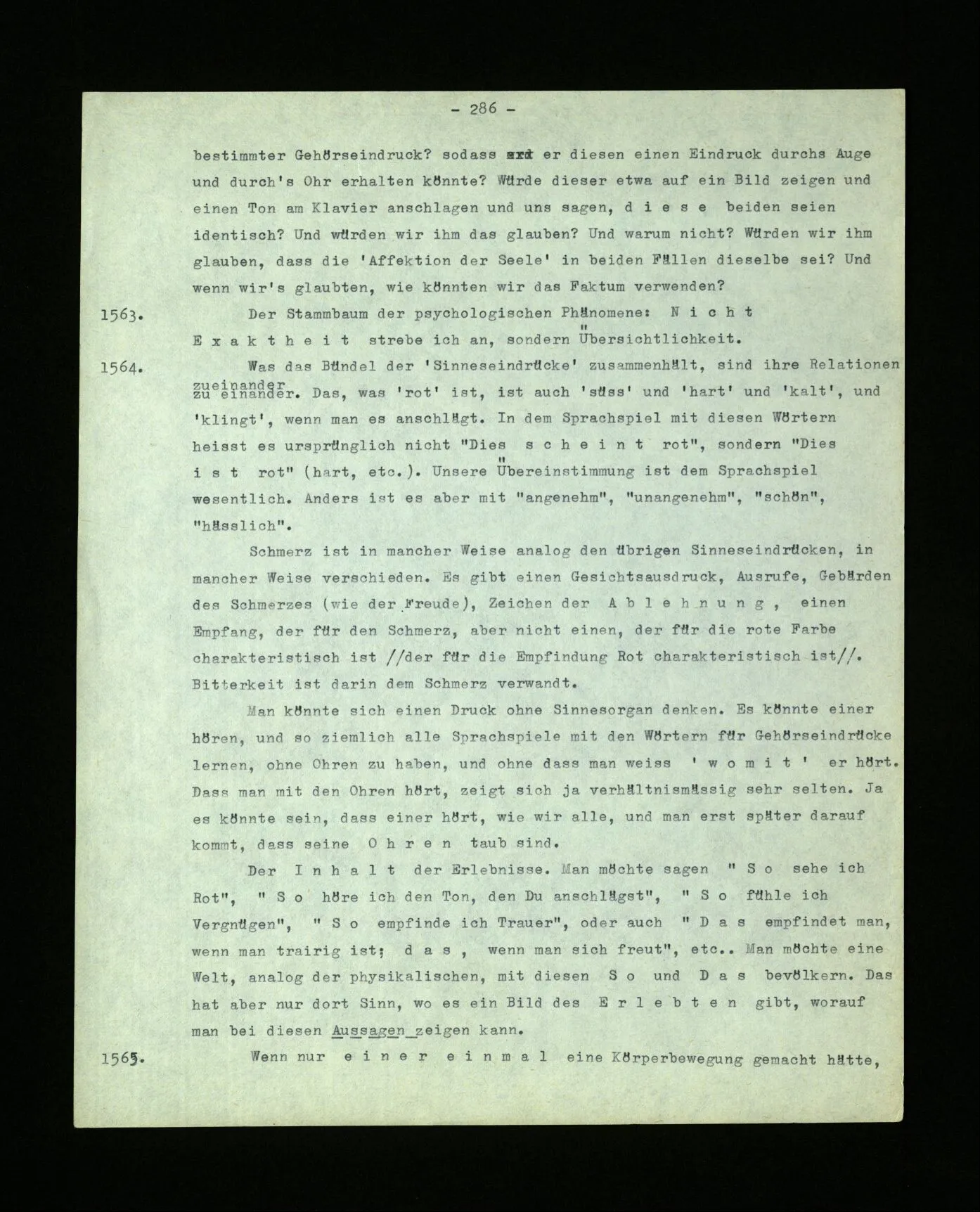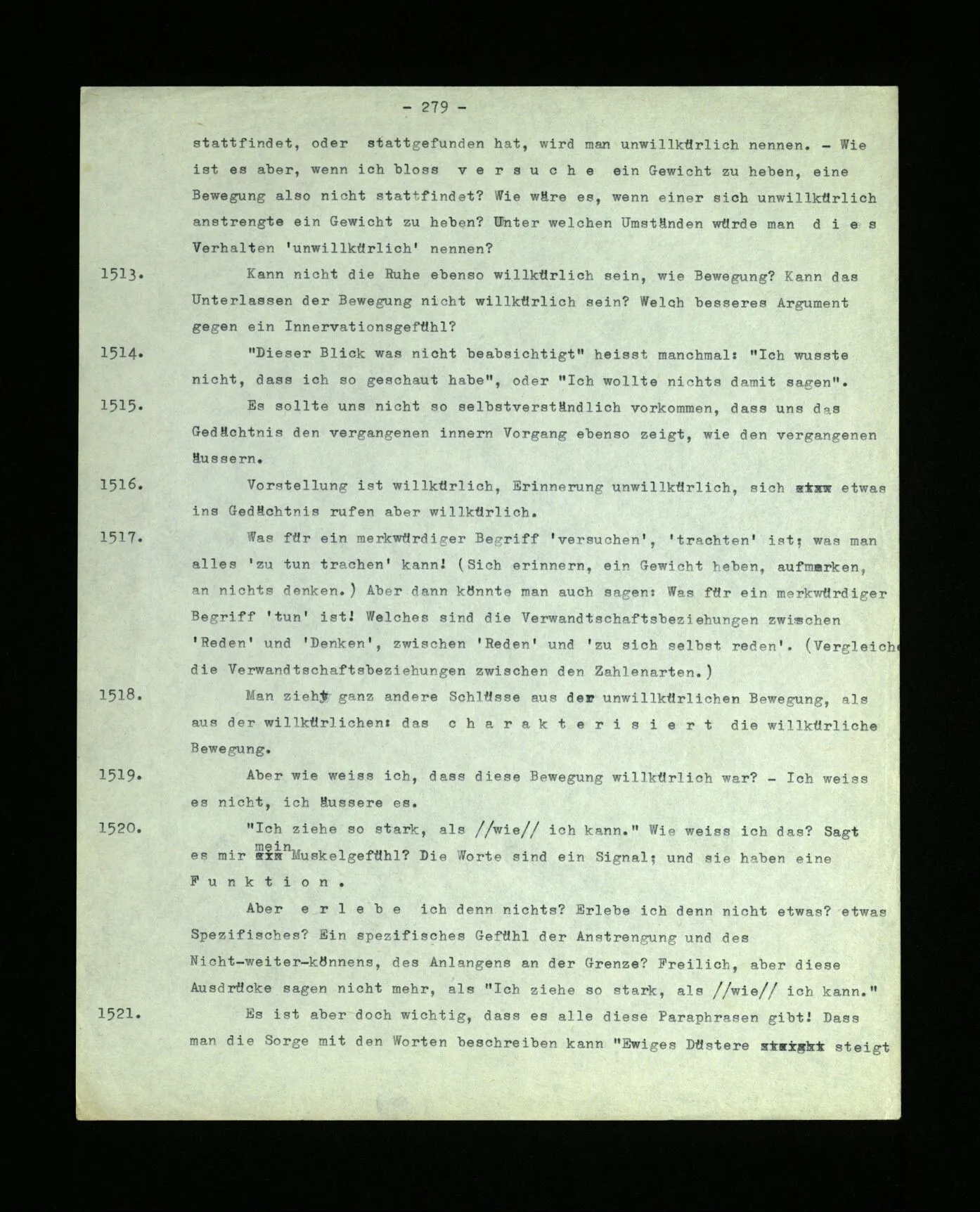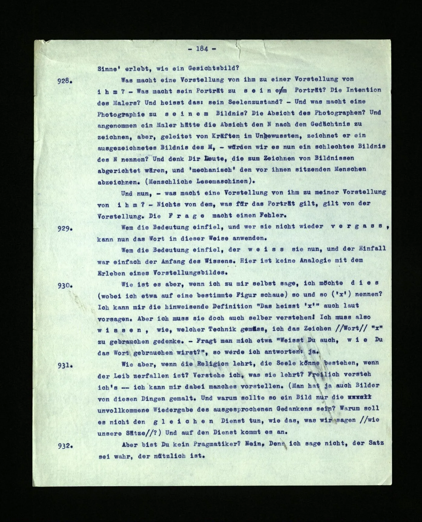 1803. Ist es aber nicht sonderbar, daß es so eine Reaktion so ein Geständnis der Intention gibt? Ist es nicht ein höchst merkwürdiges Sprachinstrument? Was ist eigentlich merkwürdig daran? Nun, – es ist schwer vorstellbar, wie der Mensch diesen Wortgebrauch lernt. Es ist gar so subtil.