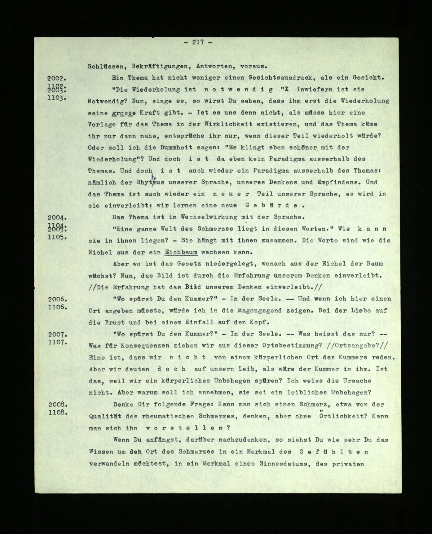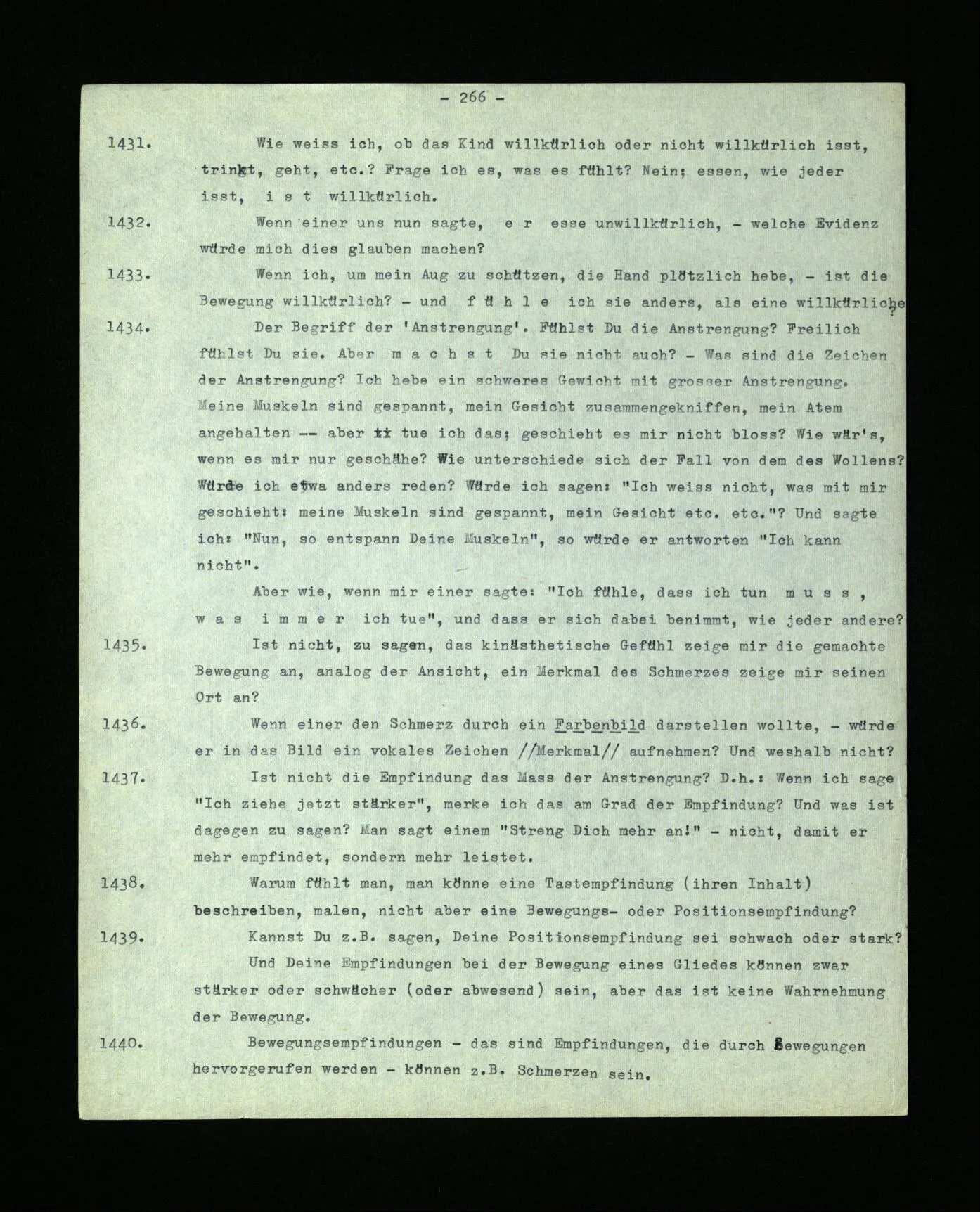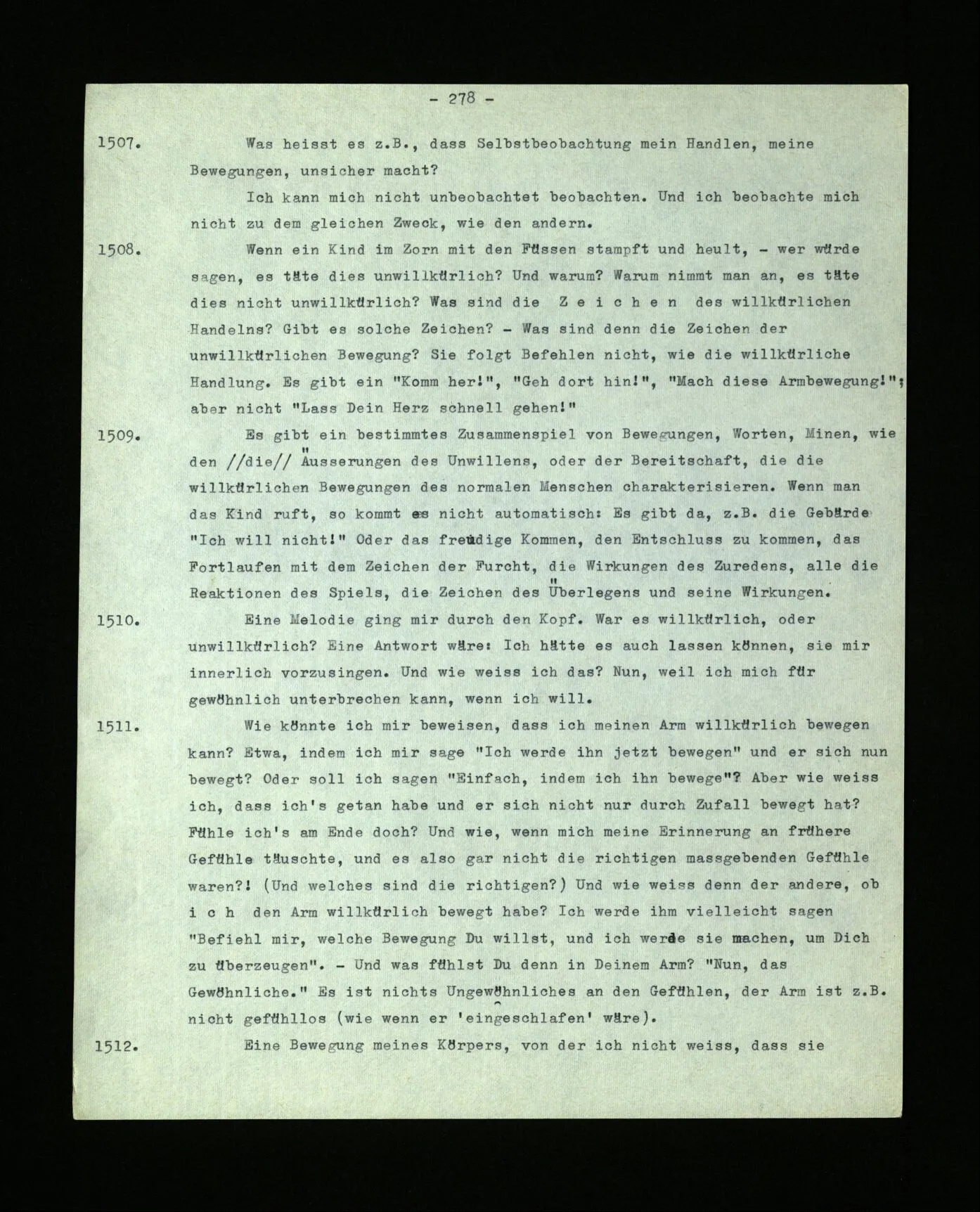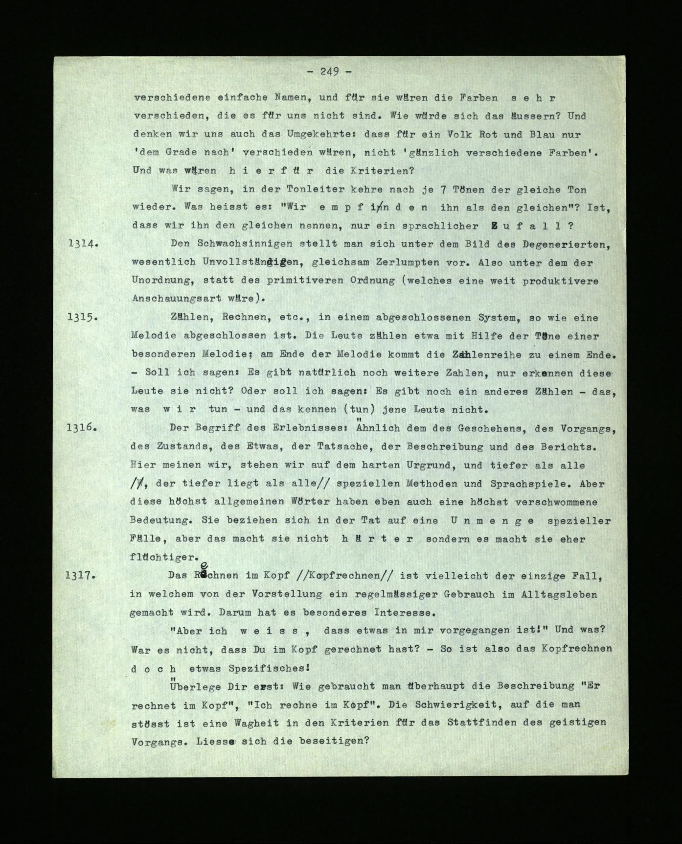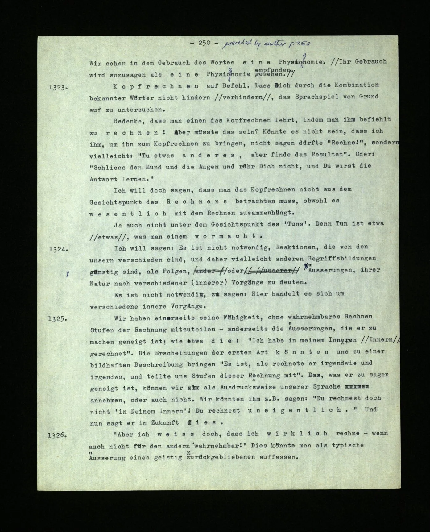 1803. Ist es aber nicht sonderbar, daß es so eine Reaktion so ein Geständnis der Intention gibt? Ist es nicht ein höchst merkwürdiges Sprachinstrument? Was ist eigentlich merkwürdig daran? Nun, – es ist schwer vorstellbar, wie der Mensch diesen Wortgebrauch lernt. Es ist gar so subtil.