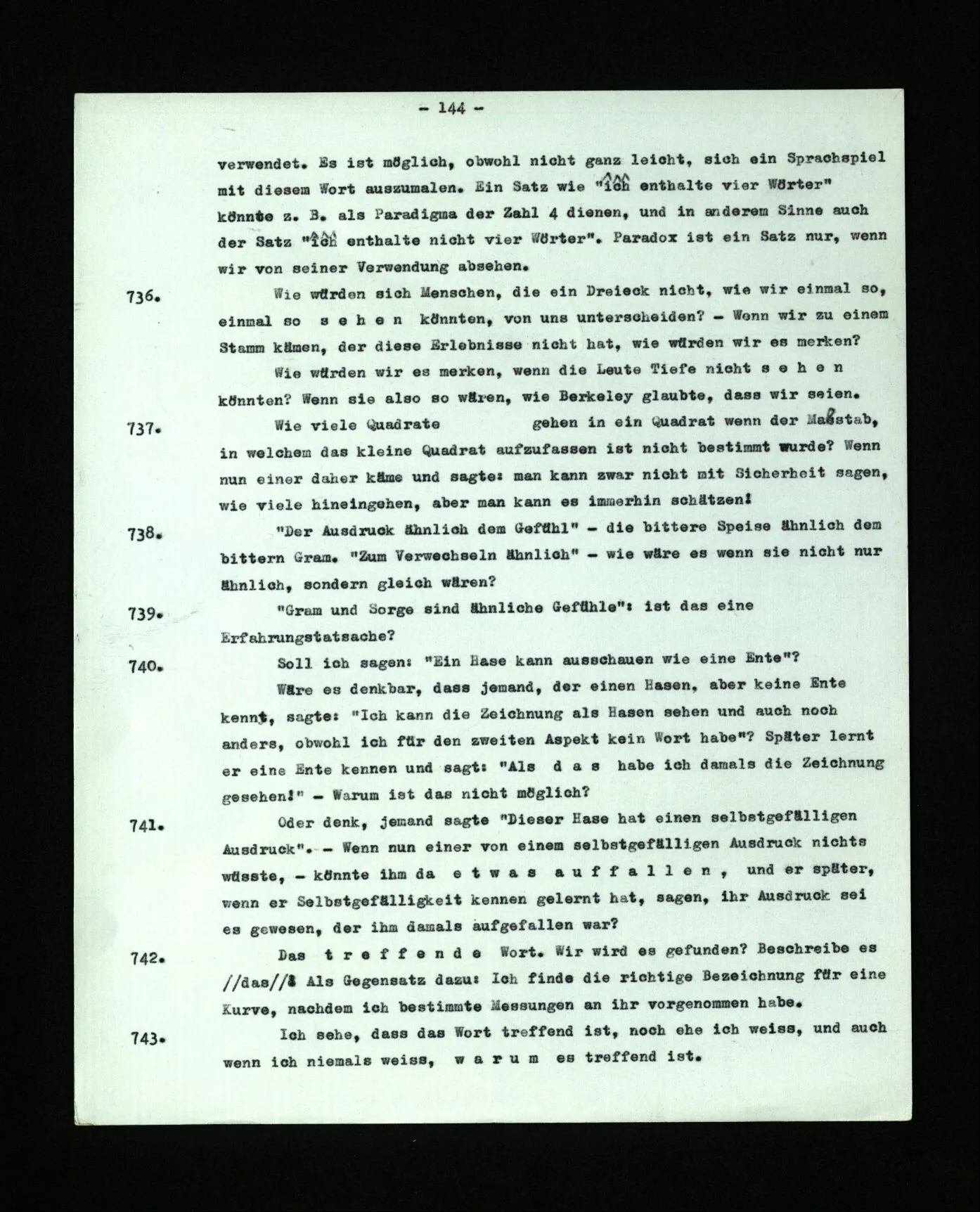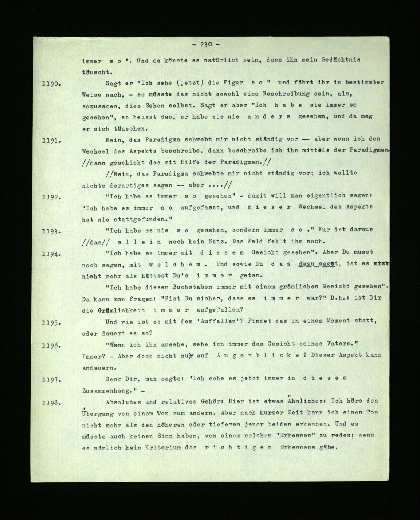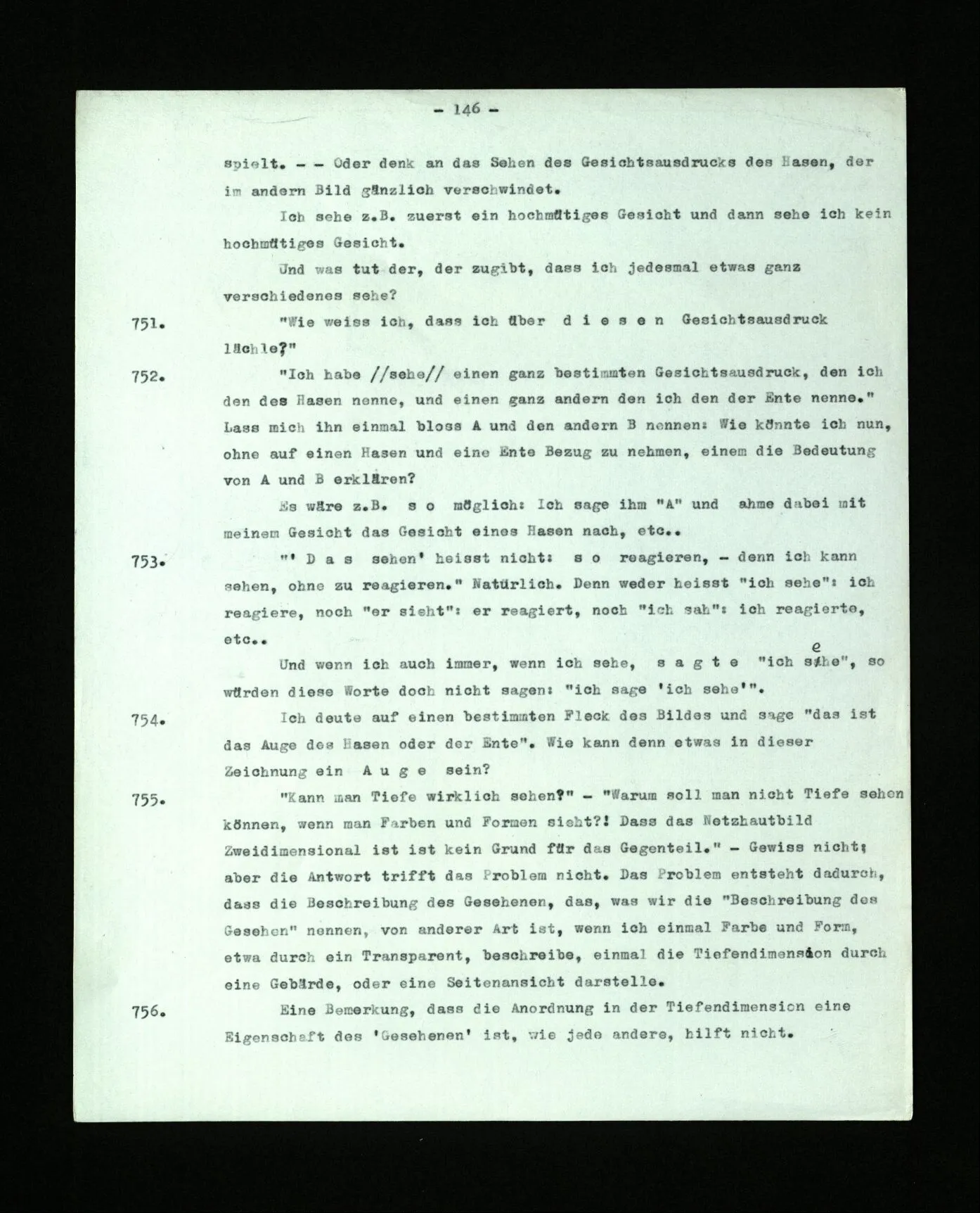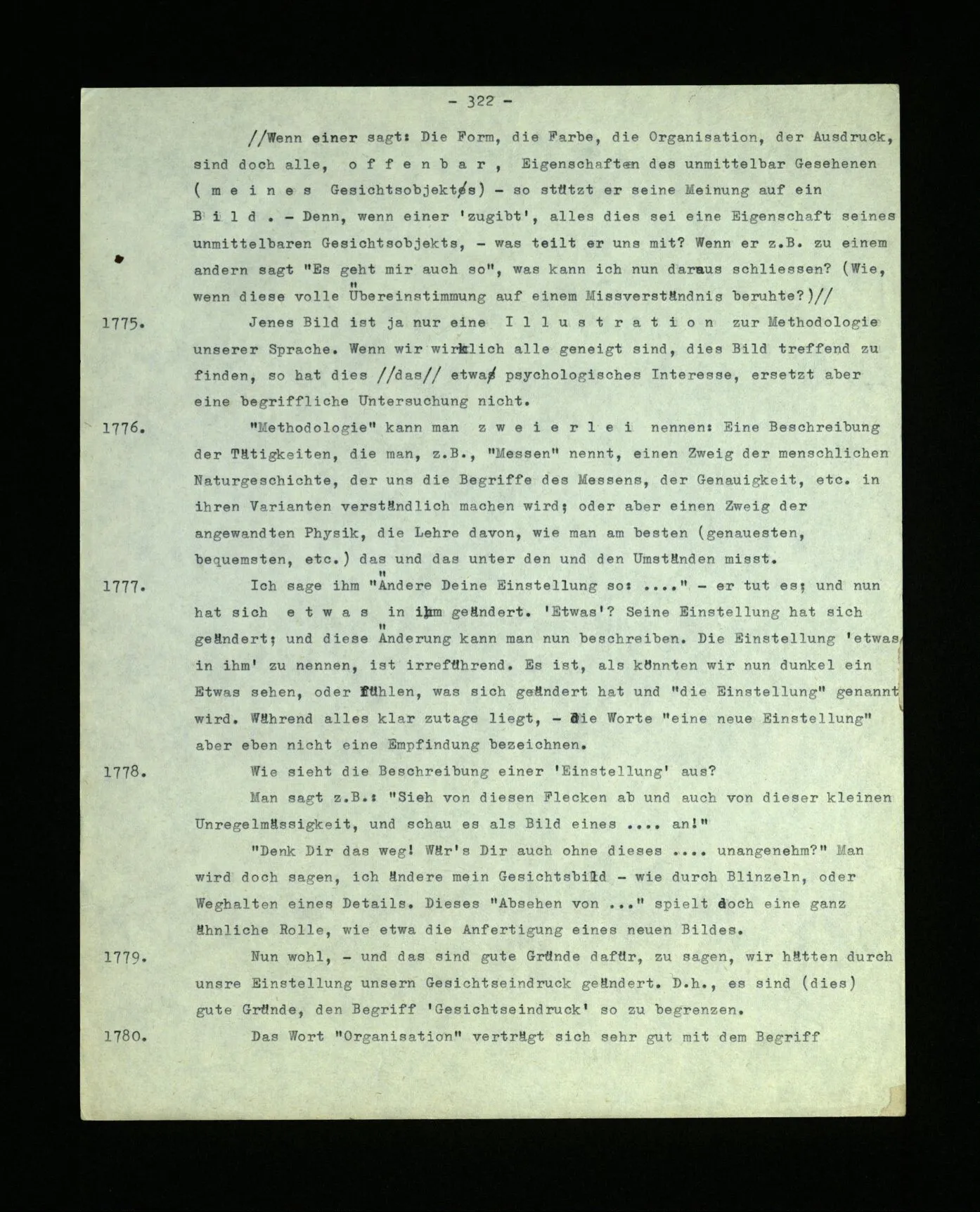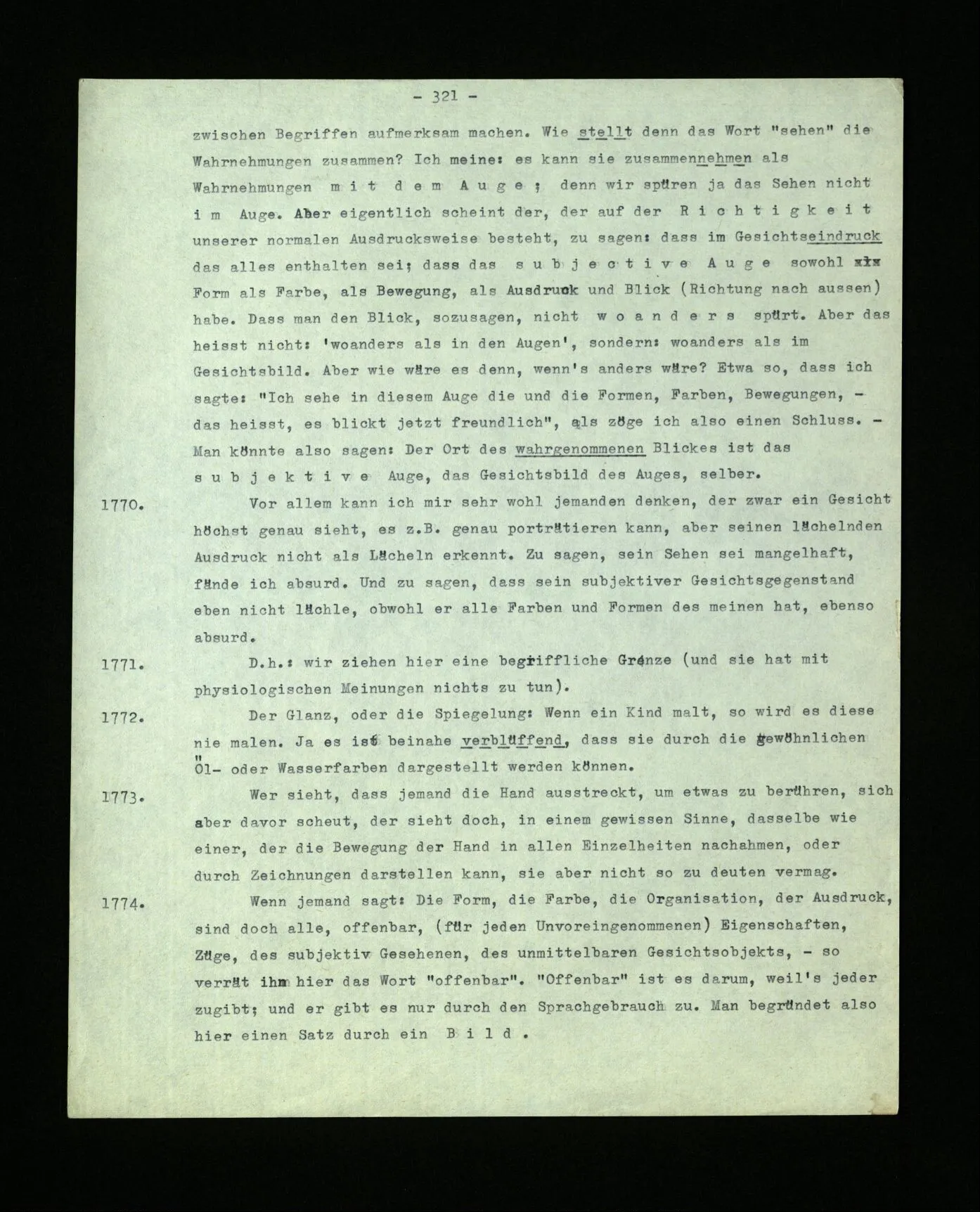 1774. Wenn jemand sagt: Die Form, die Farbe, die Organisation, der Ausdruck, sind doch alle, offenbar, (für jeden Unvoreingenommenen) Eigenschaften, Züge, des subjektiv Gesehenen, des unmittelbaren Gesichtsobjekts, – so verrät ihn hier das Wort “offenbar”. “Offenbar” ist es darum, weil’s jeder zugibt; und er gibt es nur durch den Sprachgebrauch zu. Man begründet also hier einen Satz durch ein Bild.