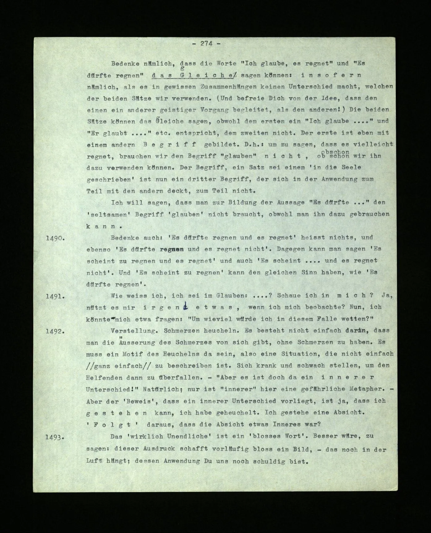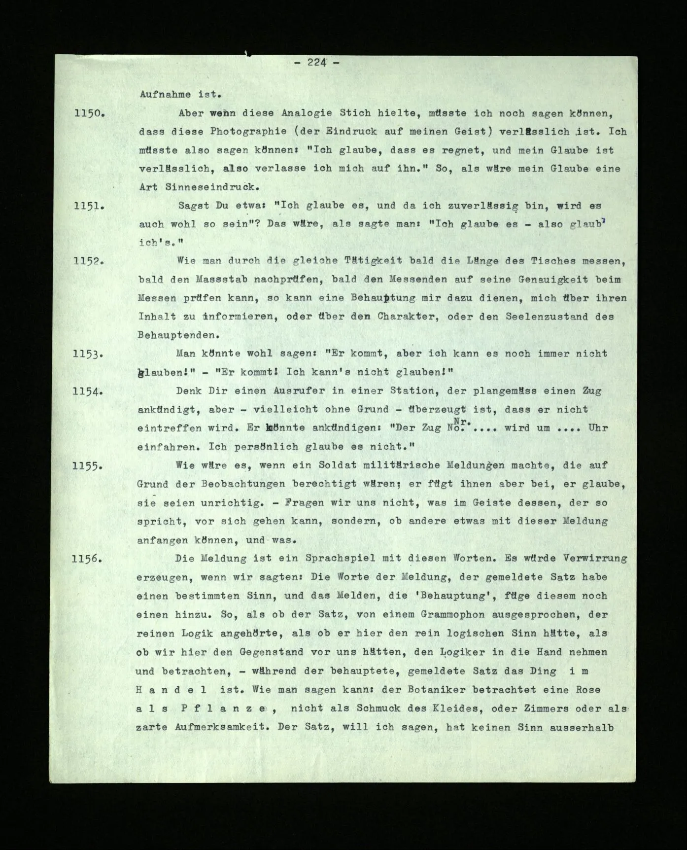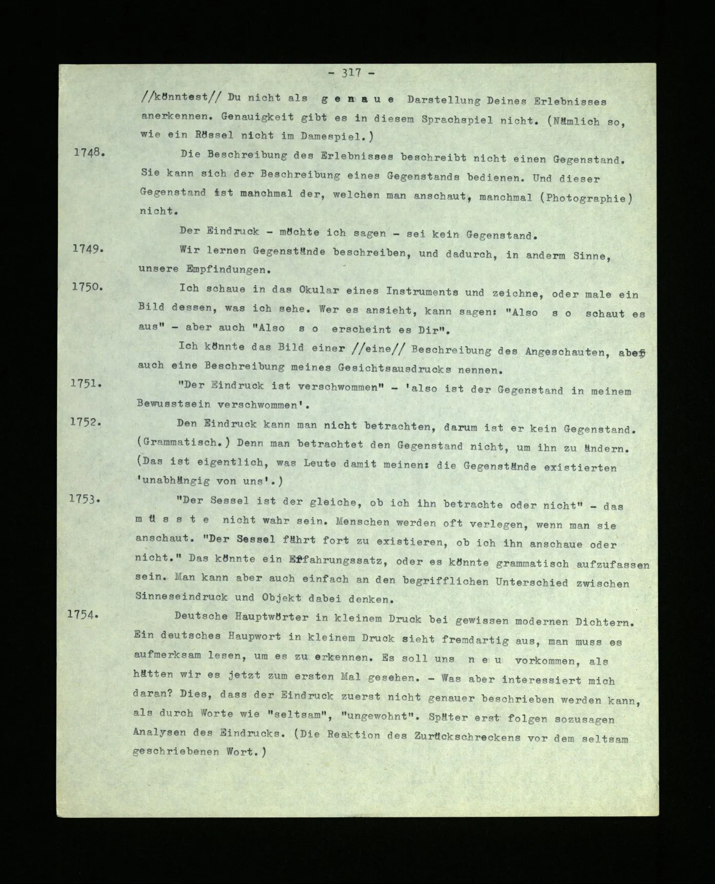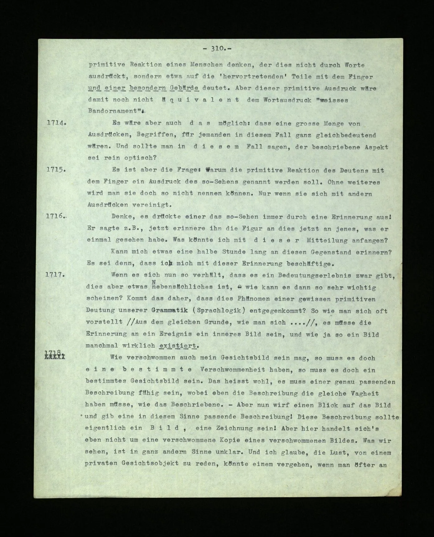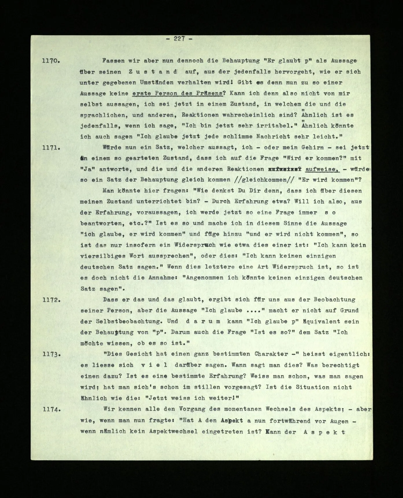 1774. Wenn jemand sagt: Die Form, die Farbe, die Organisation, der Ausdruck, sind doch alle, offenbar, (für jeden Unvoreingenommenen) Eigenschaften, Züge, des subjektiv Gesehenen, des unmittelbaren Gesichtsobjekts, – so verrät ihn hier das Wort “offenbar”. “Offenbar” ist es darum, weil’s jeder zugibt; und er gibt es nur durch den Sprachgebrauch zu. Man begründet also hier einen Satz durch ein Bild.