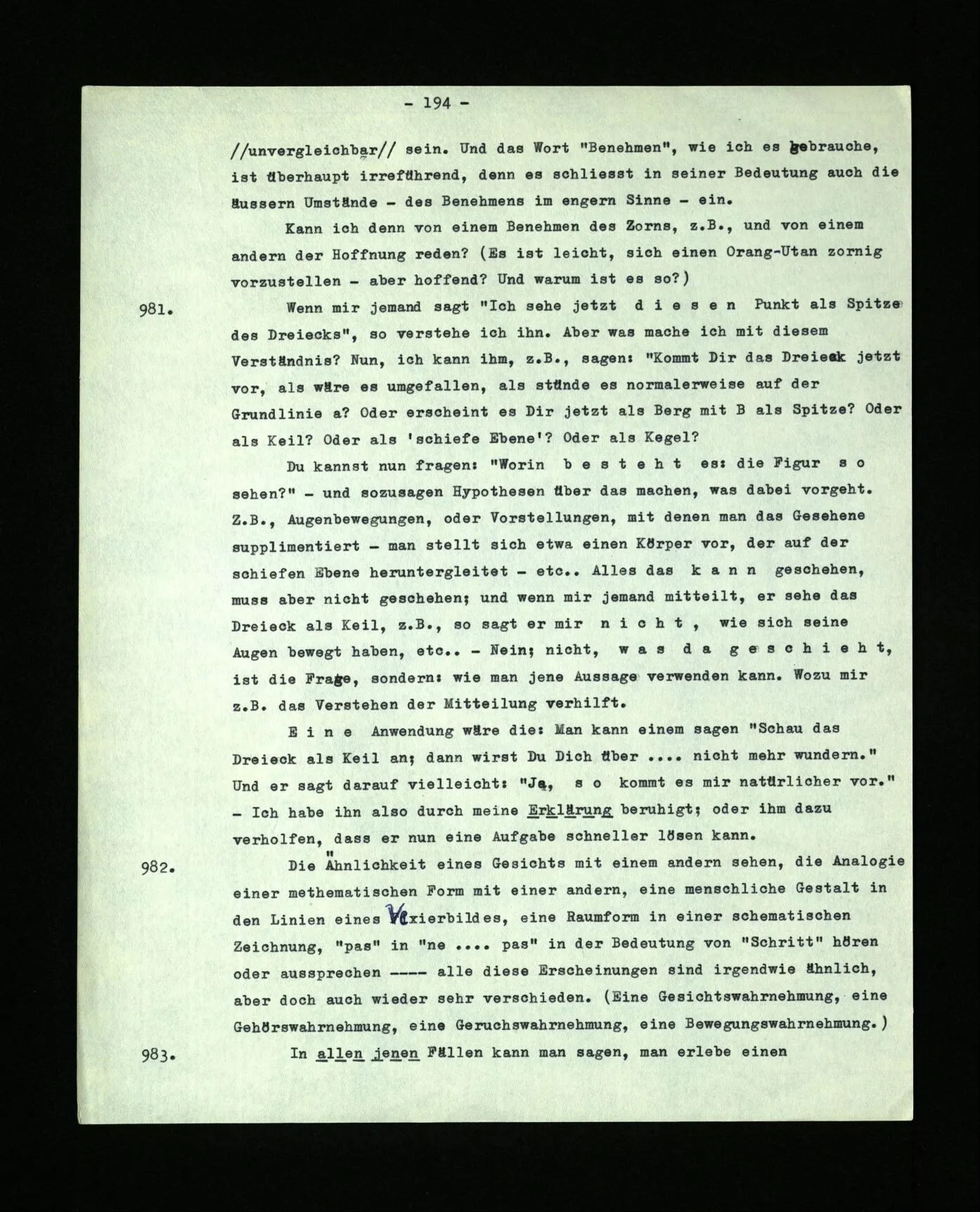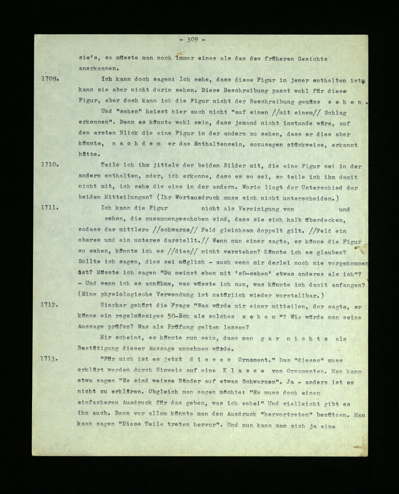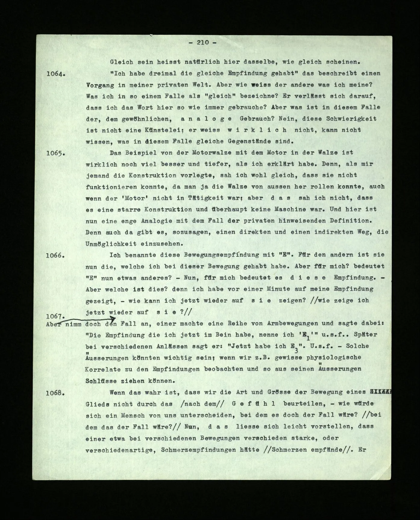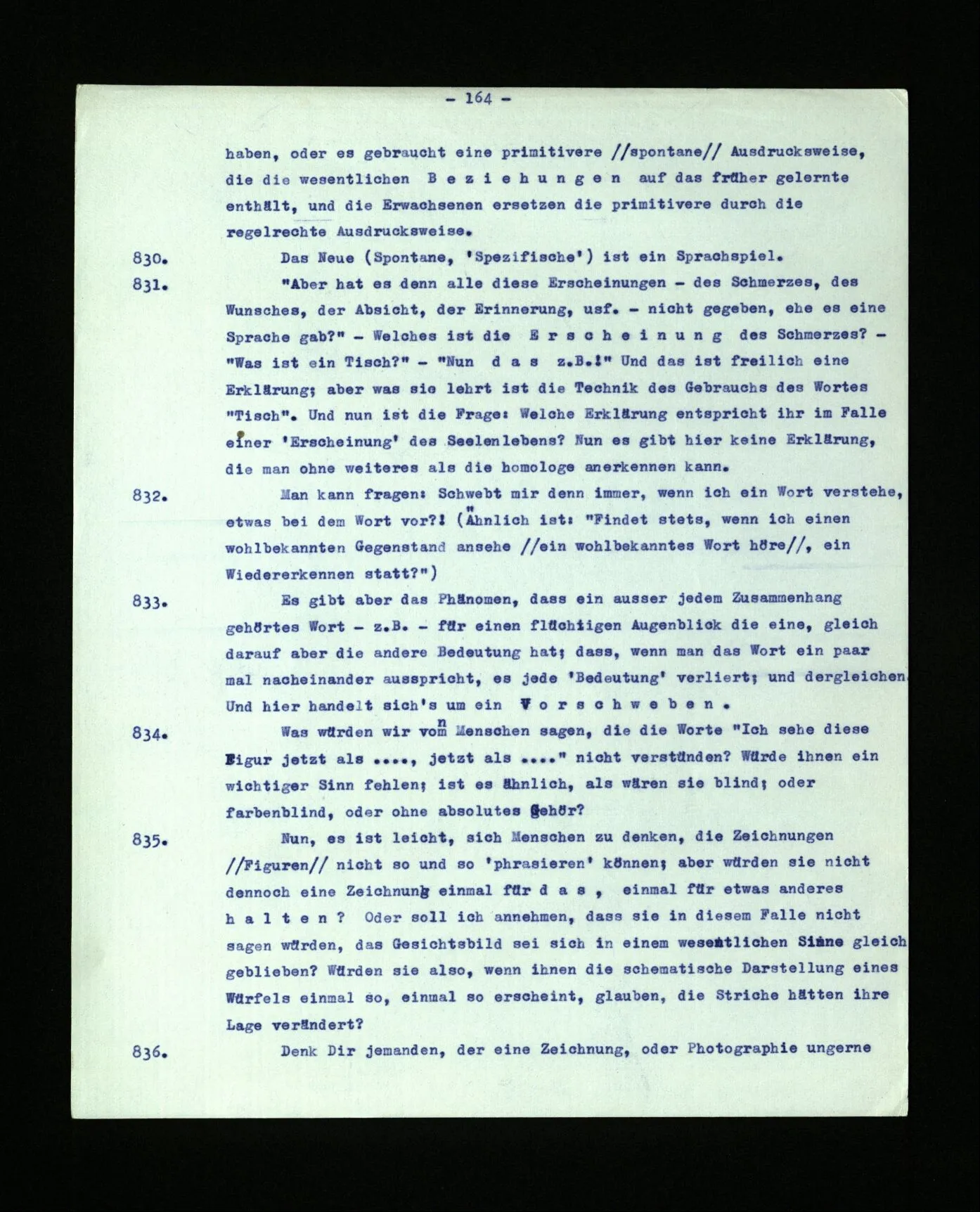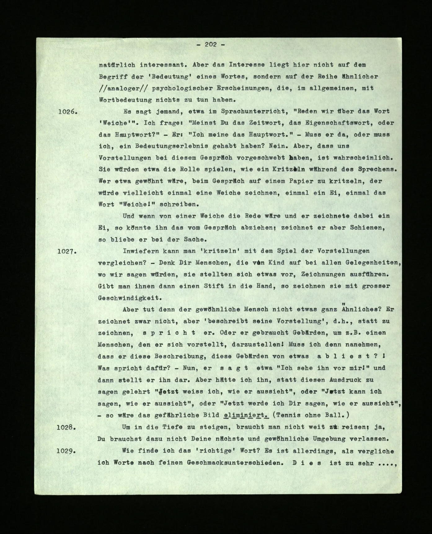 1774. Wenn jemand sagt: Die Form, die Farbe, die Organisation, der Ausdruck, sind doch alle, offenbar, (für jeden Unvoreingenommenen) Eigenschaften, Züge, des subjektiv Gesehenen, des unmittelbaren Gesichtsobjekts, – so verrät ihn hier das Wort “offenbar”. “Offenbar” ist es darum, weil’s jeder zugibt; und er gibt es nur durch den Sprachgebrauch zu. Man begründet also hier einen Satz durch ein Bild.