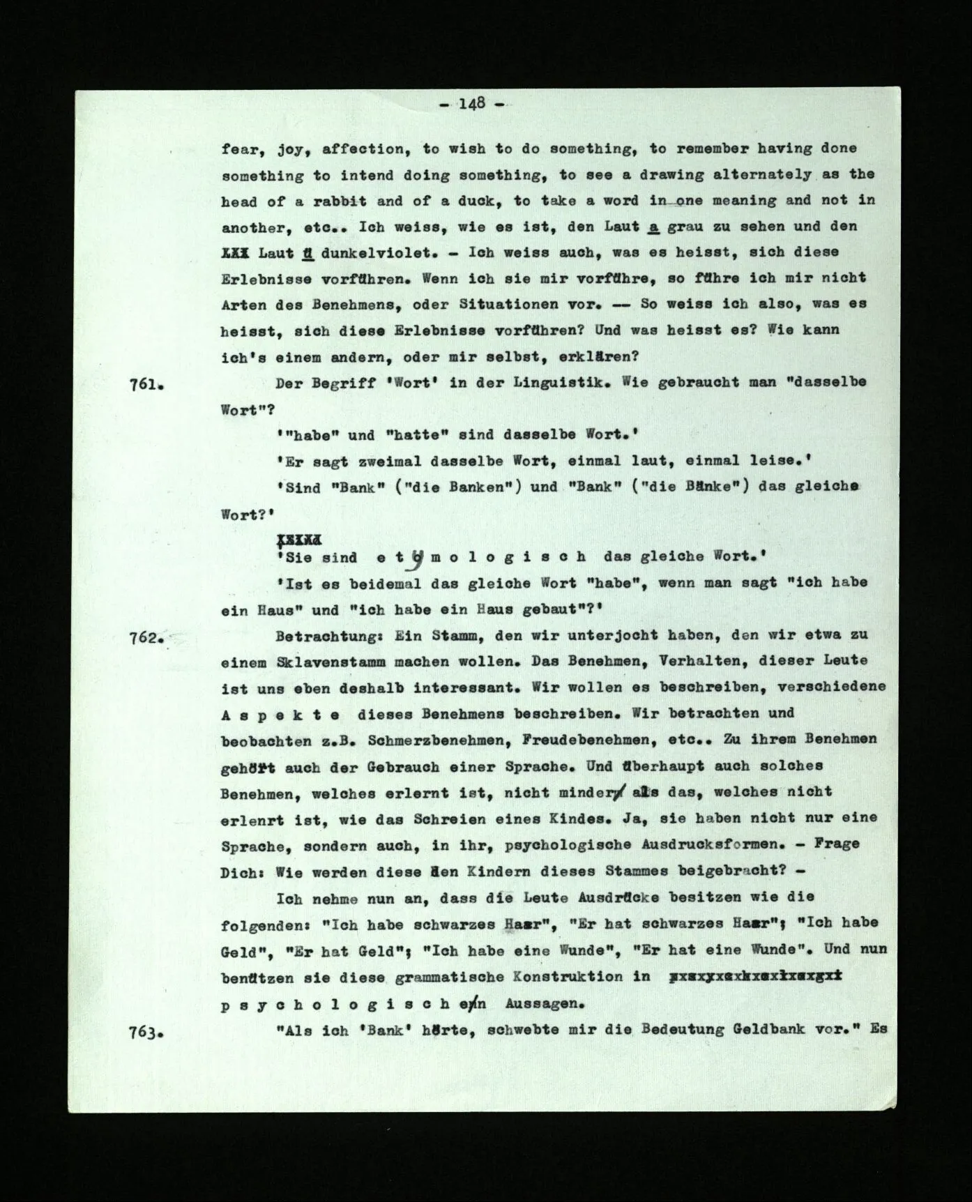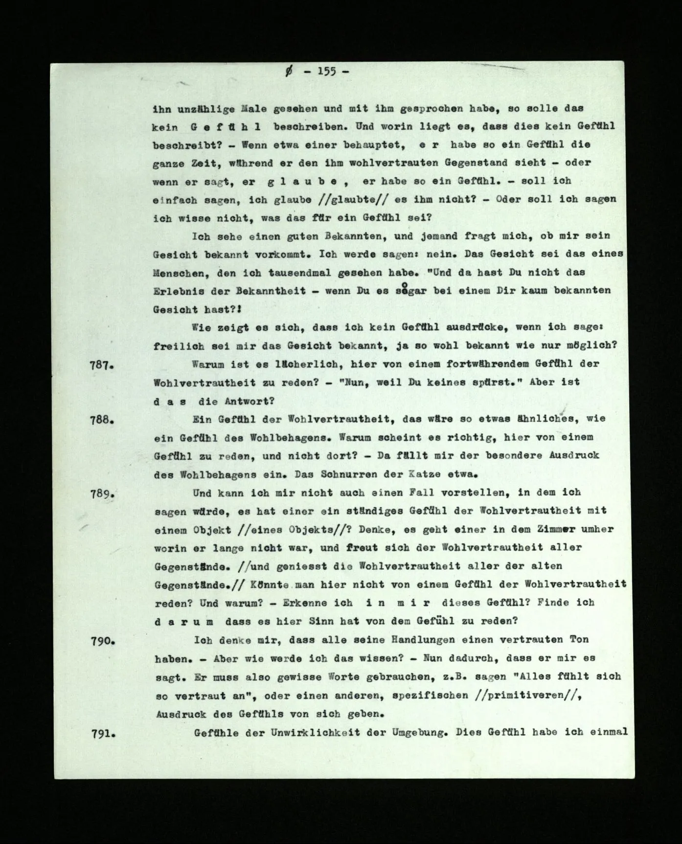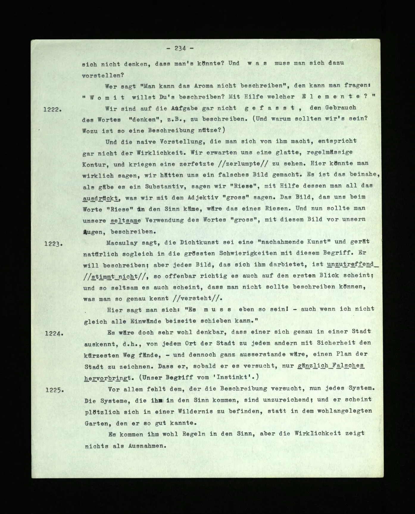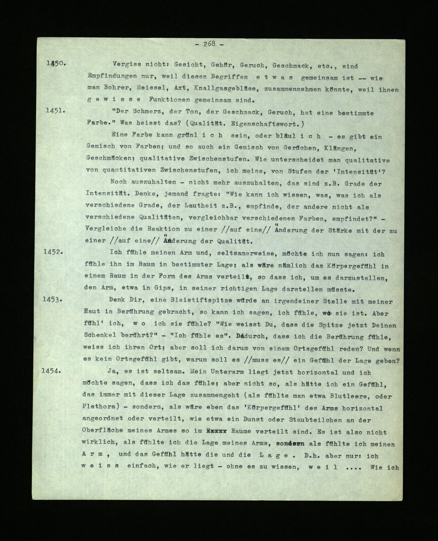 1774. Wenn jemand sagt: Die Form, die Farbe, die Organisation, der Ausdruck, sind doch alle, offenbar, (für jeden Unvoreingenommenen) Eigenschaften, Züge, des subjektiv Gesehenen, des unmittelbaren Gesichtsobjekts, – so verrät ihn hier das Wort “offenbar”. “Offenbar” ist es darum, weil’s jeder zugibt; und er gibt es nur durch den Sprachgebrauch zu. Man begründet also hier einen Satz durch ein Bild.