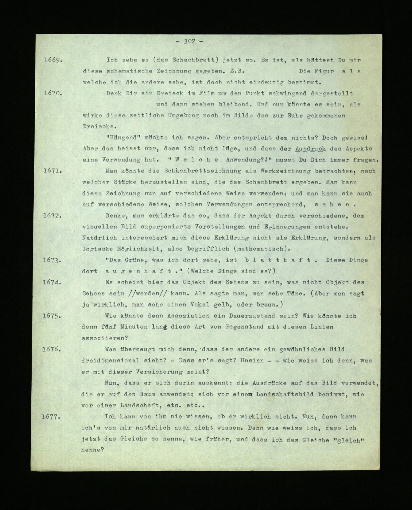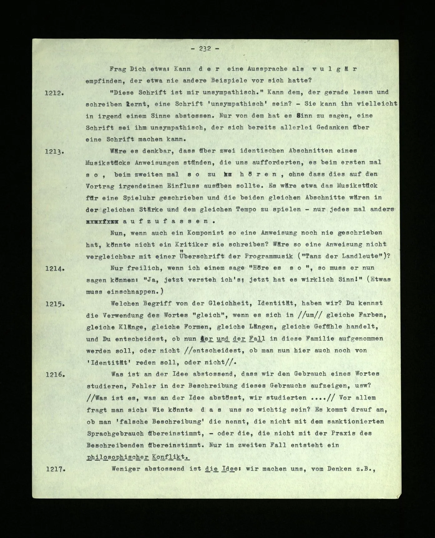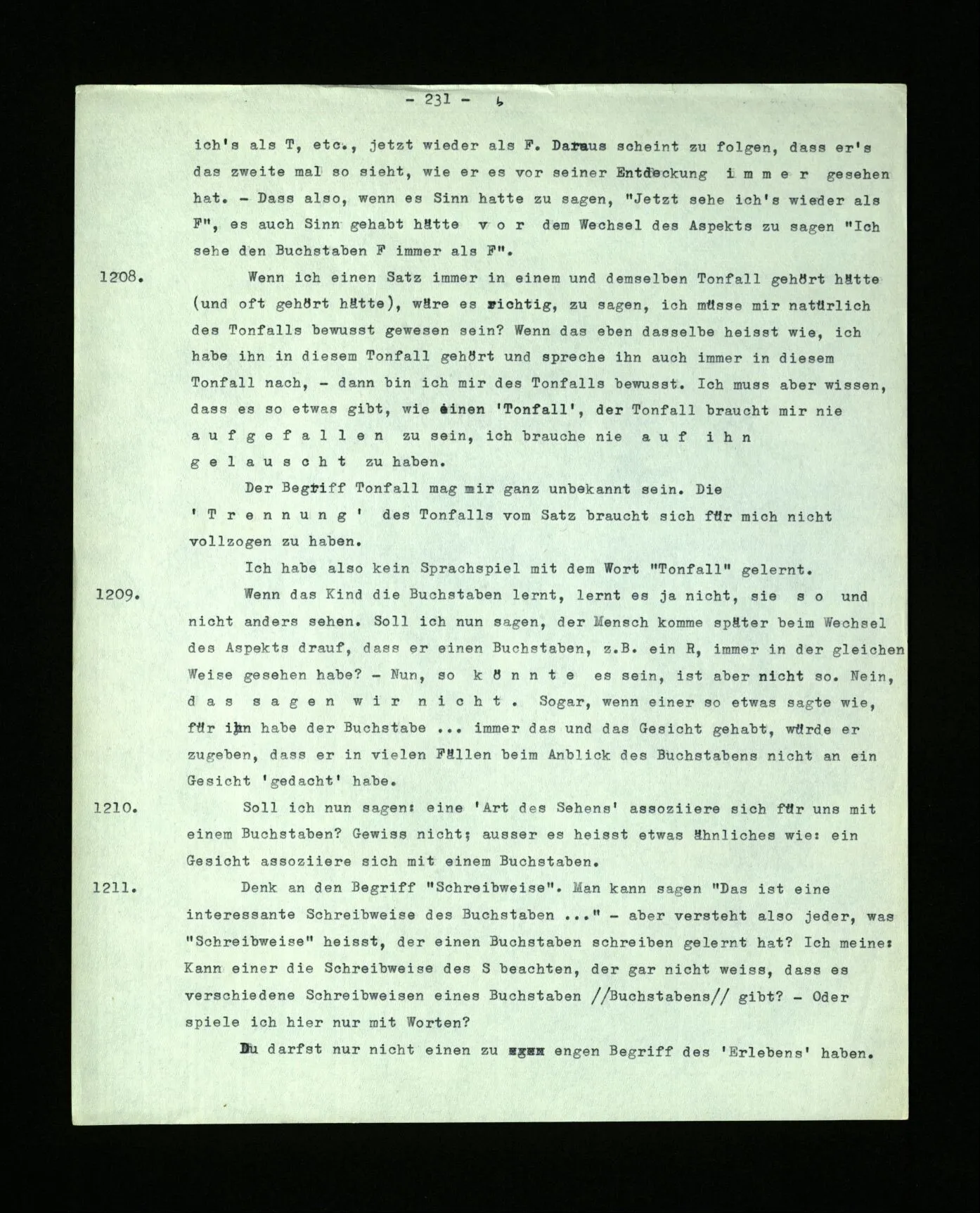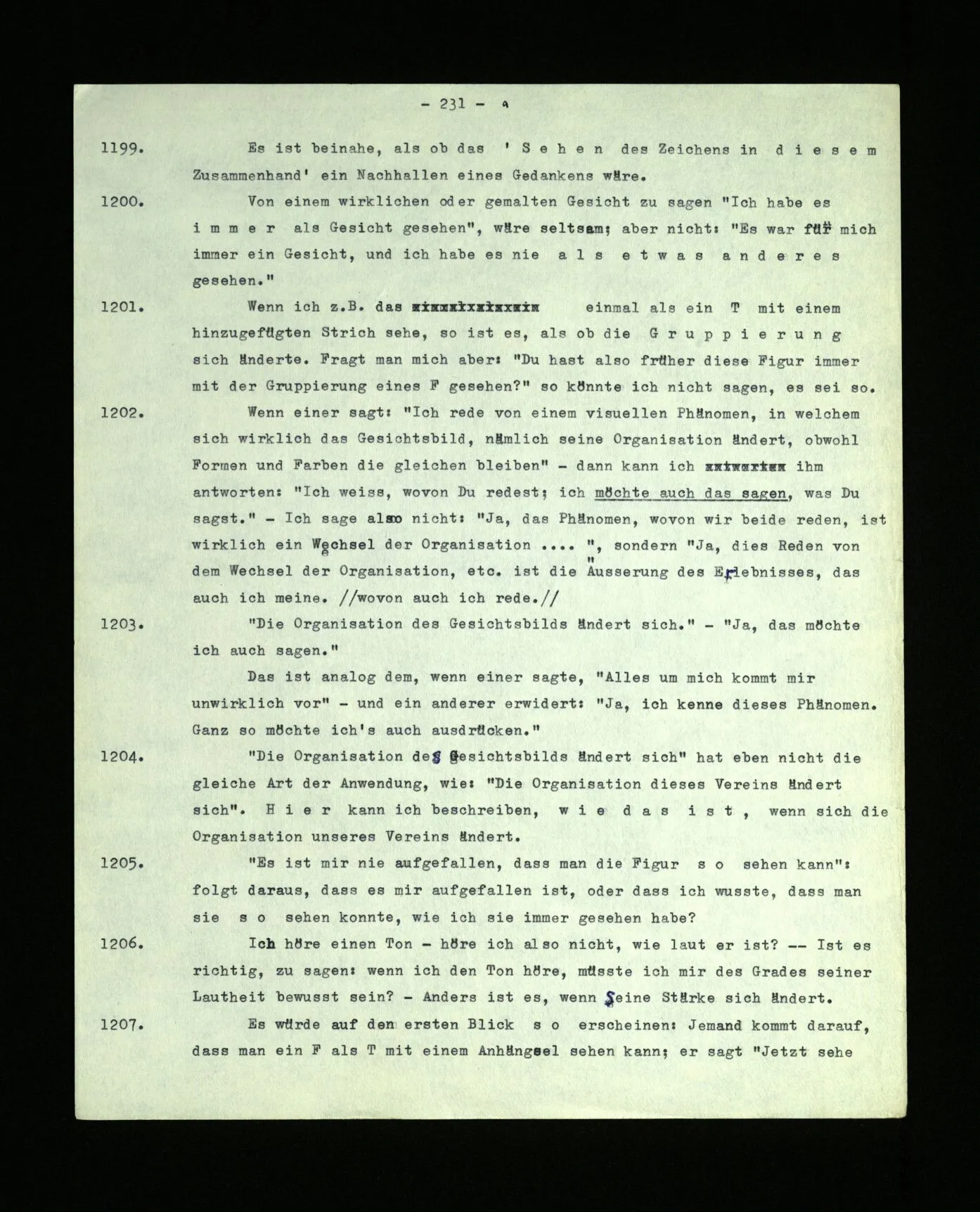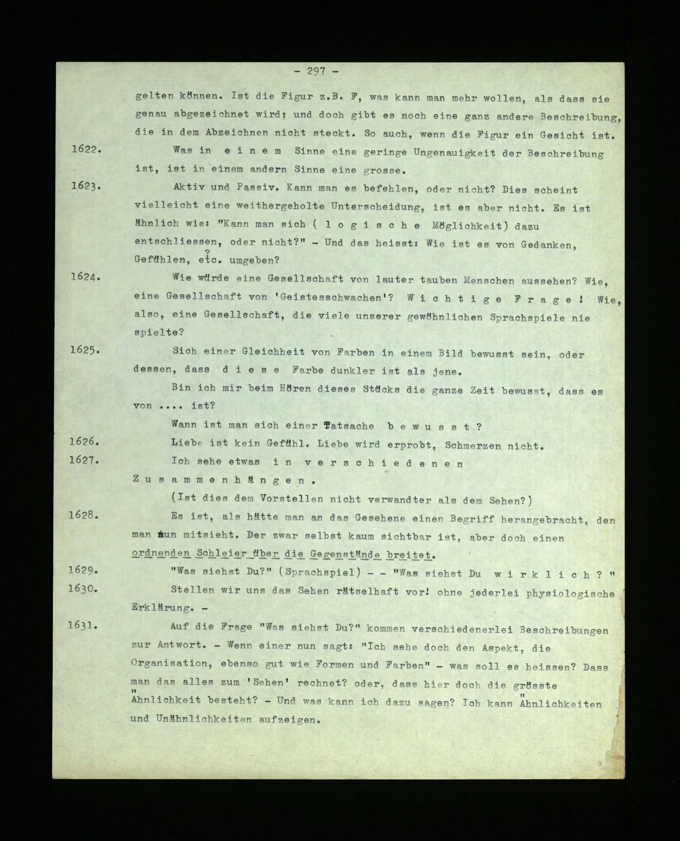 1774. Wenn jemand sagt: Die Form, die Farbe, die Organisation, der Ausdruck, sind doch alle, offenbar, (für jeden Unvoreingenommenen) Eigenschaften, Züge, des subjektiv Gesehenen, des unmittelbaren Gesichtsobjekts, – so verrät ihn hier das Wort “offenbar”. “Offenbar” ist es darum, weil’s jeder zugibt; und er gibt es nur durch den Sprachgebrauch zu. Man begründet also hier einen Satz durch ein Bild.