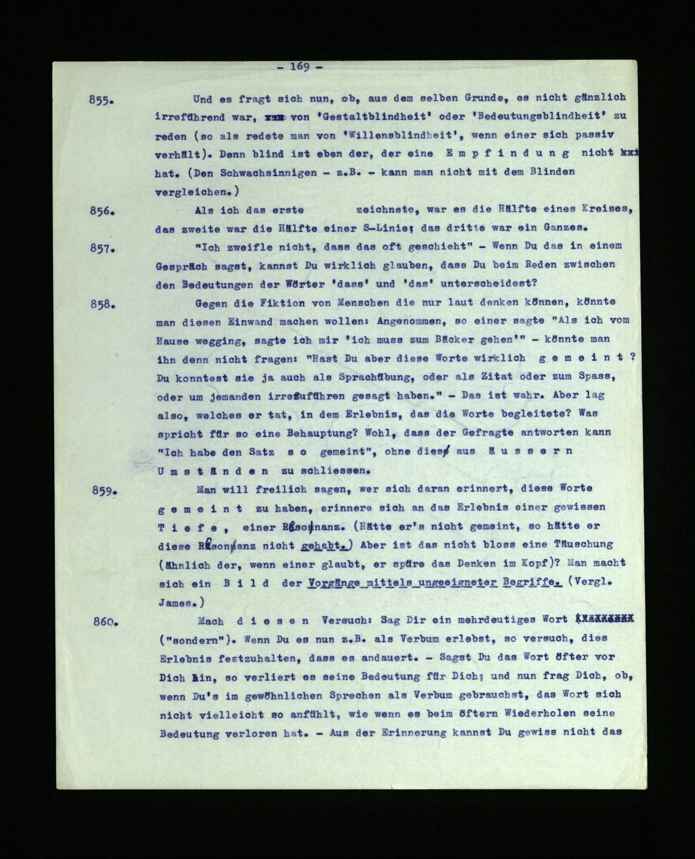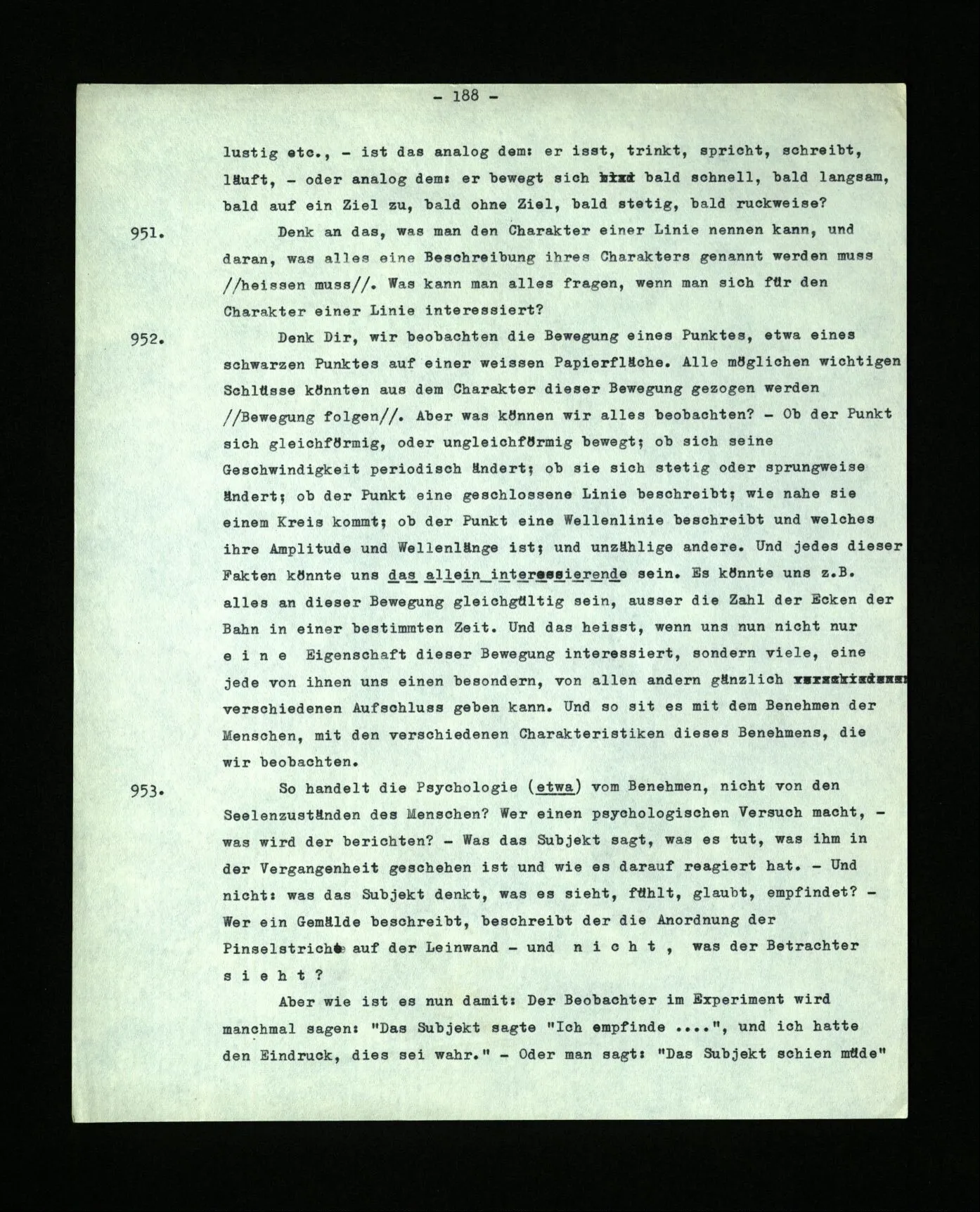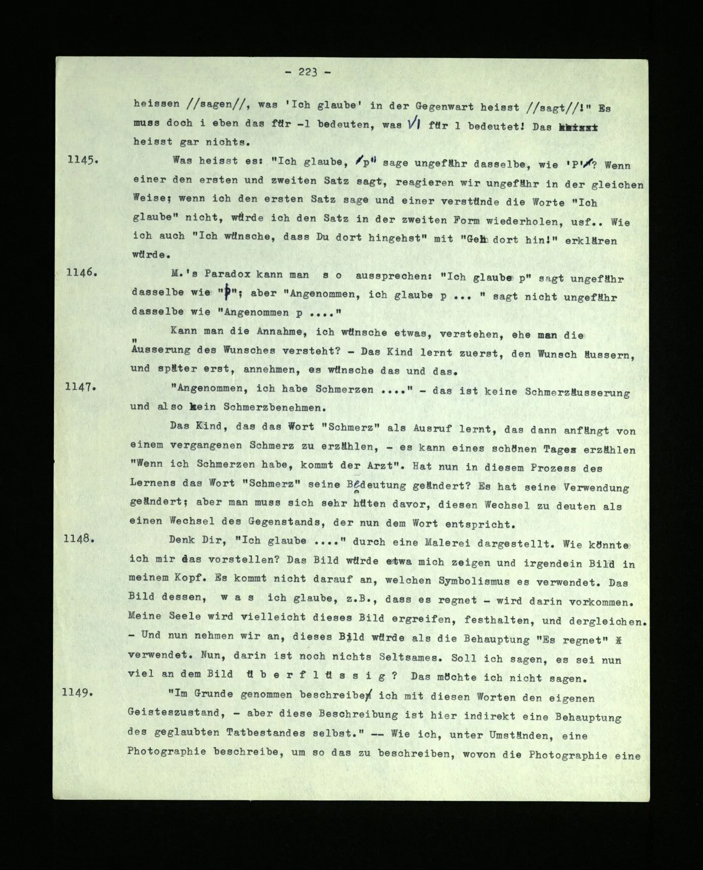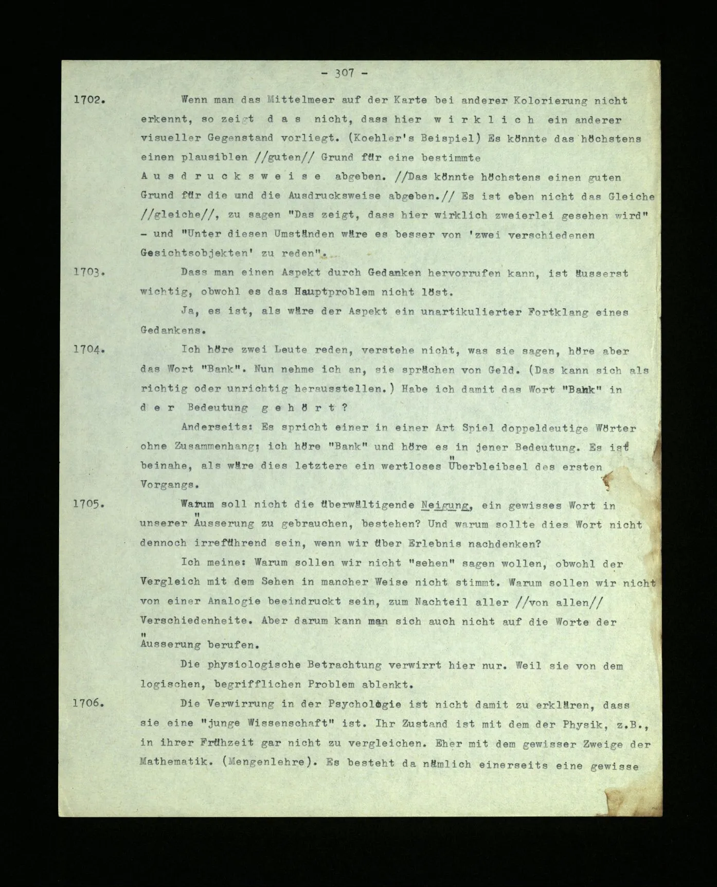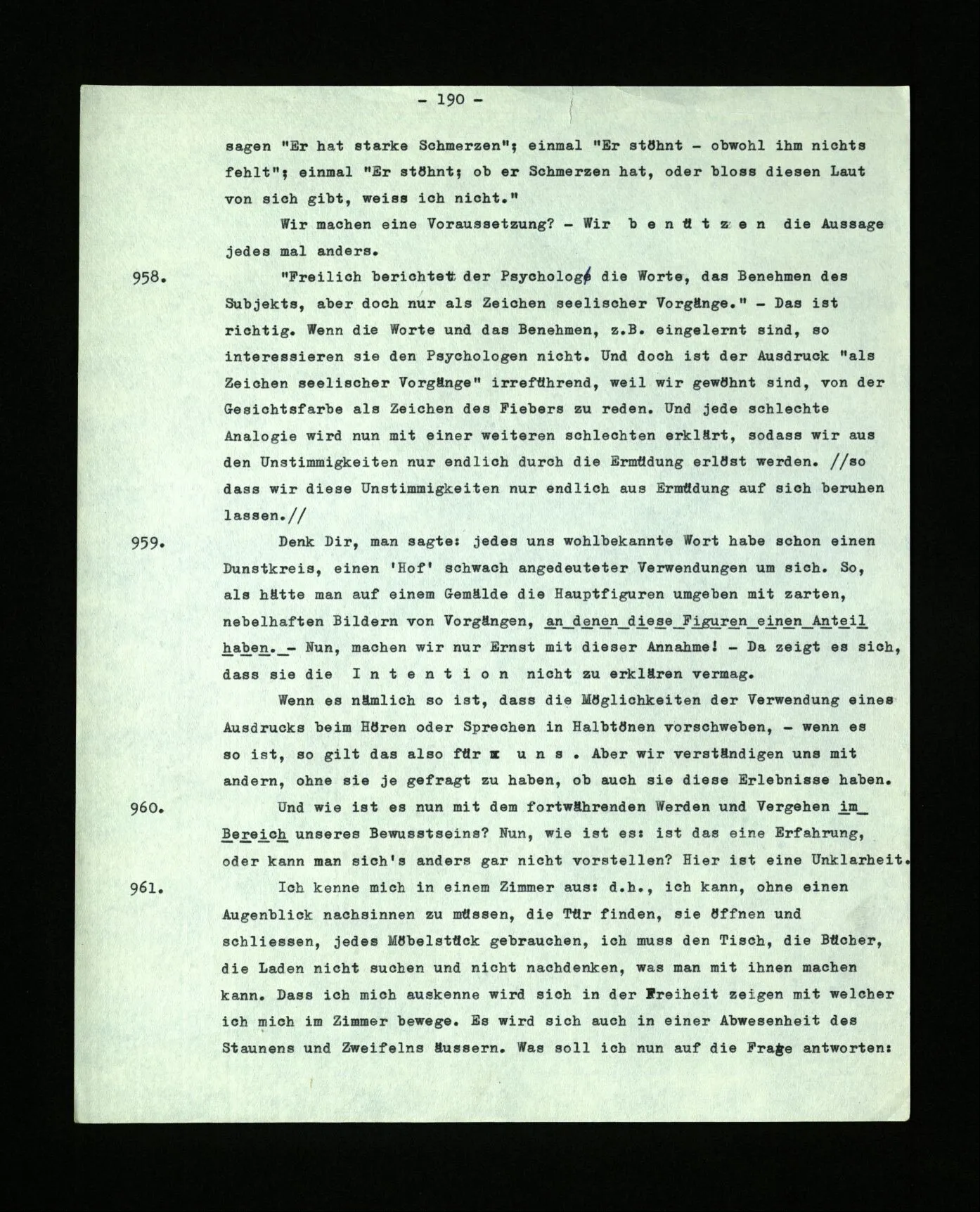 1774. Wenn jemand sagt: Die Form, die Farbe, die Organisation, der Ausdruck, sind doch alle, offenbar, (für jeden Unvoreingenommenen) Eigenschaften, Züge, des subjektiv Gesehenen, des unmittelbaren Gesichtsobjekts, – so verrät ihn hier das Wort “offenbar”. “Offenbar” ist es darum, weil’s jeder zugibt; und er gibt es nur durch den Sprachgebrauch zu. Man begründet also hier einen Satz durch ein Bild.