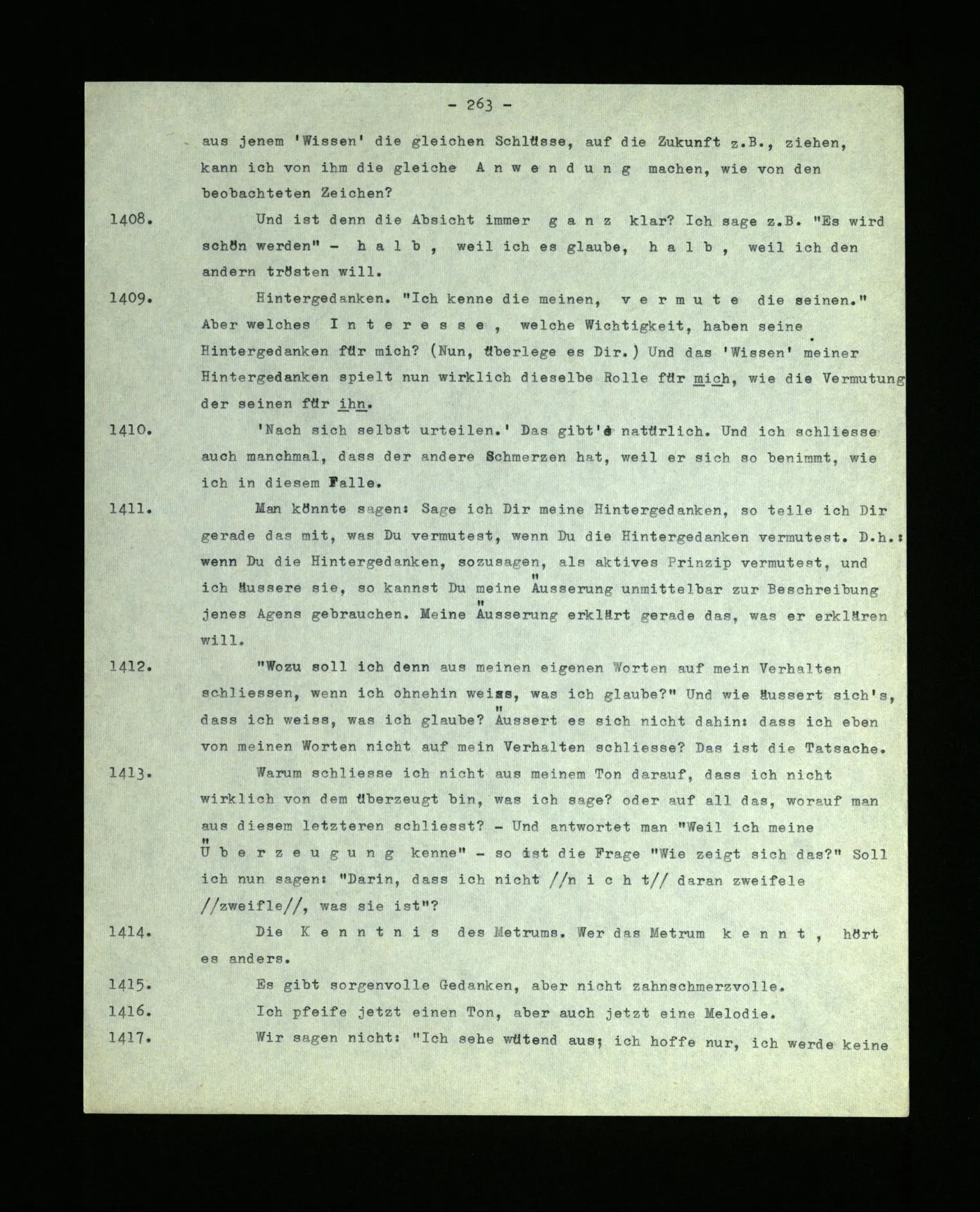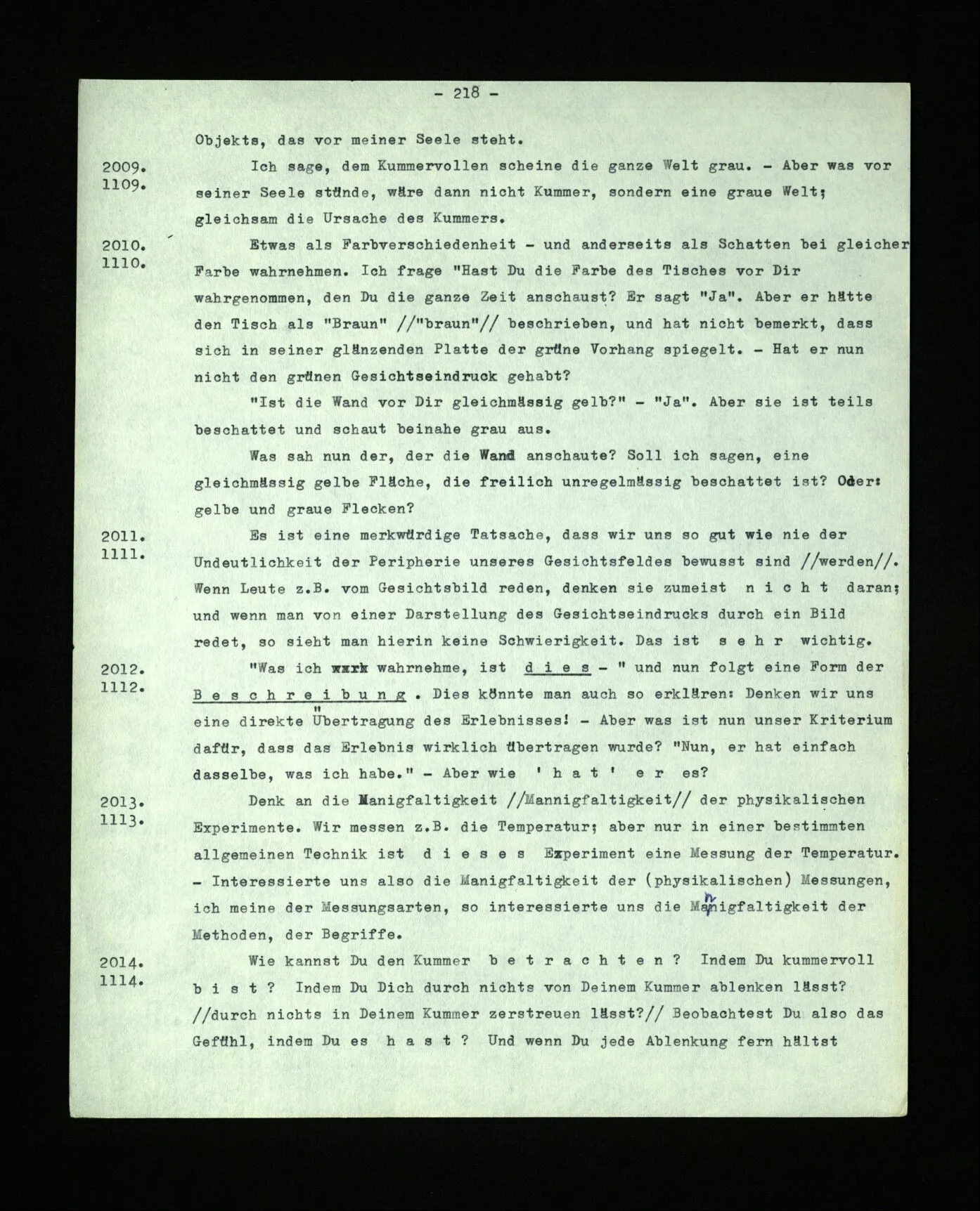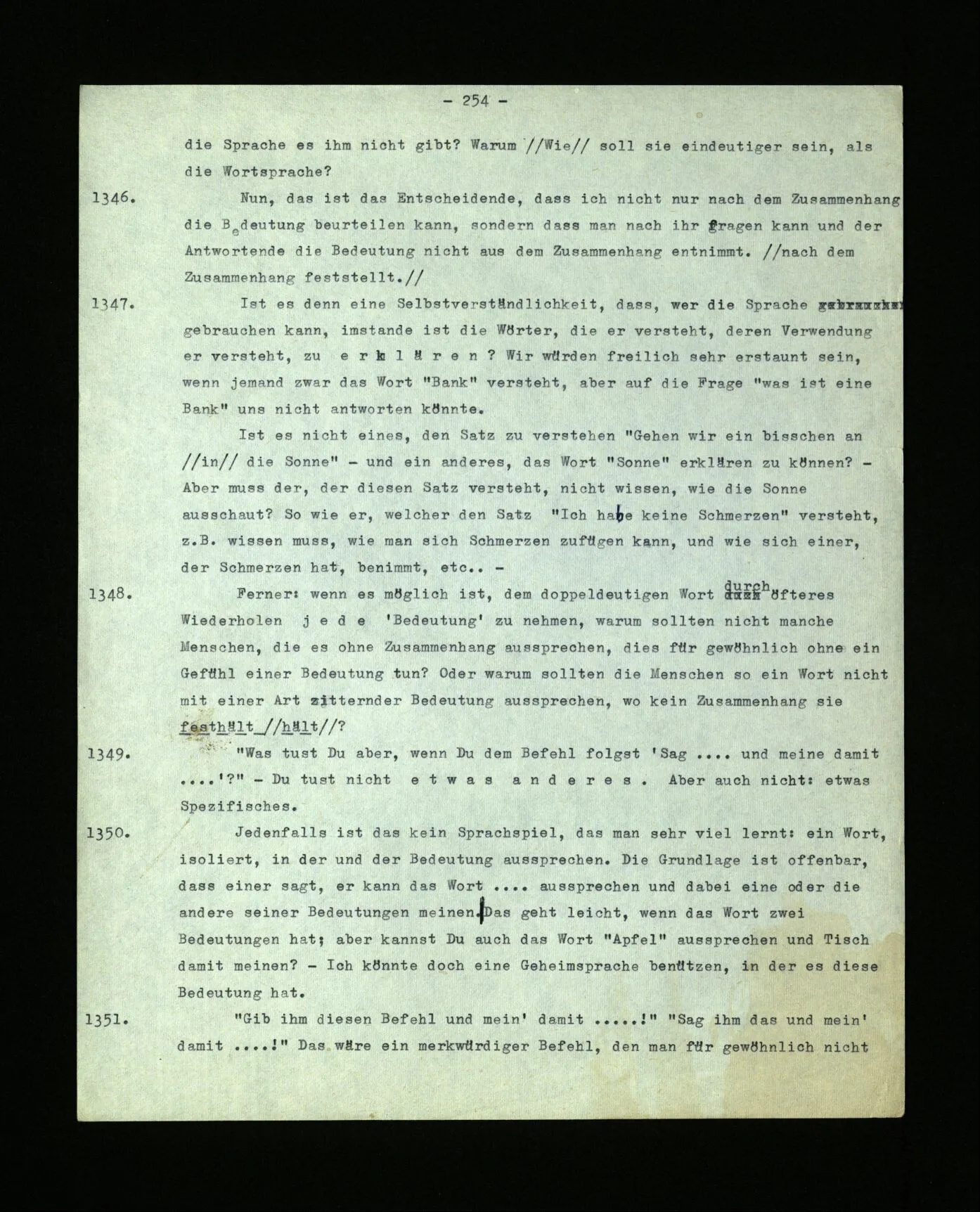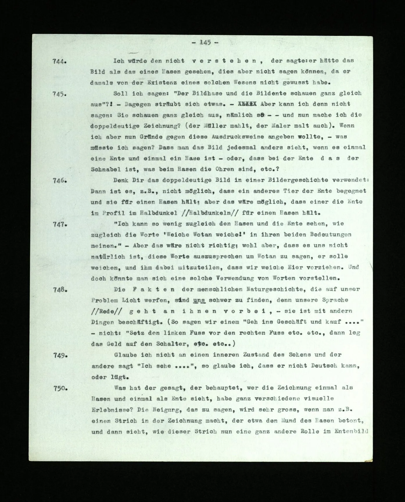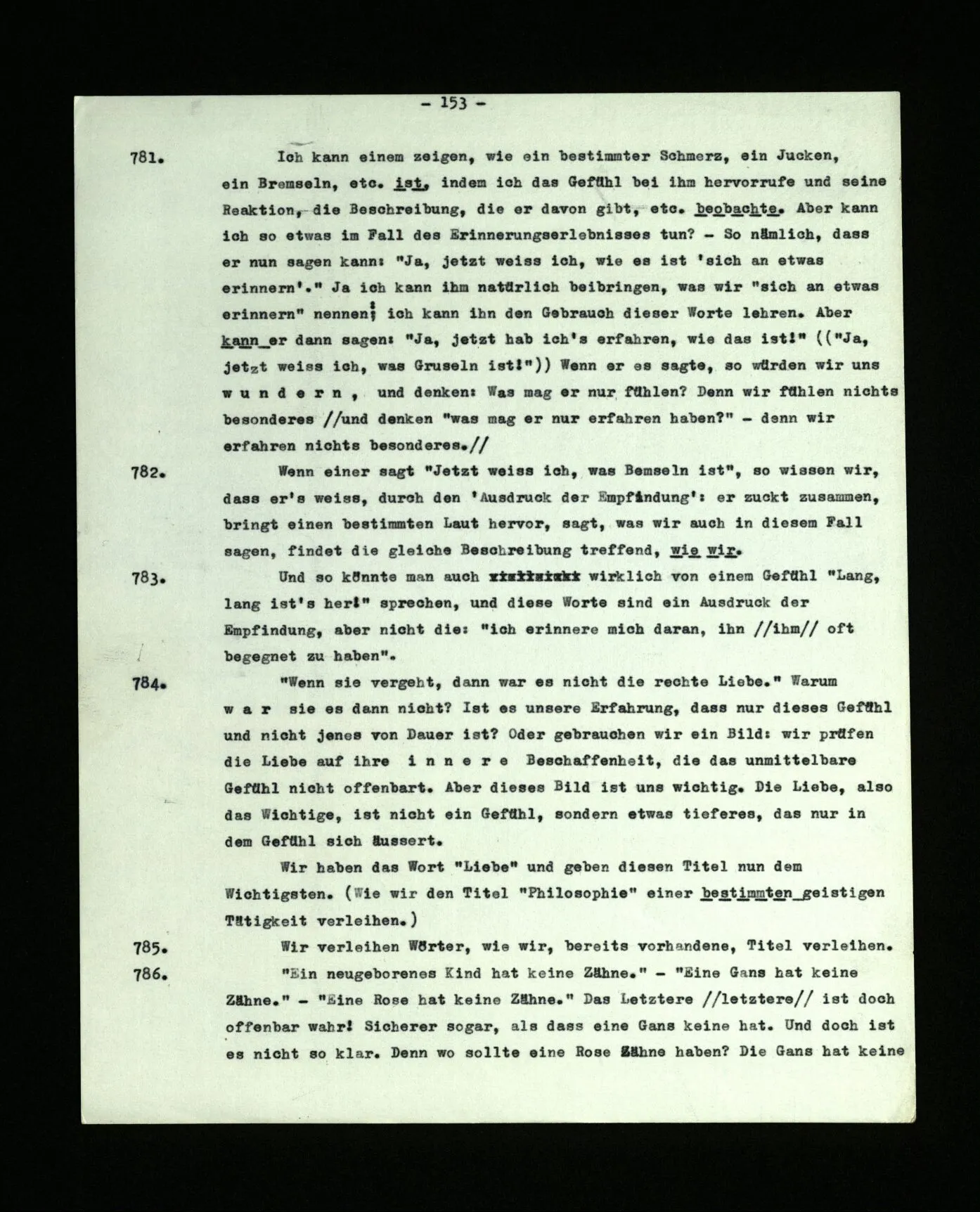 1774. Wenn jemand sagt: Die Form, die Farbe, die Organisation, der Ausdruck, sind doch alle, offenbar, (für jeden Unvoreingenommenen) Eigenschaften, Züge, des subjektiv Gesehenen, des unmittelbaren Gesichtsobjekts, – so verrät ihn hier das Wort “offenbar”. “Offenbar” ist es darum, weil’s jeder zugibt; und er gibt es nur durch den Sprachgebrauch zu. Man begründet also hier einen Satz durch ein Bild.