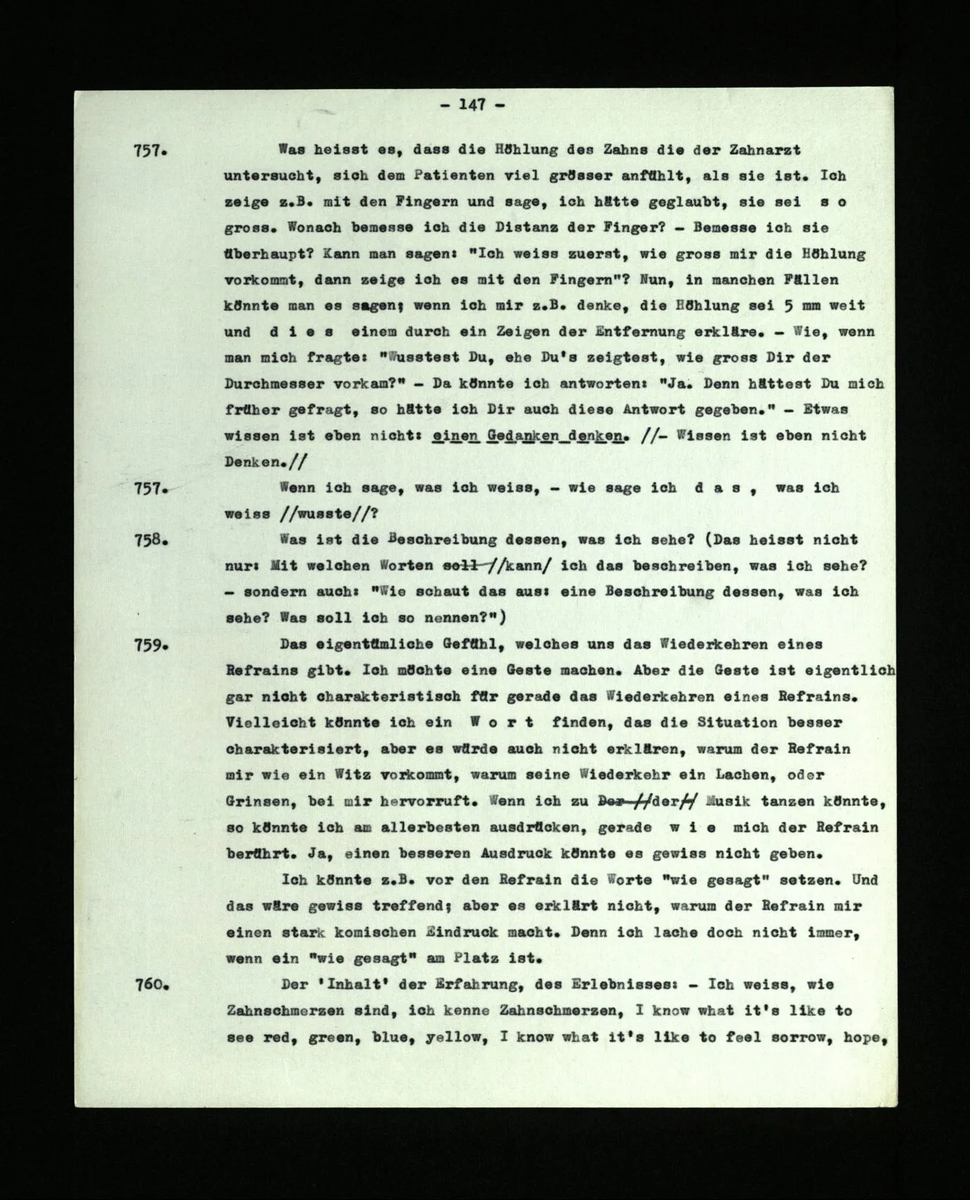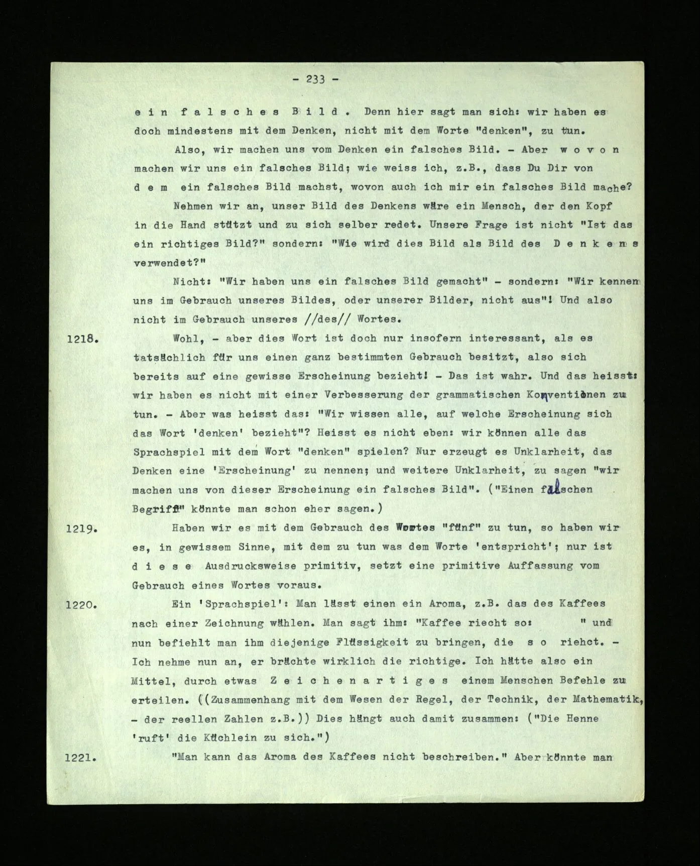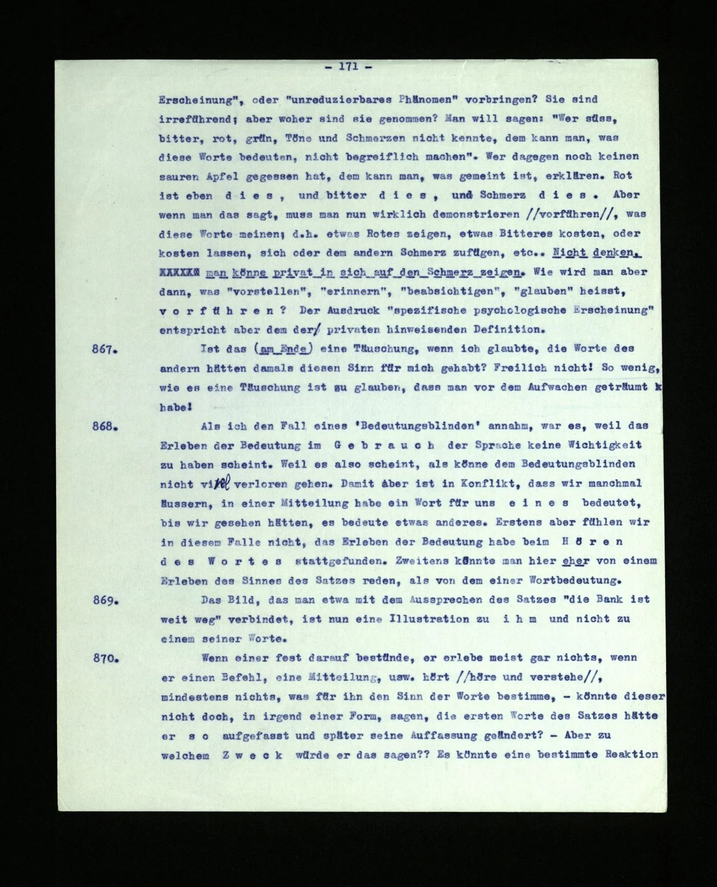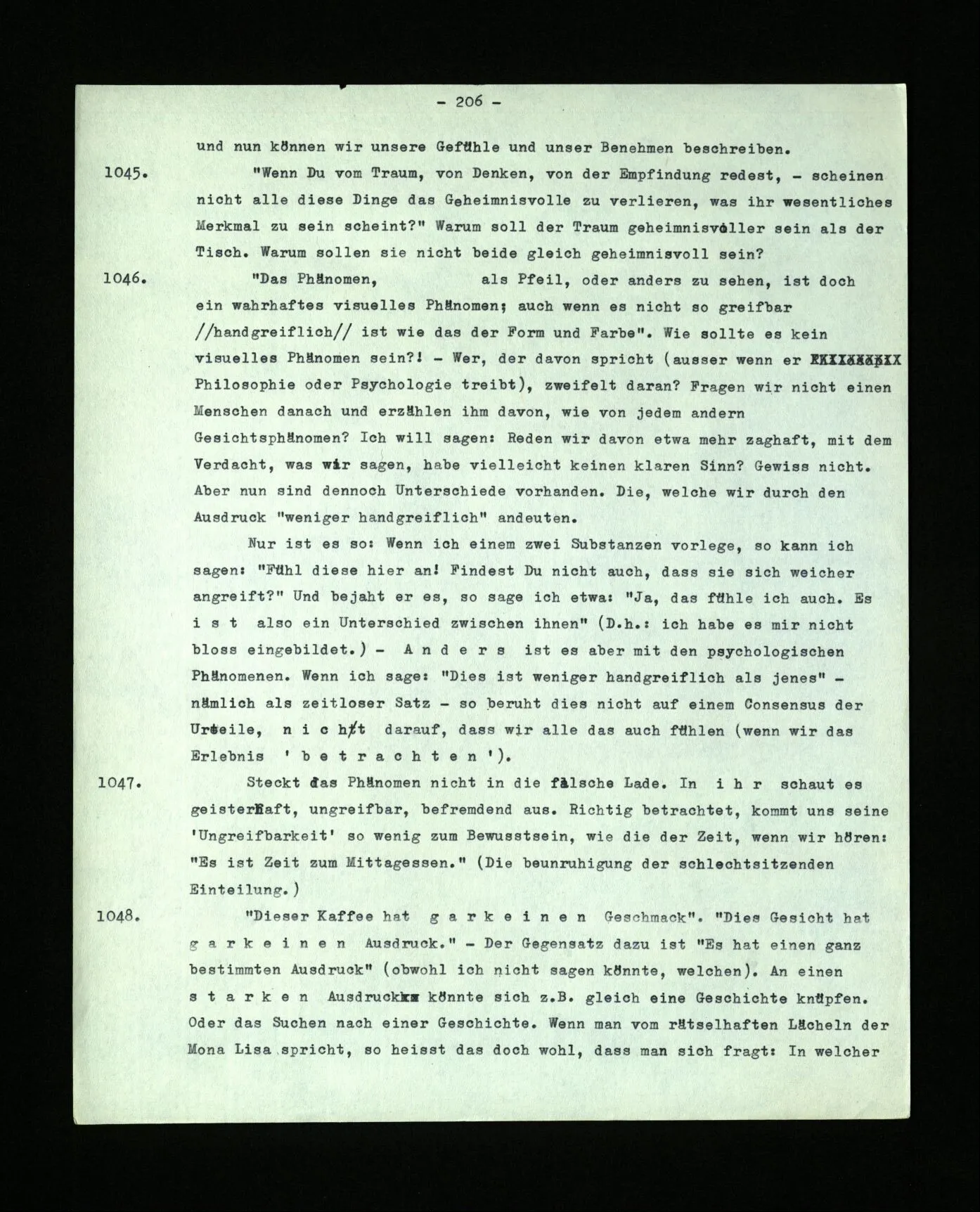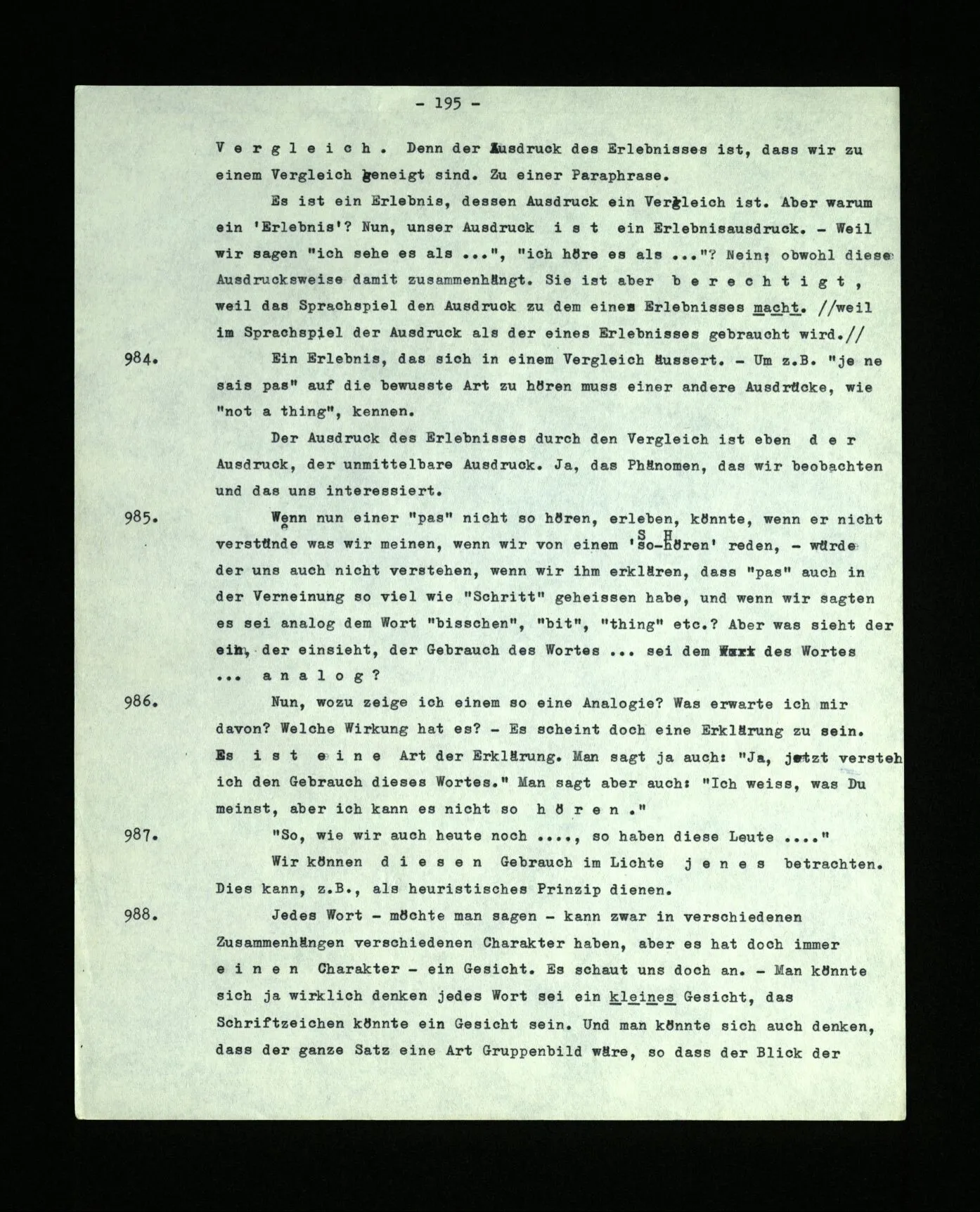 1774. Wenn jemand sagt: Die Form, die Farbe, die Organisation, der Ausdruck, sind doch alle, offenbar, (für jeden Unvoreingenommenen) Eigenschaften, Züge, des subjektiv Gesehenen, des unmittelbaren Gesichtsobjekts, – so verrät ihn hier das Wort “offenbar”. “Offenbar” ist es darum, weil’s jeder zugibt; und er gibt es nur durch den Sprachgebrauch zu. Man begründet also hier einen Satz durch ein Bild.