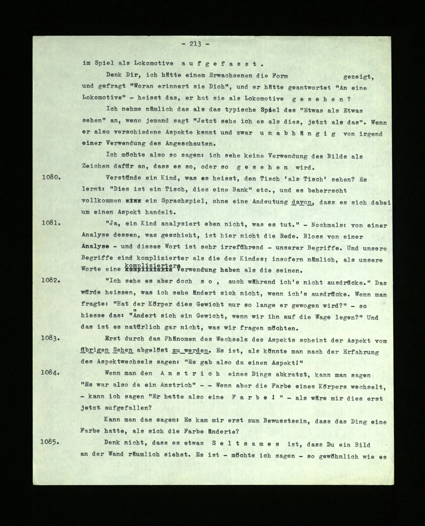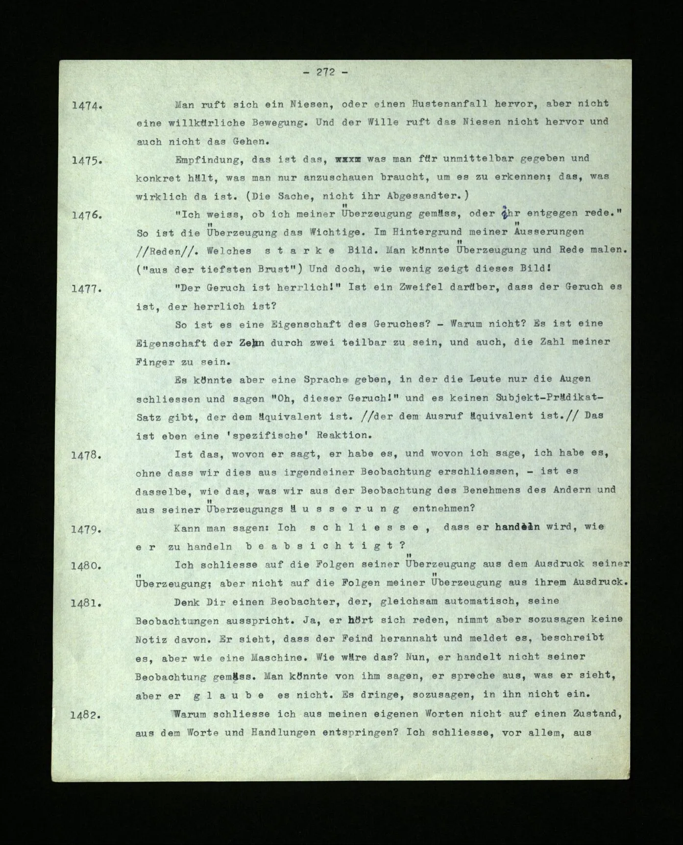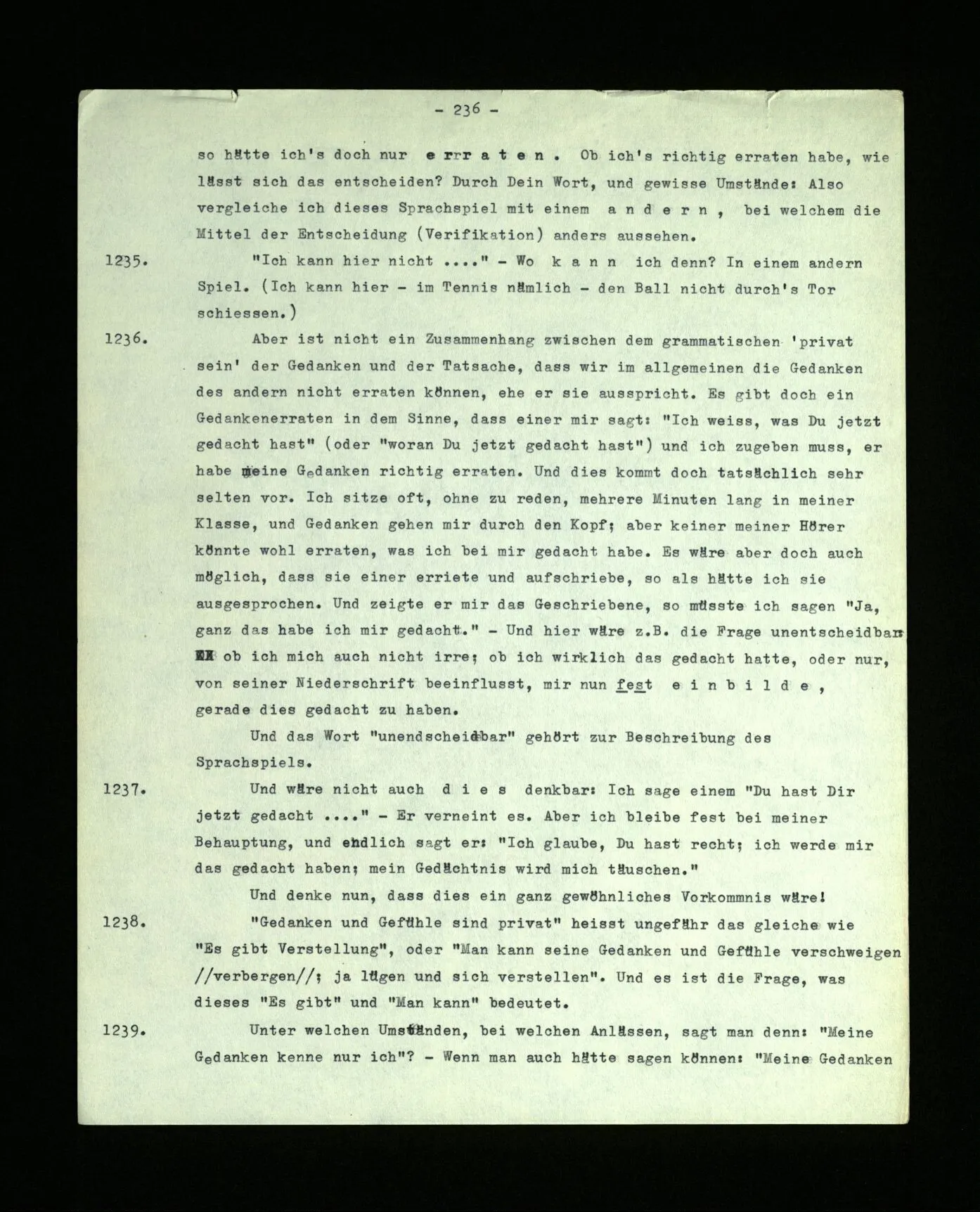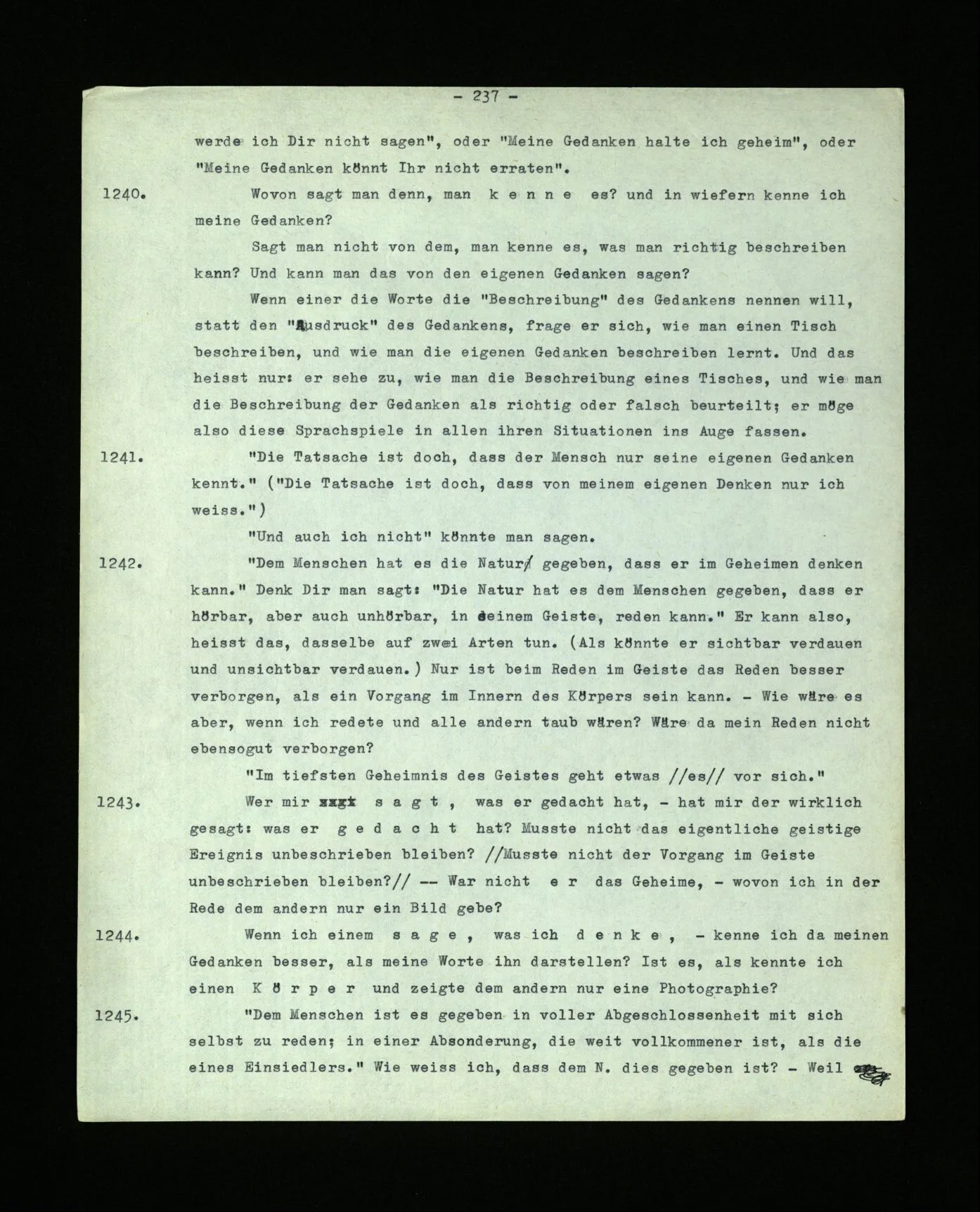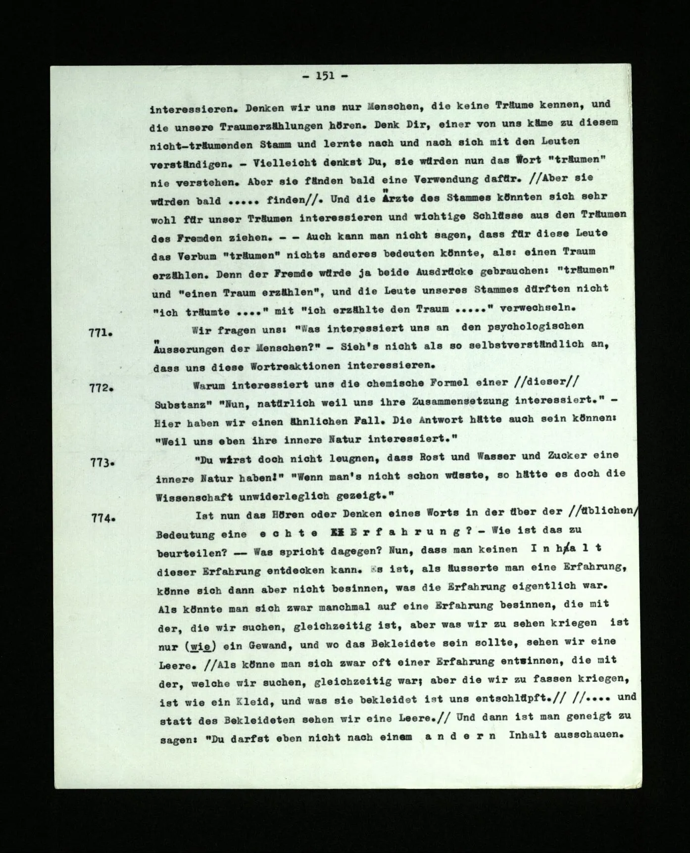 1774. Wenn jemand sagt: Die Form, die Farbe, die Organisation, der Ausdruck, sind doch alle, offenbar, (für jeden Unvoreingenommenen) Eigenschaften, Züge, des subjektiv Gesehenen, des unmittelbaren Gesichtsobjekts, – so verrät ihn hier das Wort “offenbar”. “Offenbar” ist es darum, weil’s jeder zugibt; und er gibt es nur durch den Sprachgebrauch zu. Man begründet also hier einen Satz durch ein Bild.