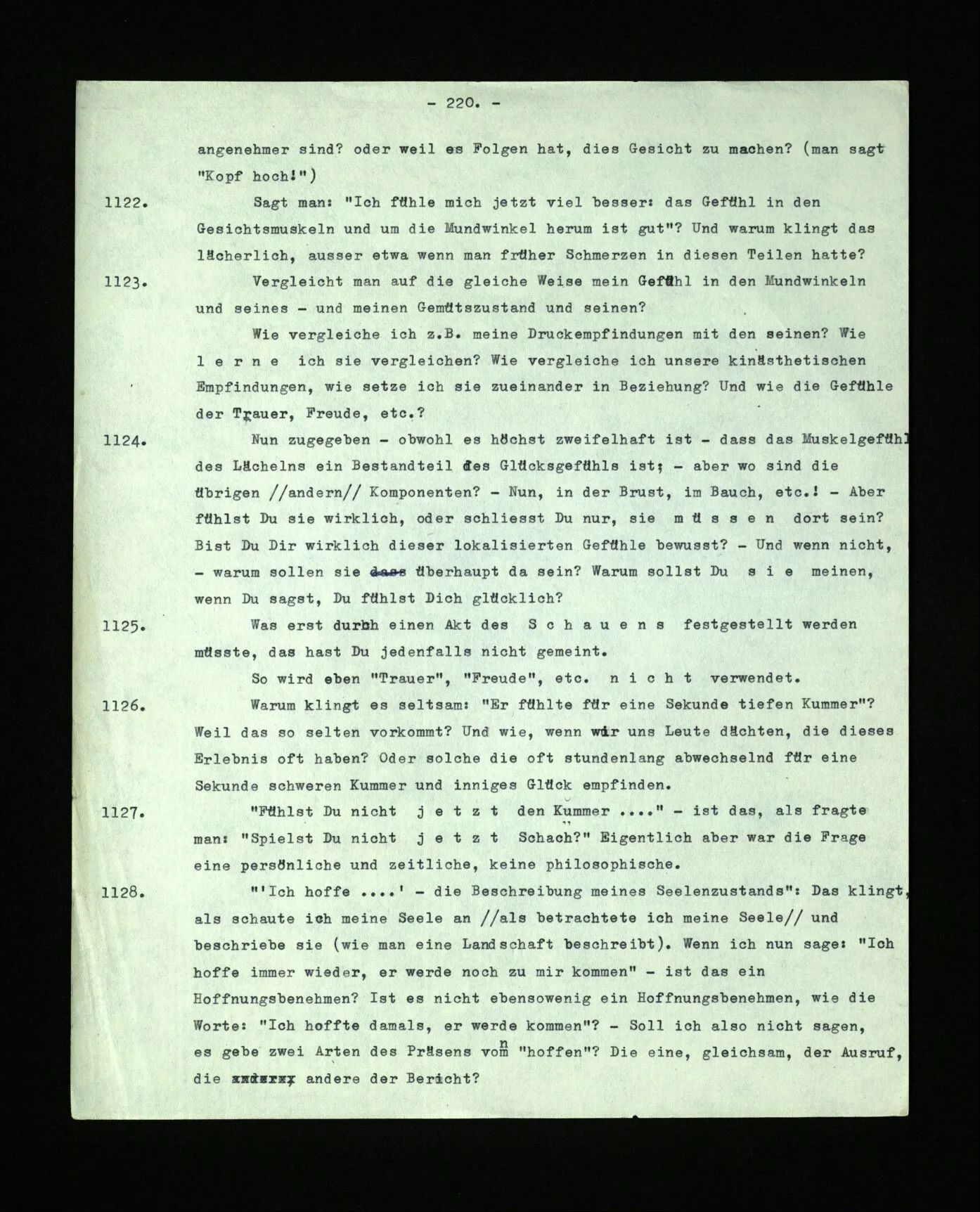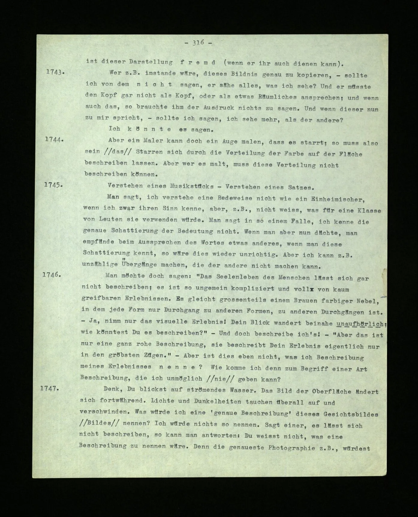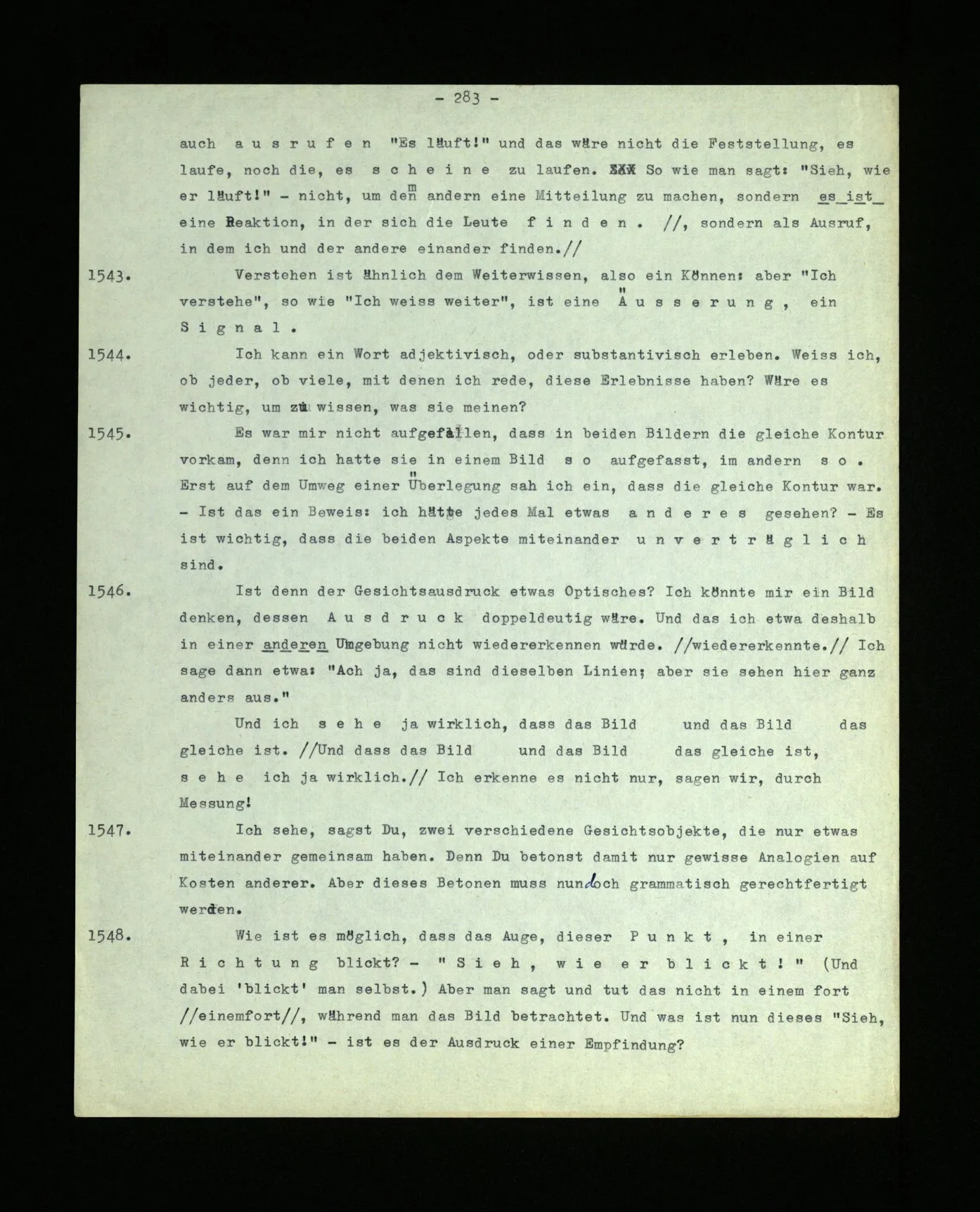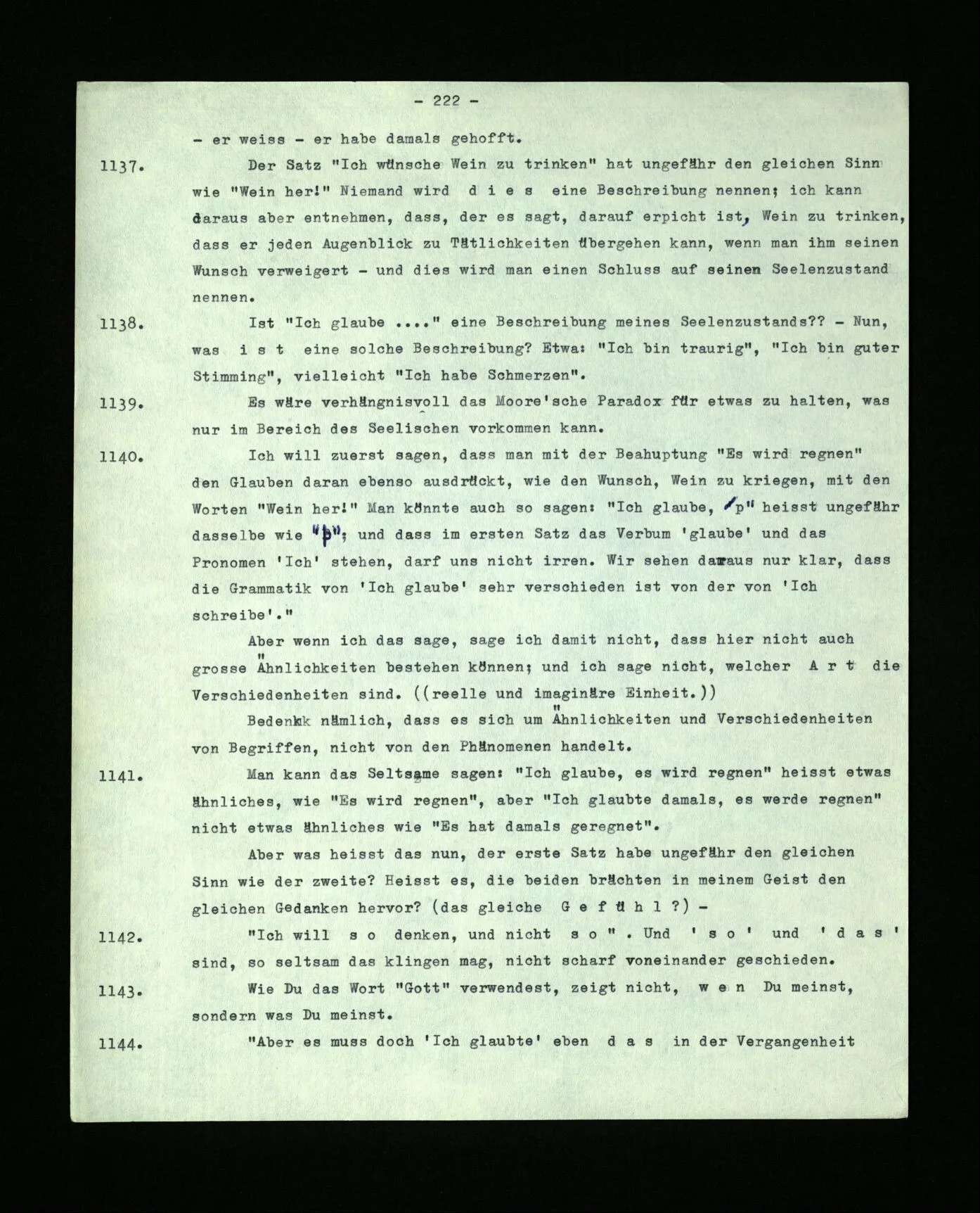 1774. Wenn jemand sagt: Die Form, die Farbe, die Organisation, der Ausdruck, sind doch alle, offenbar, (für jeden Unvoreingenommenen) Eigenschaften, Züge, des subjektiv Gesehenen, des unmittelbaren Gesichtsobjekts, – so verrät ihn hier das Wort “offenbar”. “Offenbar” ist es darum, weil’s jeder zugibt; und er gibt es nur durch den Sprachgebrauch zu. Man begründet also hier einen Satz durch ein Bild.