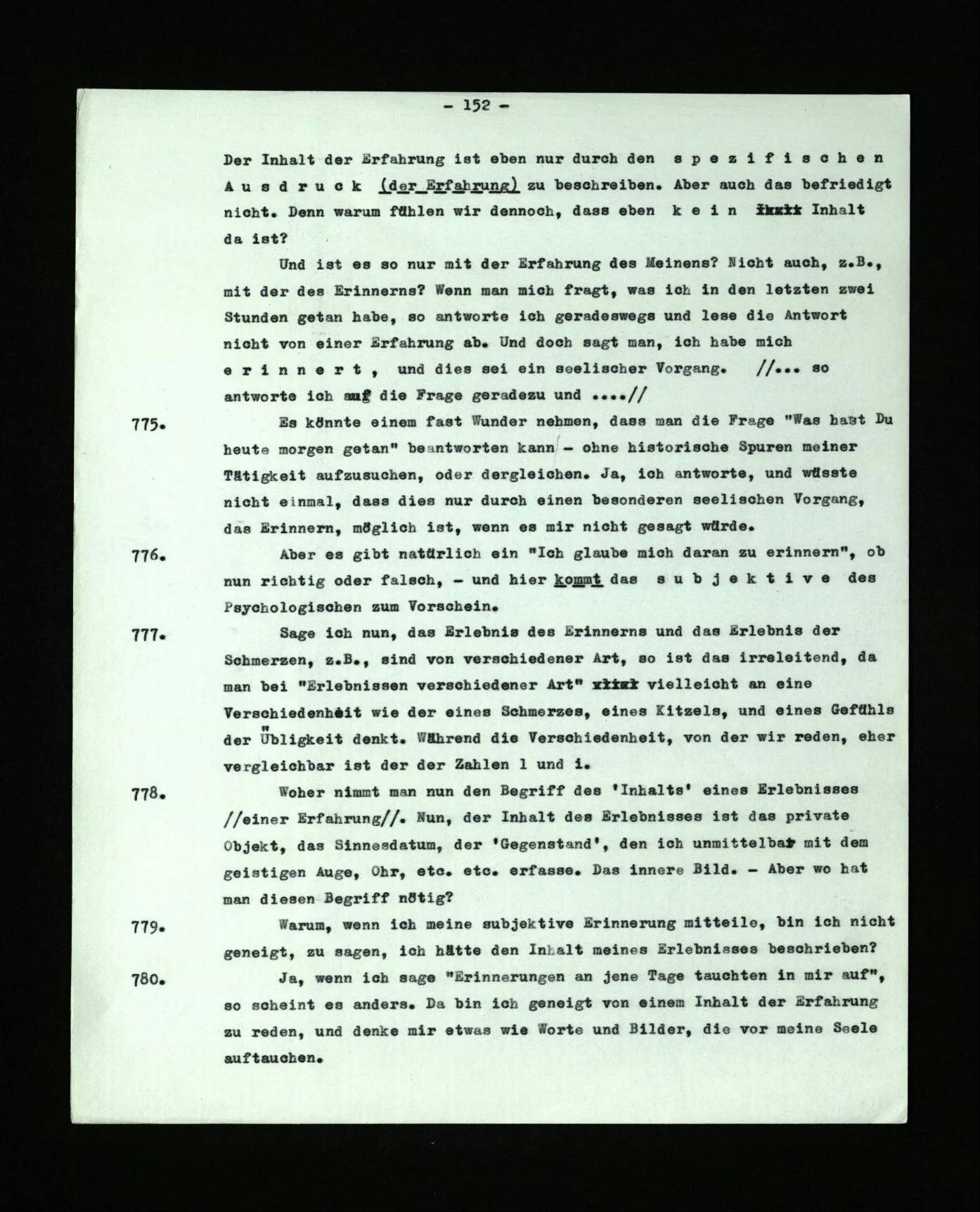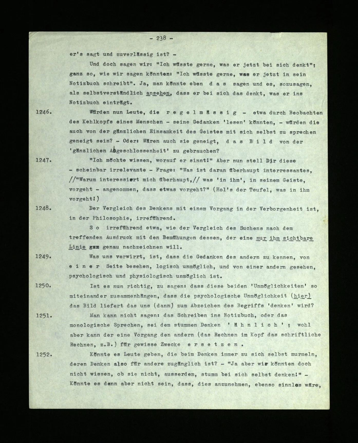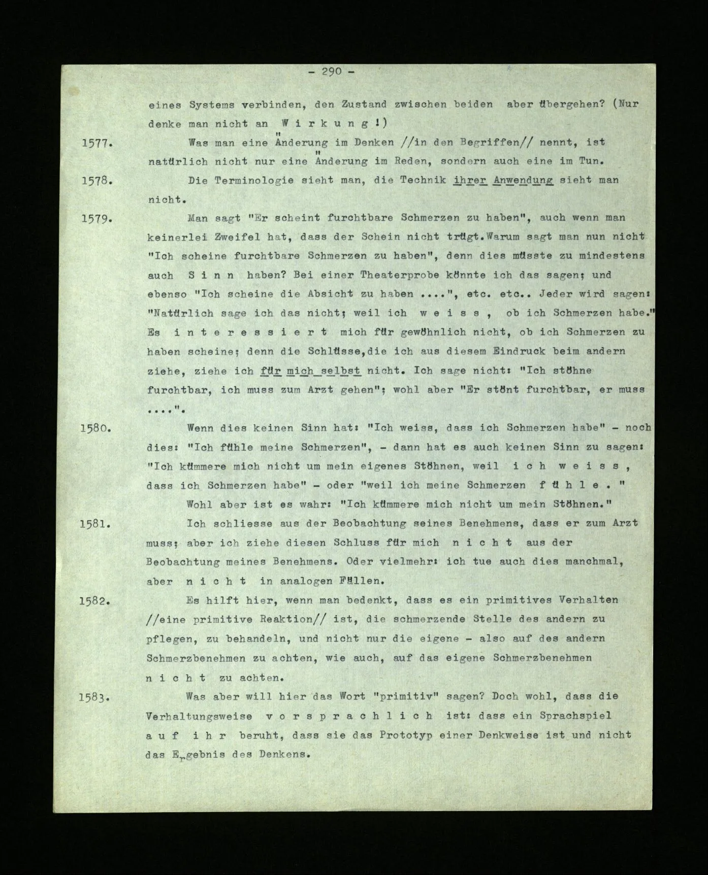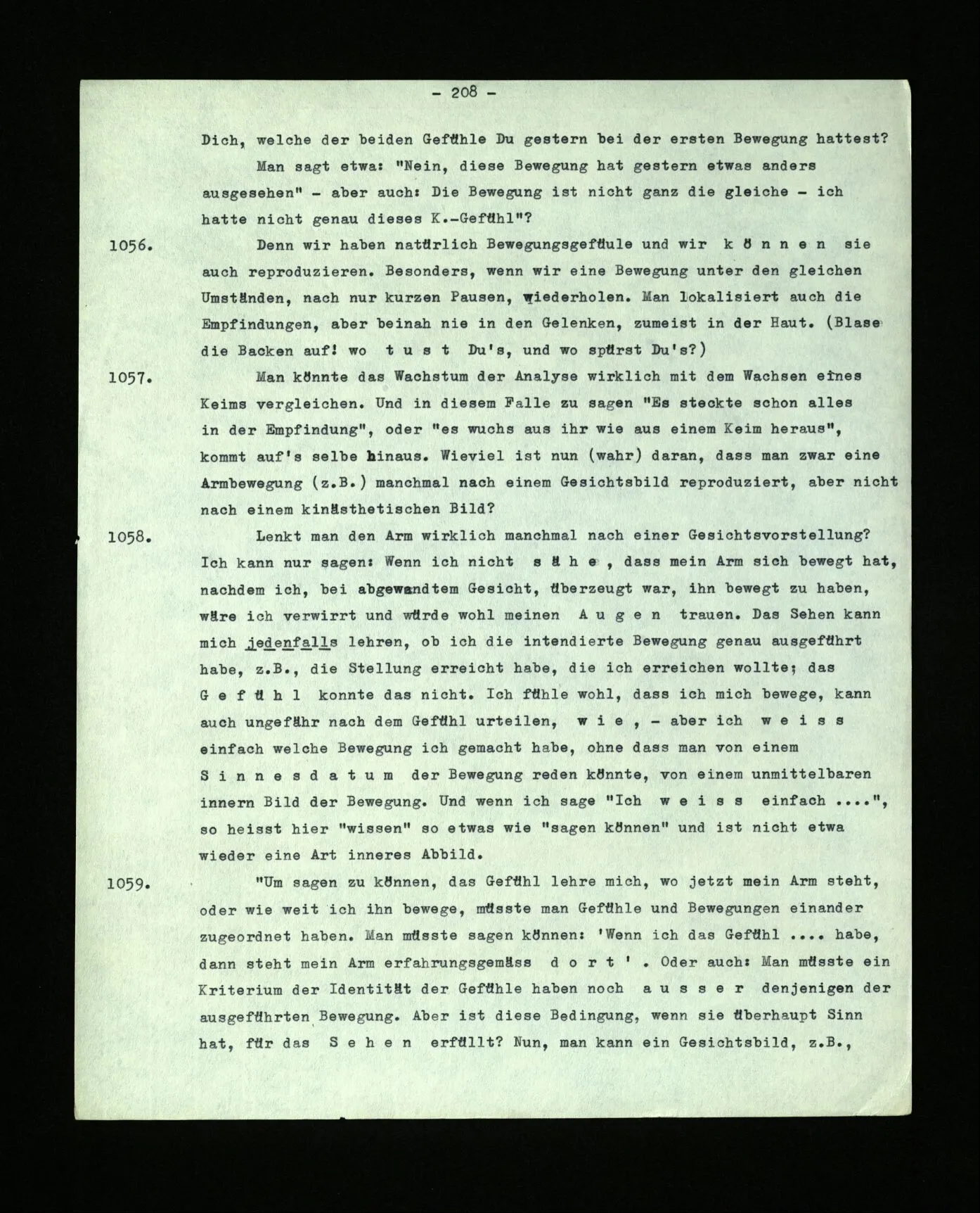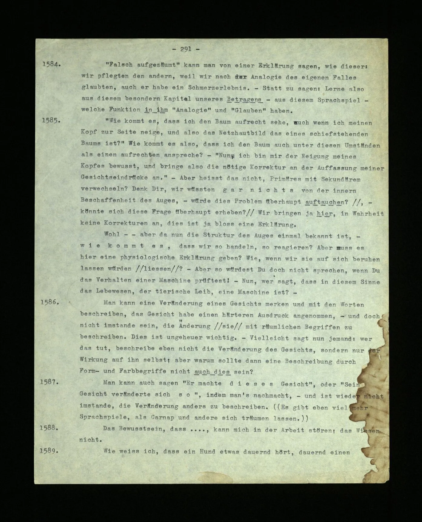 1774. Wenn jemand sagt: Die Form, die Farbe, die Organisation, der Ausdruck, sind doch alle, offenbar, (für jeden Unvoreingenommenen) Eigenschaften, Züge, des subjektiv Gesehenen, des unmittelbaren Gesichtsobjekts, – so verrät ihn hier das Wort “offenbar”. “Offenbar” ist es darum, weil’s jeder zugibt; und er gibt es nur durch den Sprachgebrauch zu. Man begründet also hier einen Satz durch ein Bild.