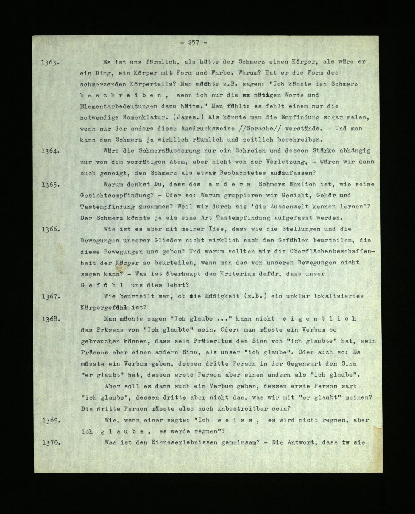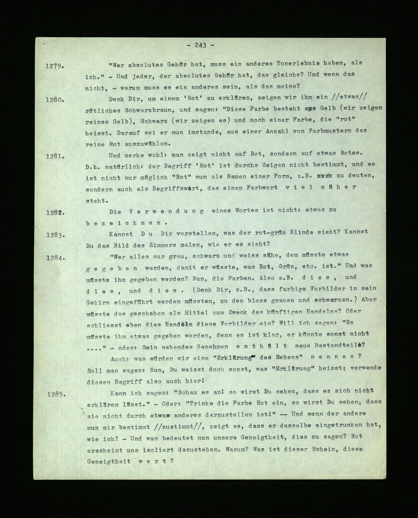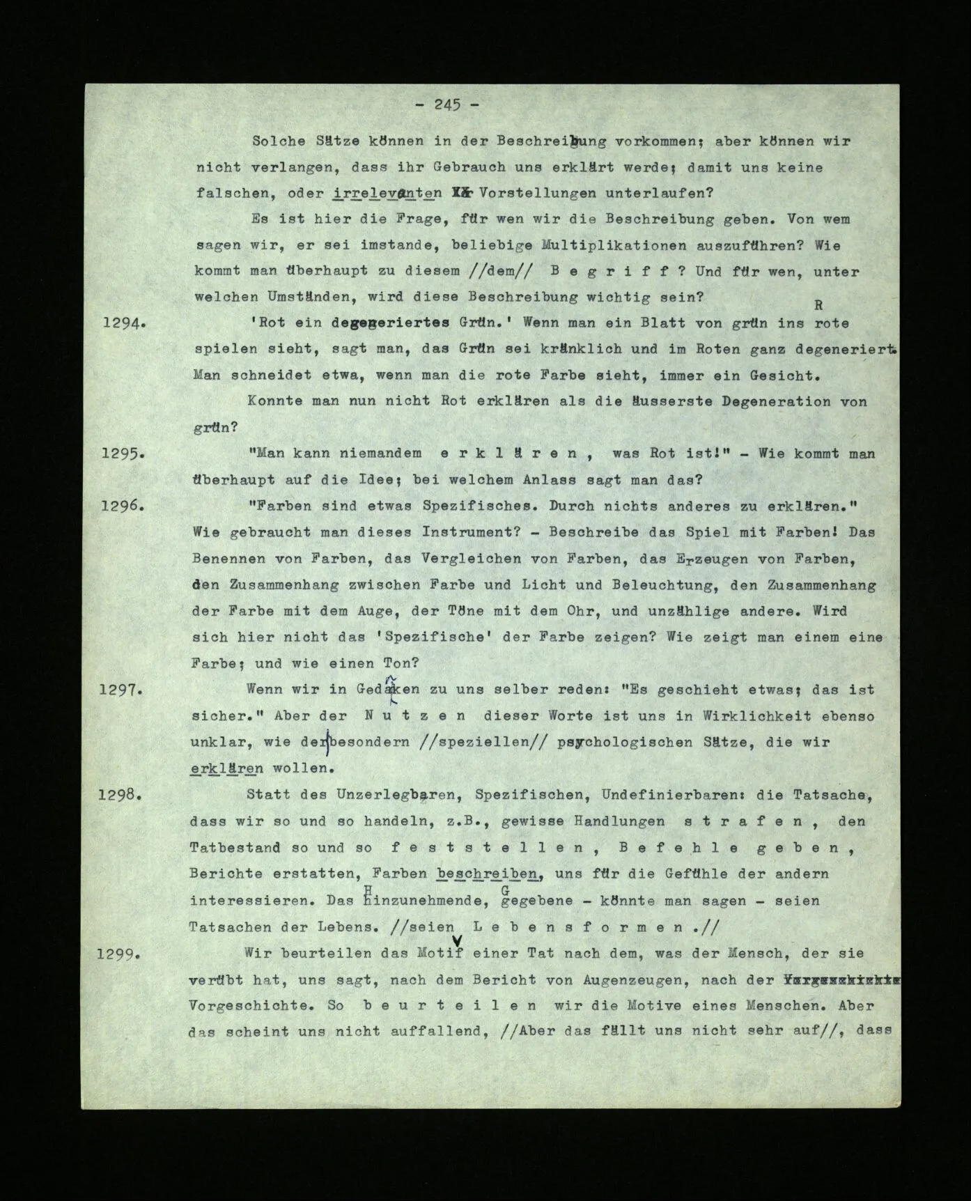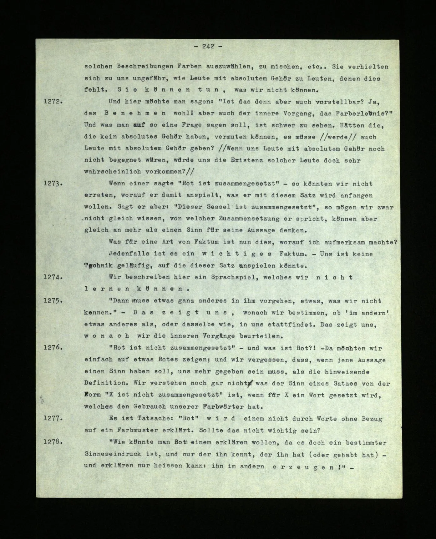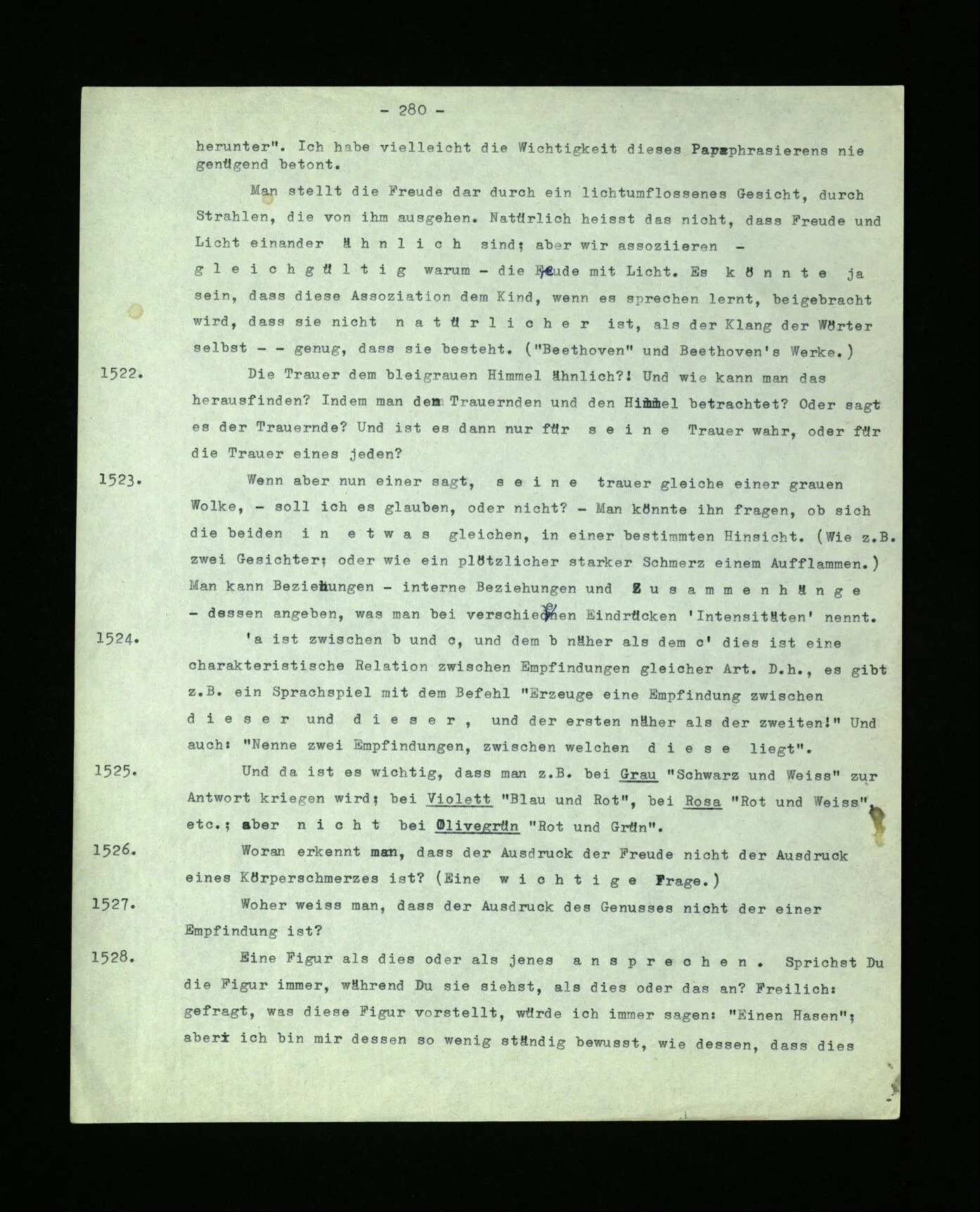1774. Wenn jemand sagt: Die Form, die Farbe, die Organisation, der Ausdruck, sind doch alle, offenbar, (für jeden Unvoreingenommenen) Eigenschaften, Züge, des subjektiv Gesehenen, des unmittelbaren Gesichtsobjekts, – so verrät ihn hier das Wort “offenbar”. “Offenbar” ist es darum, weil’s jeder zugibt; und er gibt es nur durch den Sprachgebrauch zu. Man begründet also hier einen Satz durch ein Bild.