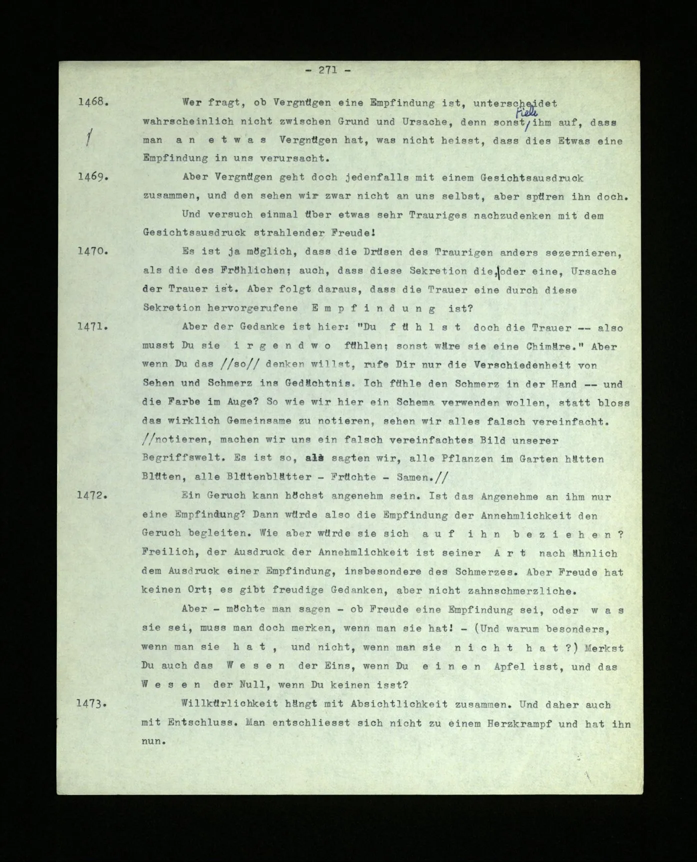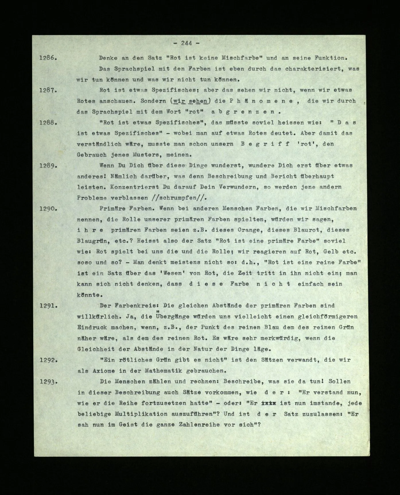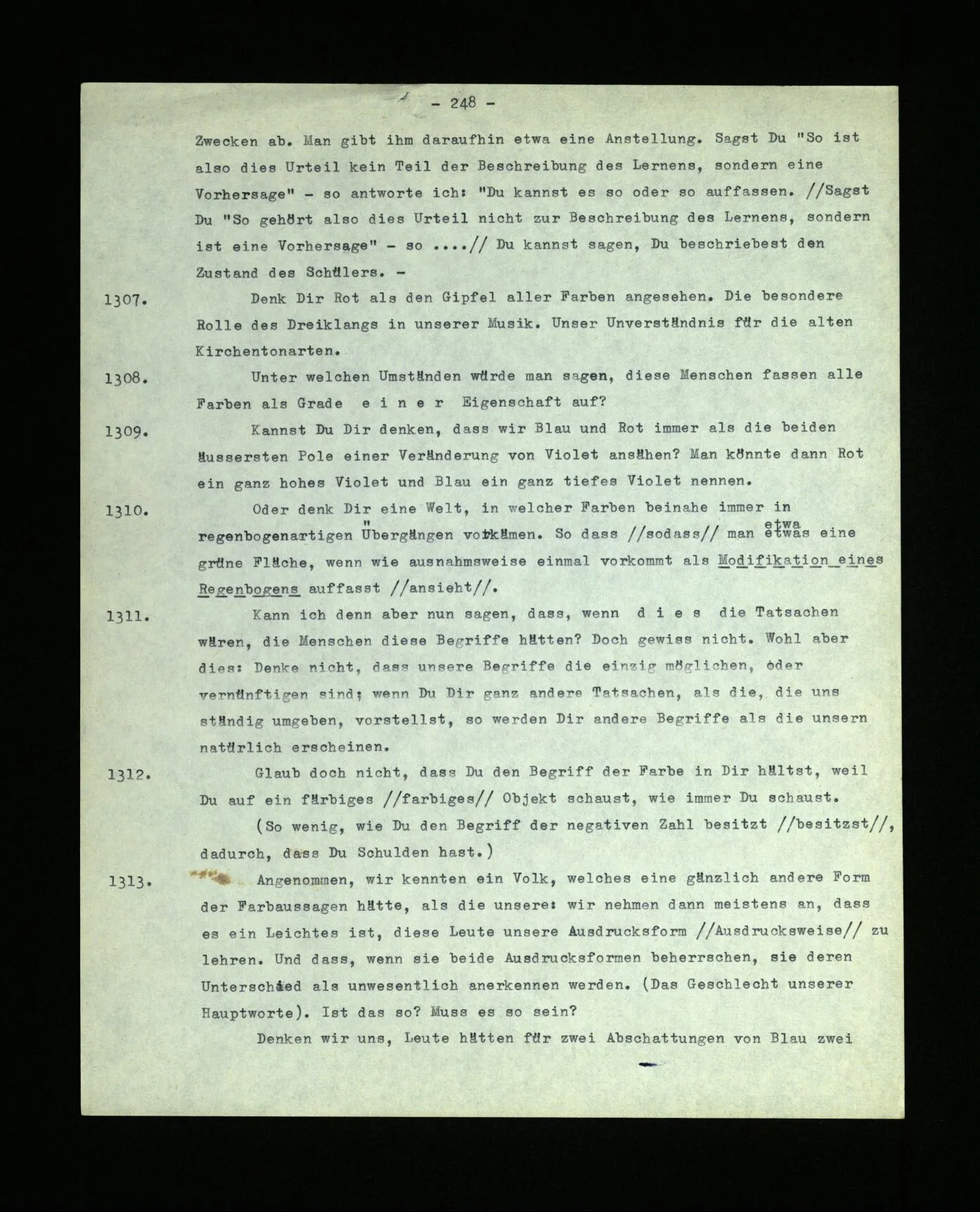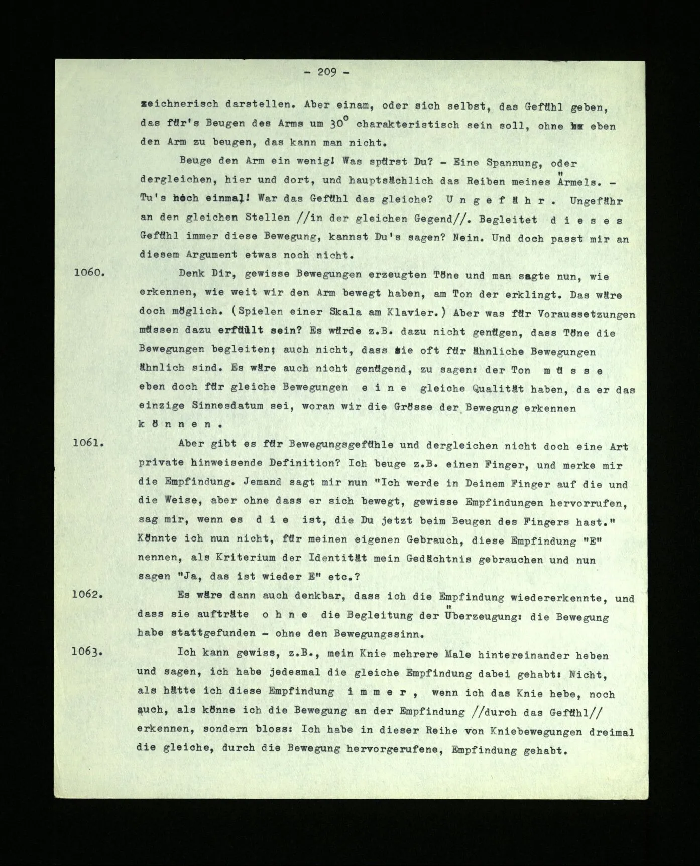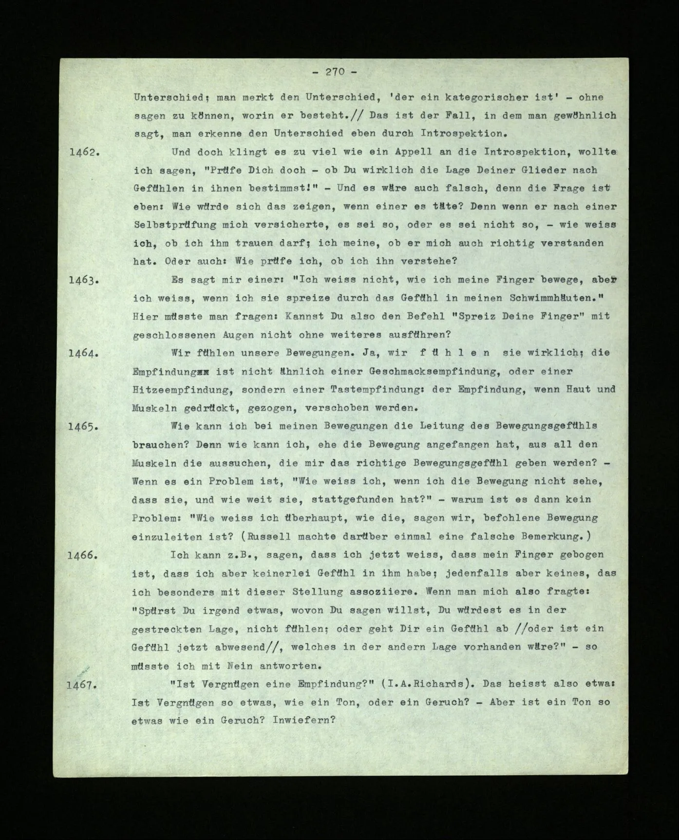1774. Wenn jemand sagt: Die Form, die Farbe, die Organisation, der Ausdruck, sind doch alle, offenbar, (für jeden Unvoreingenommenen) Eigenschaften, Züge, des subjektiv Gesehenen, des unmittelbaren Gesichtsobjekts, – so verrät ihn hier das Wort “offenbar”. “Offenbar” ist es darum, weil’s jeder zugibt; und er gibt es nur durch den Sprachgebrauch zu. Man begründet also hier einen Satz durch ein Bild.
