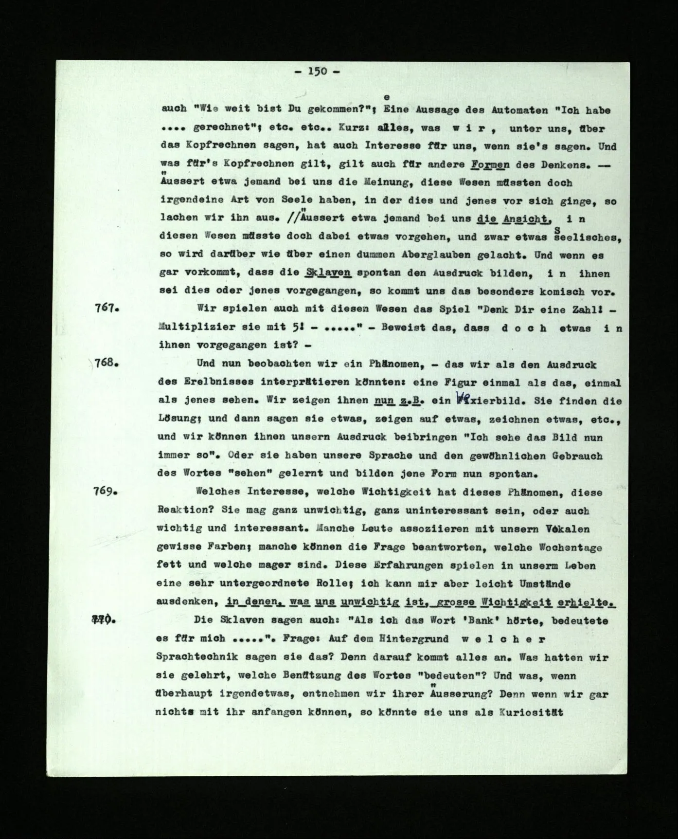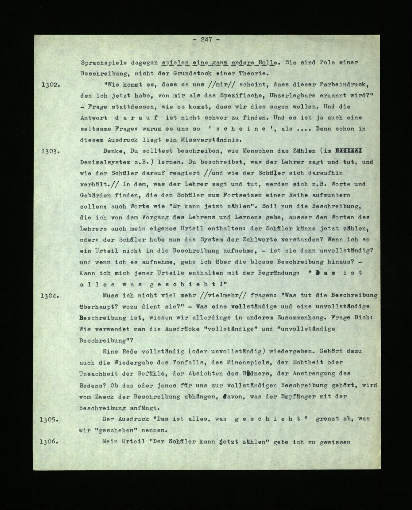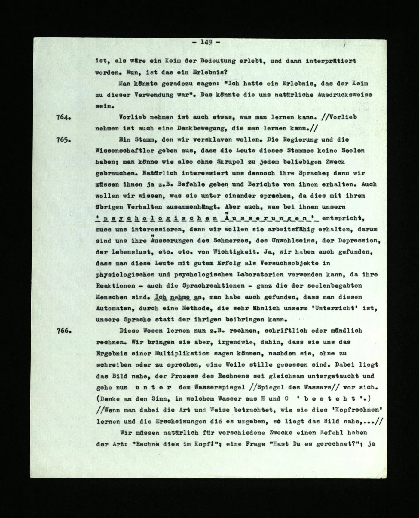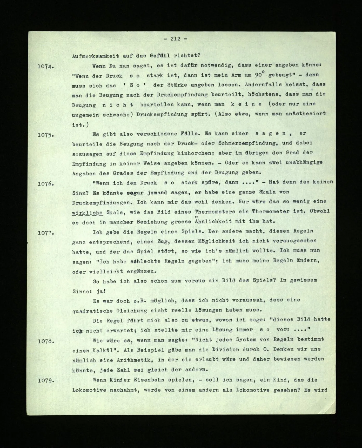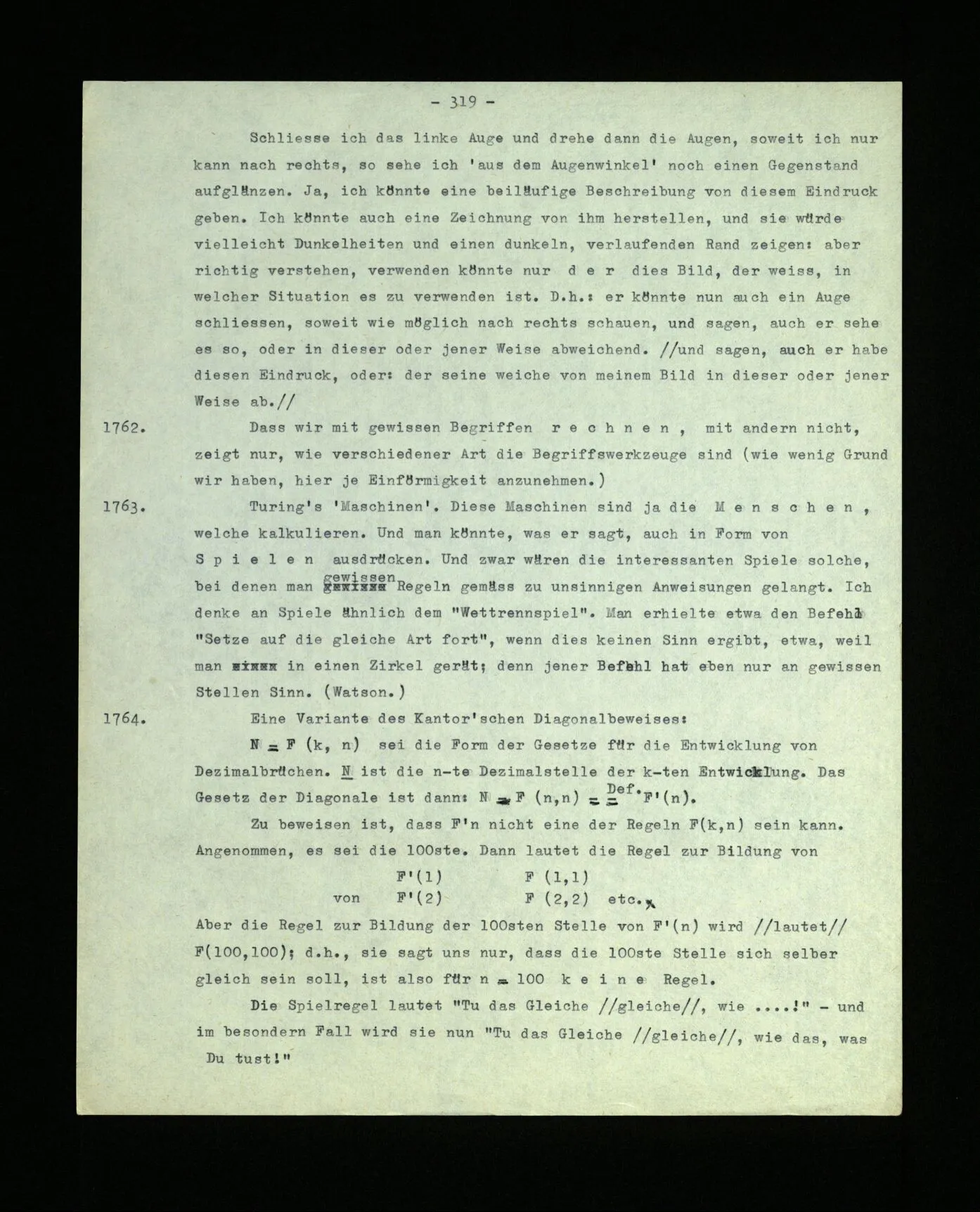 1763. Turing’s ‘Maschinen’. Diese Maschinen sind ja die Menschen, welche kalkulieren. Und man könnte, was er sagt, auch in Form von Spielen ausdrücken. Und zwar wären die interessanten Spiele solche, bei denen man gewissen Regeln gemäß zu unsinnigen Anweisungen gelangt. Ich denke an Spiele ähnlich dem “Wettrennspiel”. Man erhielte etwa den Befehl “Setze auf die gleiche Art fort”, wenn dies keinen Sinn ergibt, etwa, weil man in einen Zirkel gerät; denn jener Befehl hat eben nur an gewissen Stellen Sinn. (Watson.)