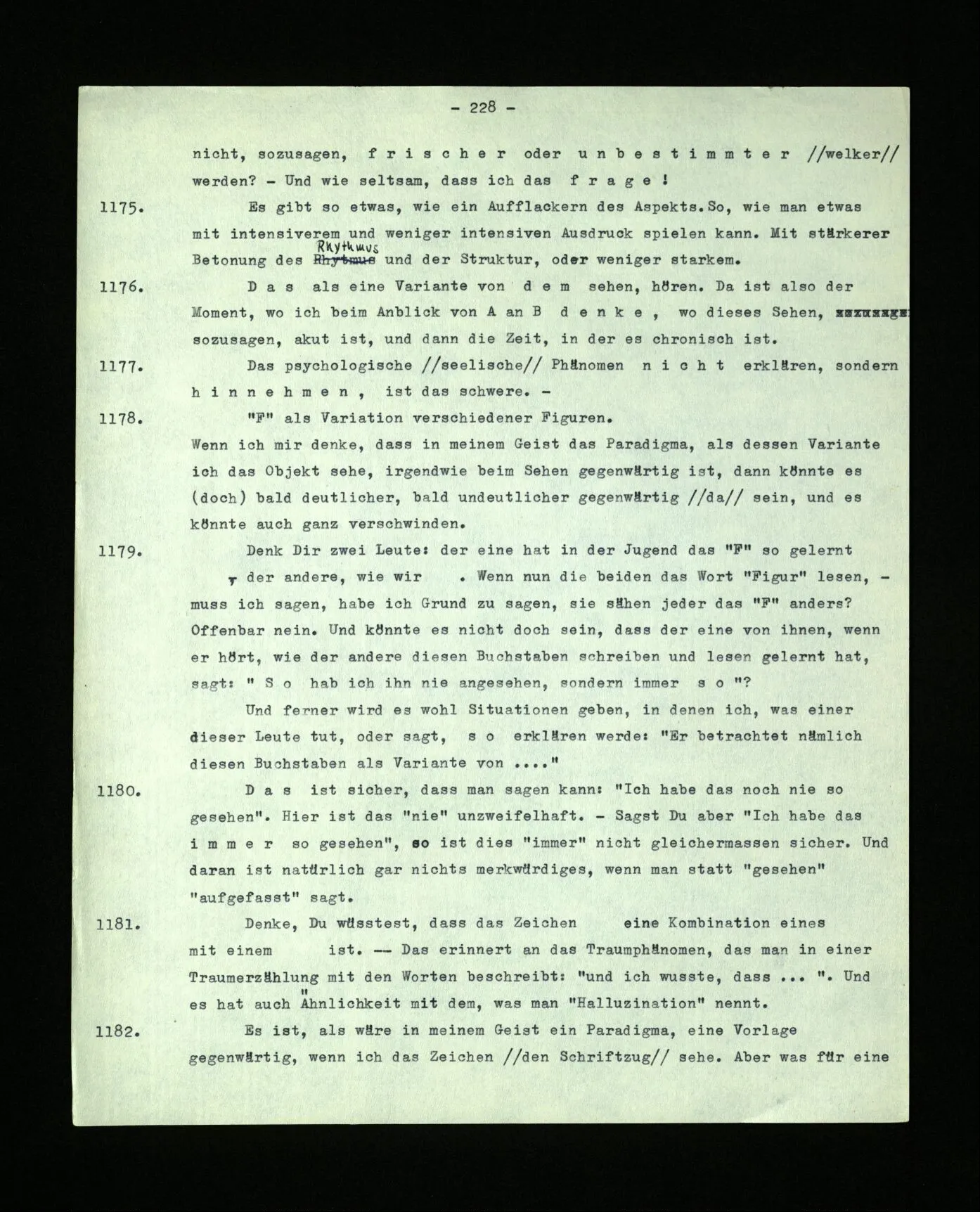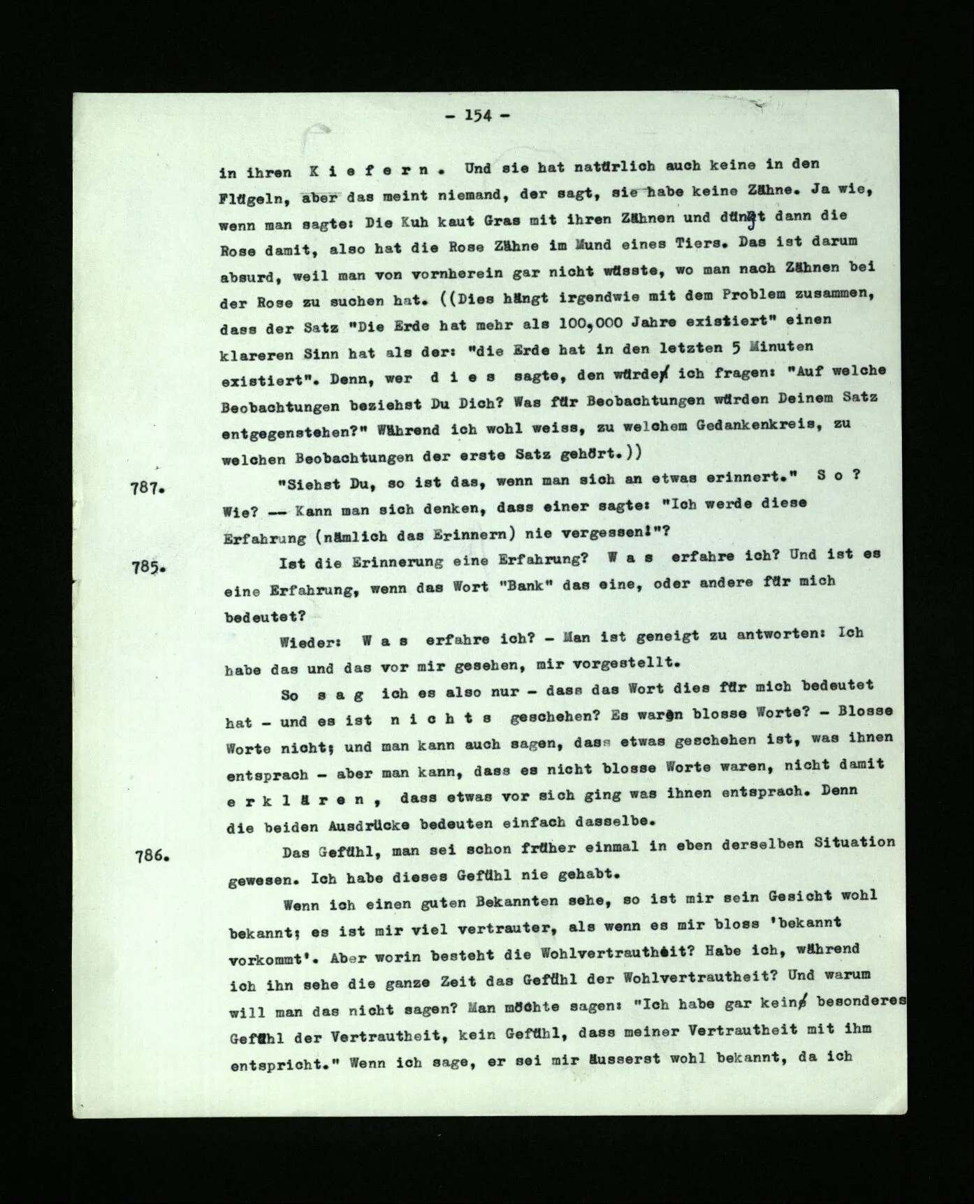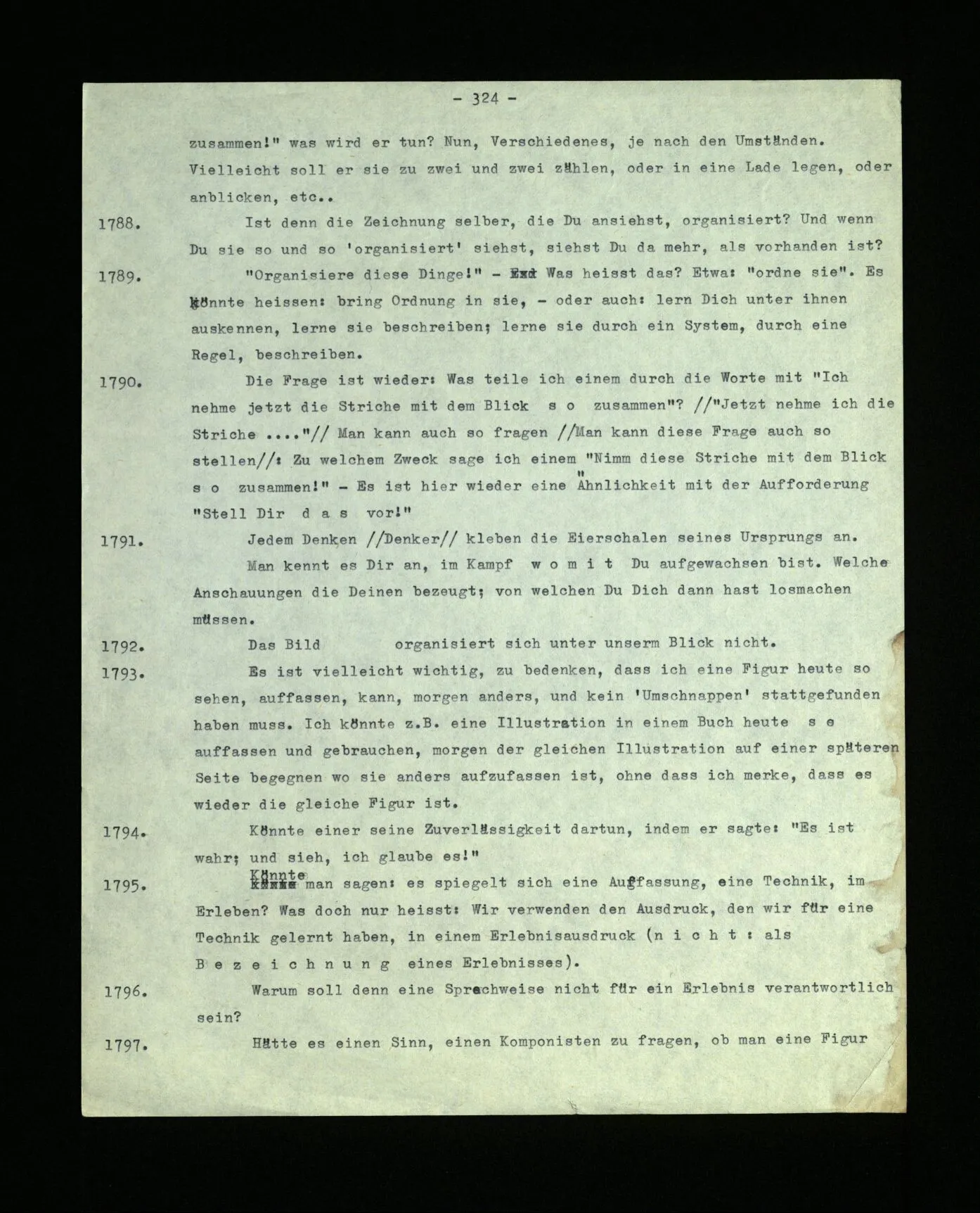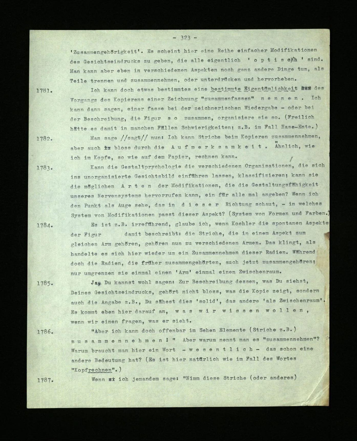 1786. “Aber ich kann doch offenbar im Sehen Elemente (Striche z.B.) zusammennehmen!” Aber warum nennt man es “zusammennehmen”? Warum braucht man hier ein Wort – wesentlich – das schon eine andere Bedeutung hat? (Es ist hier natürlich wie im Fall des Wortes “Kopfrechnen”.)