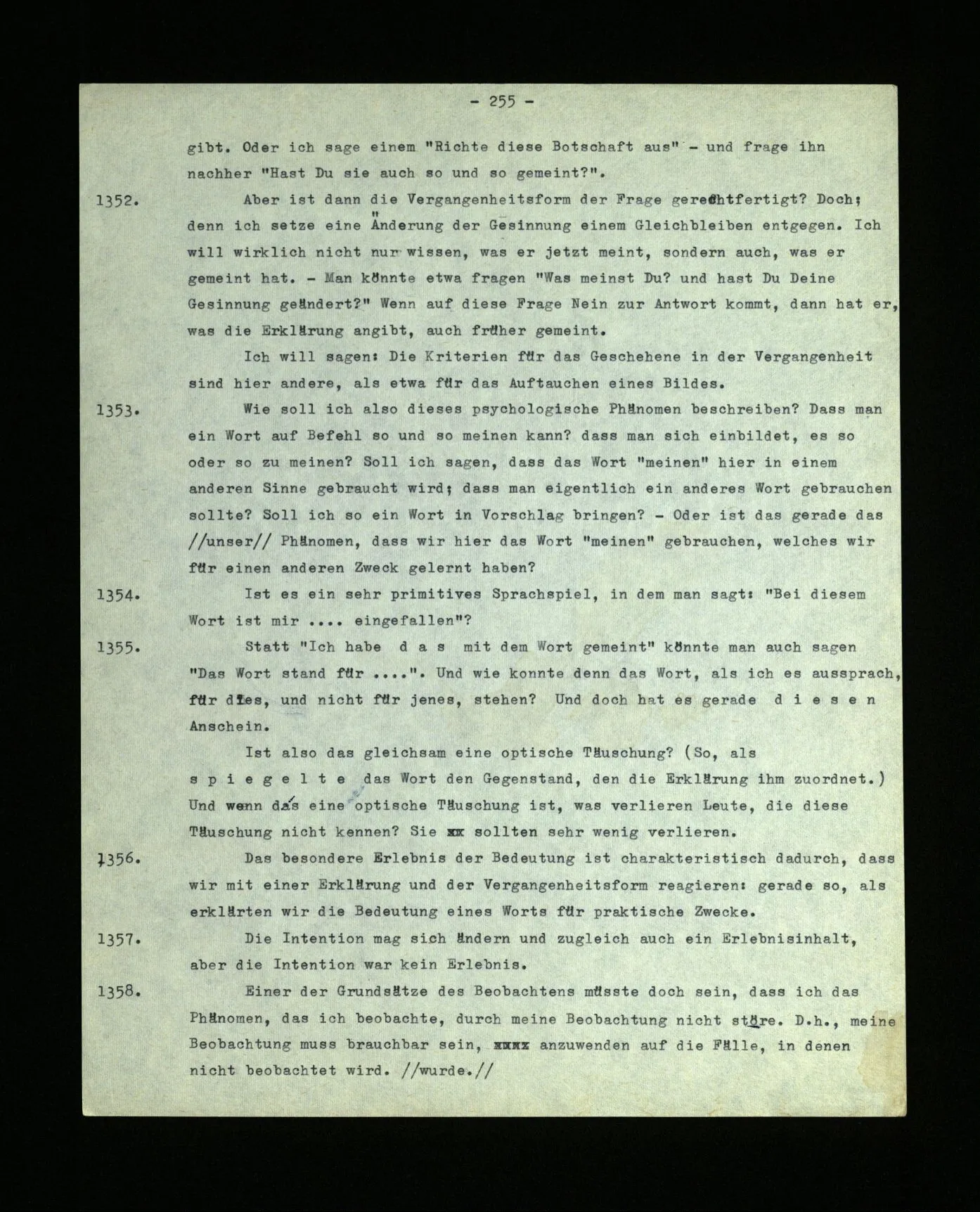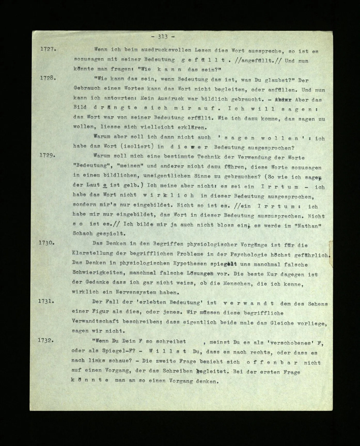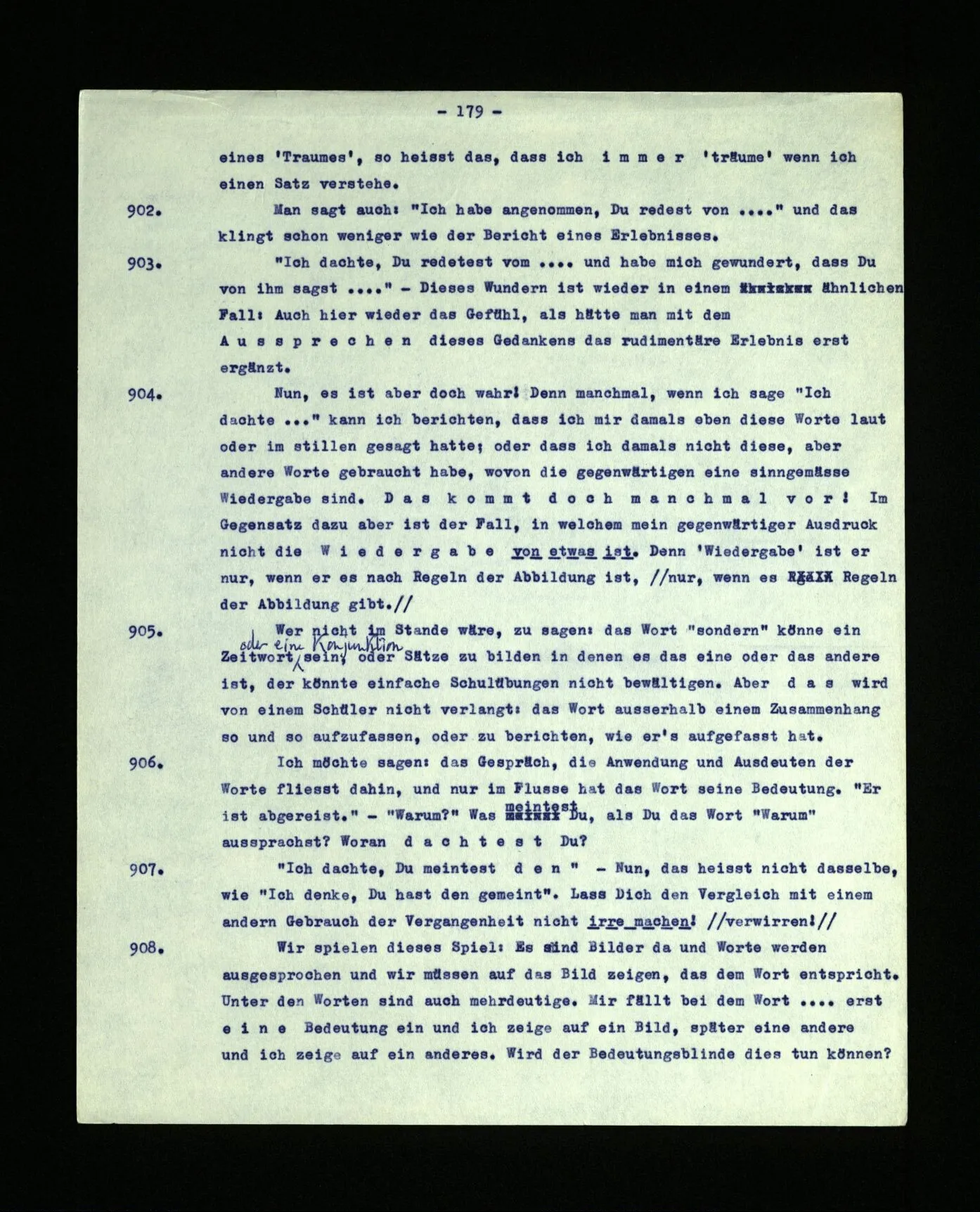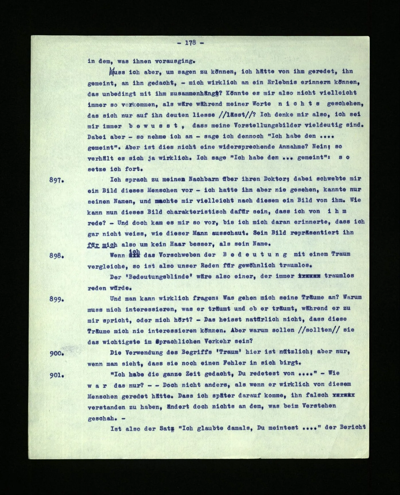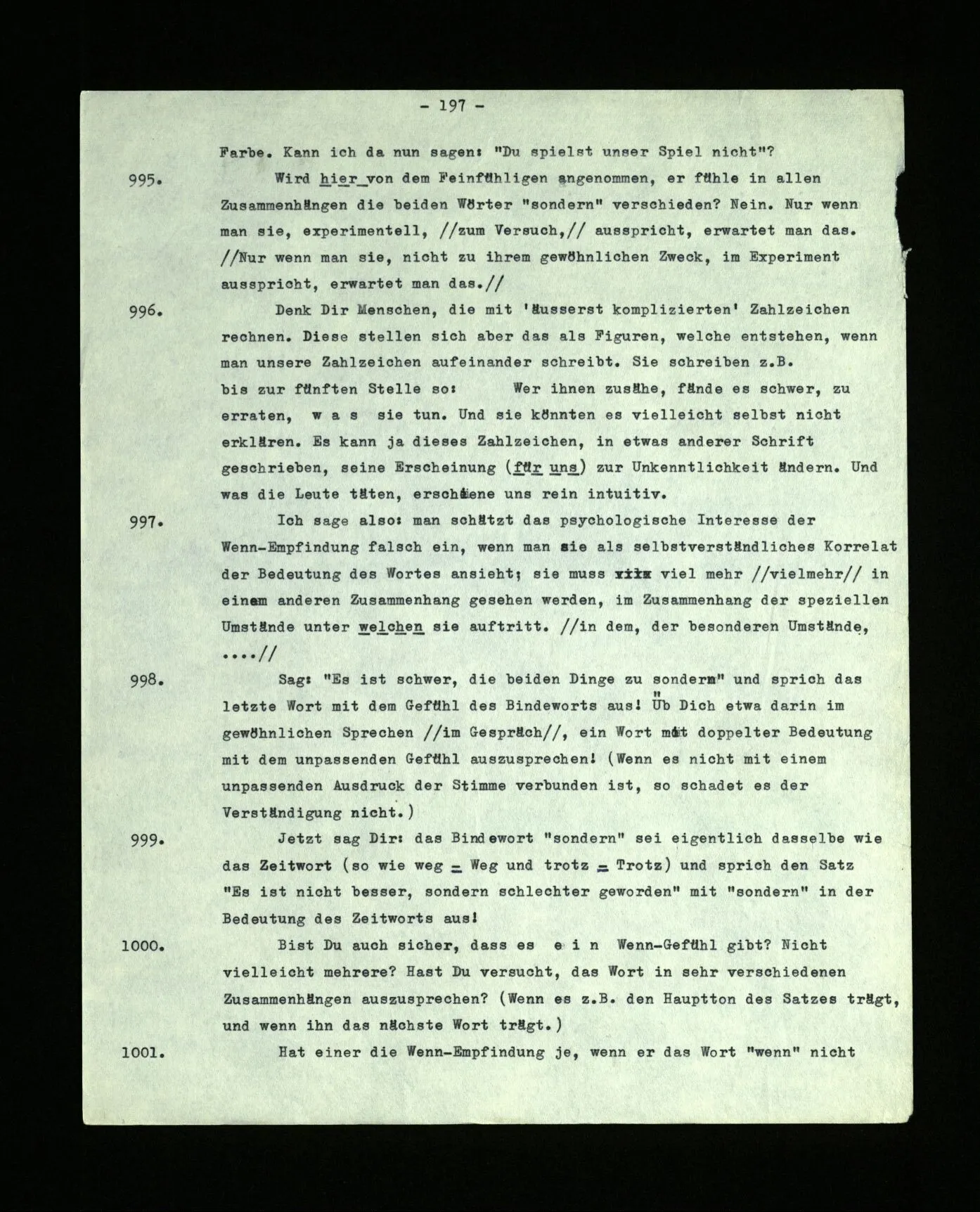 1801. Er fragt “Was hast Du mit dem Wort gemeint?” – Ich beantworte die Frage und setze hinzu: “Hättest Du mich früher gefragt, so hätte ich das gleiche geantwortet; meine Antwort war nicht eine Deutung, die mir jetzt eingefallen ist.” So war sie mir schon früher eingefallen? Nein. – Und wie konnte ich dann sagen: “Hättest Du mich früher gefragt, so hätte ich ‥‥”? Woraus schloß ich das? Aus gar nichts. Was teile ich ihm mit, wenn ich diesen Konditional ausspreche? Etwas, was manchmal von Wichtigkeit sein kann.