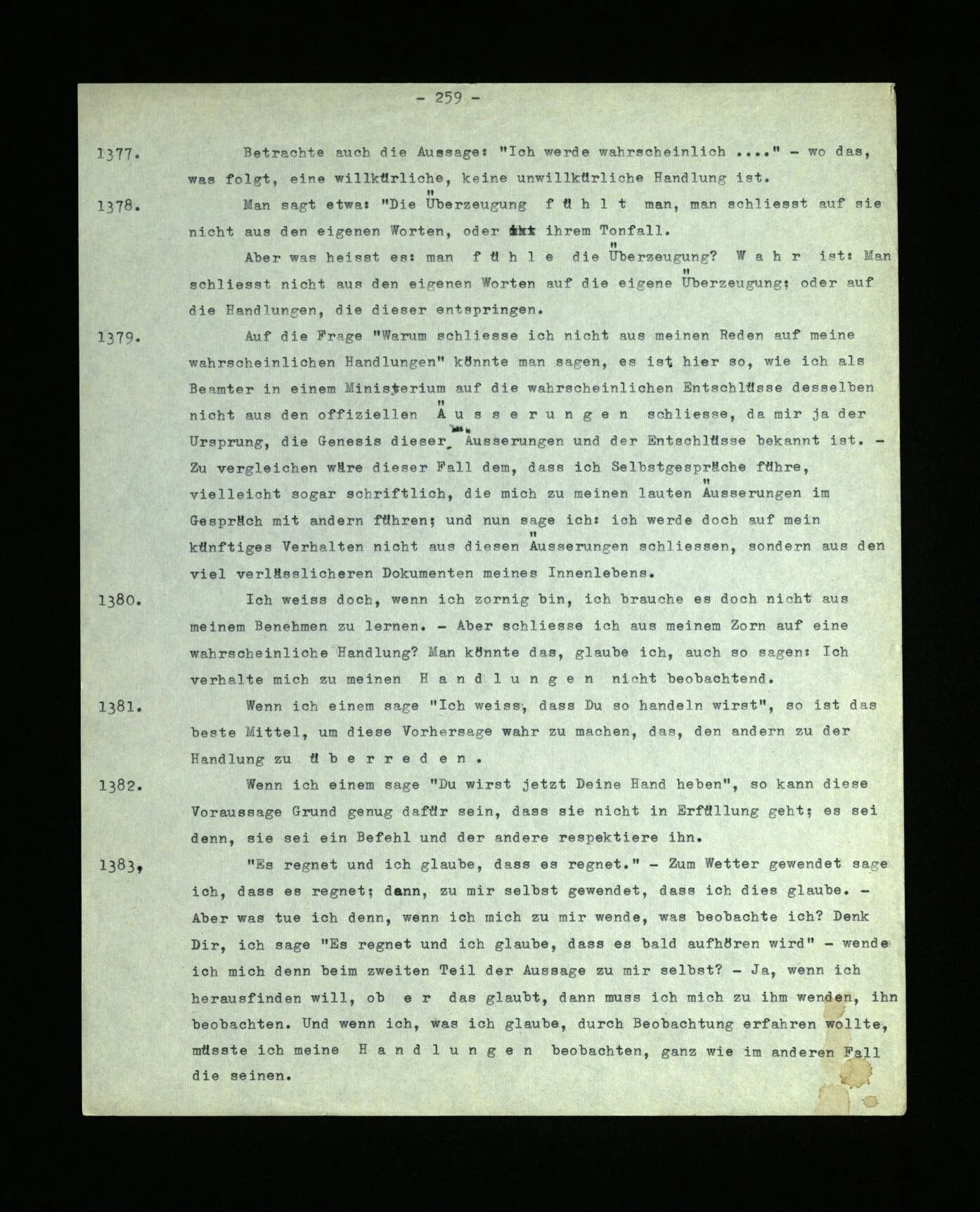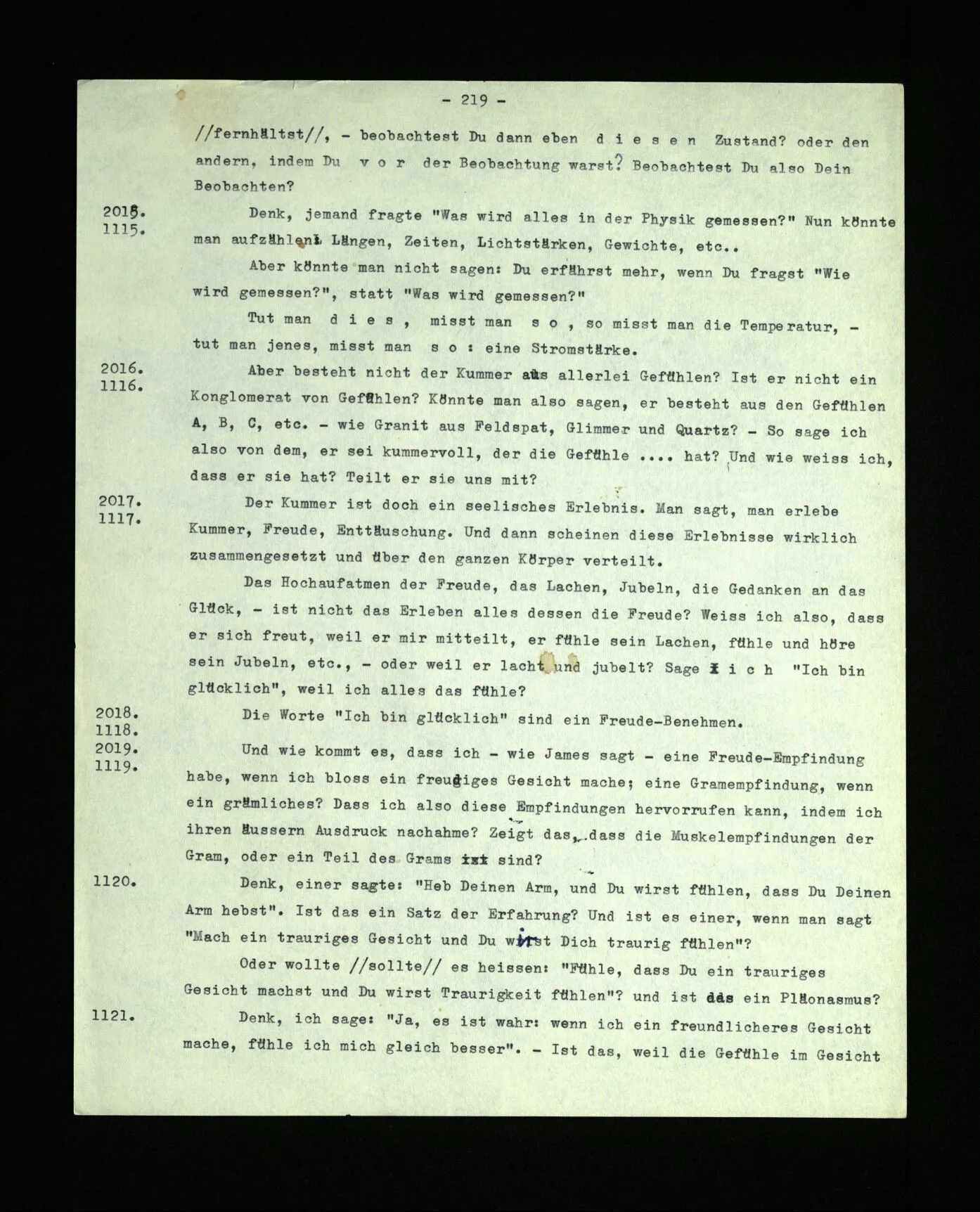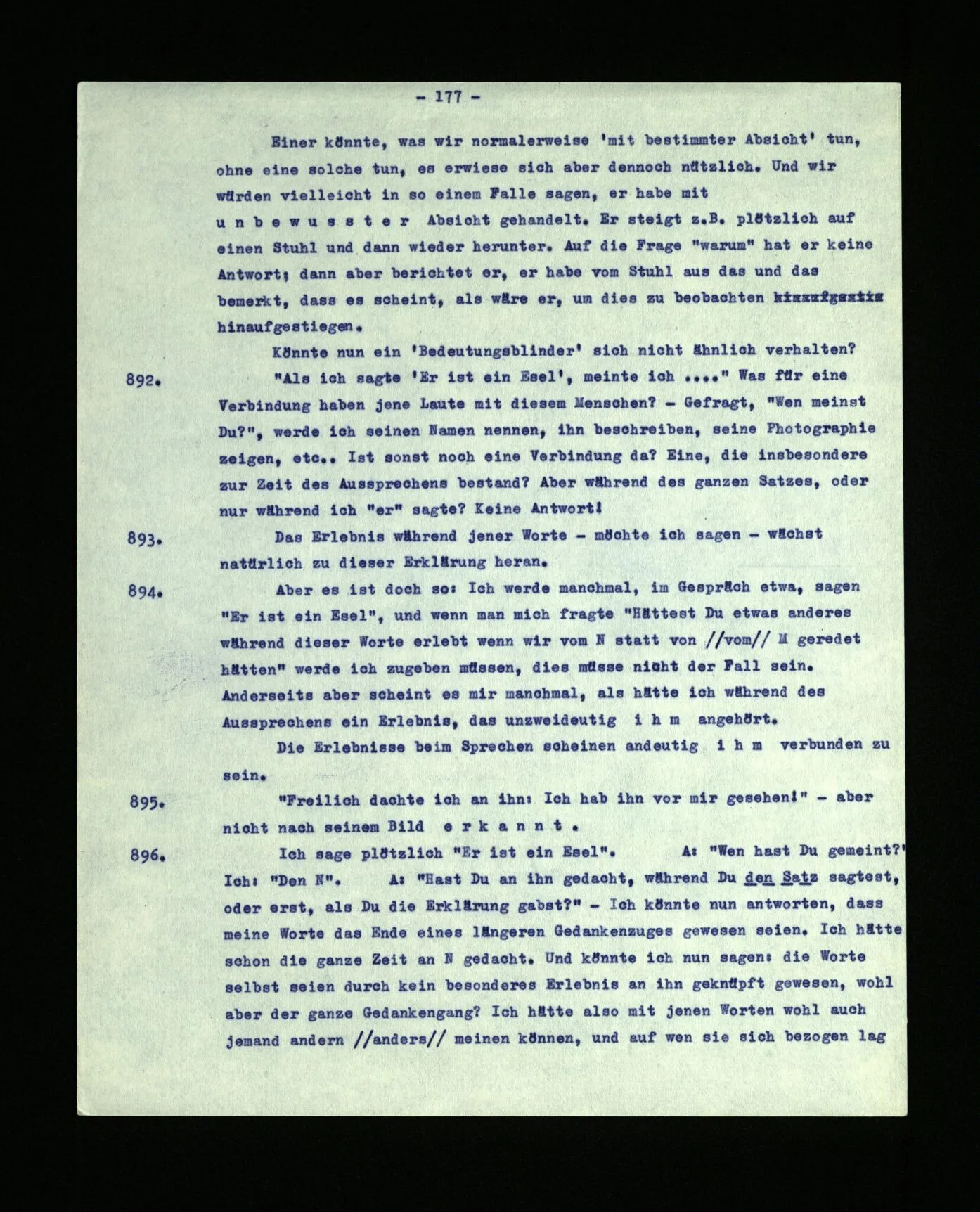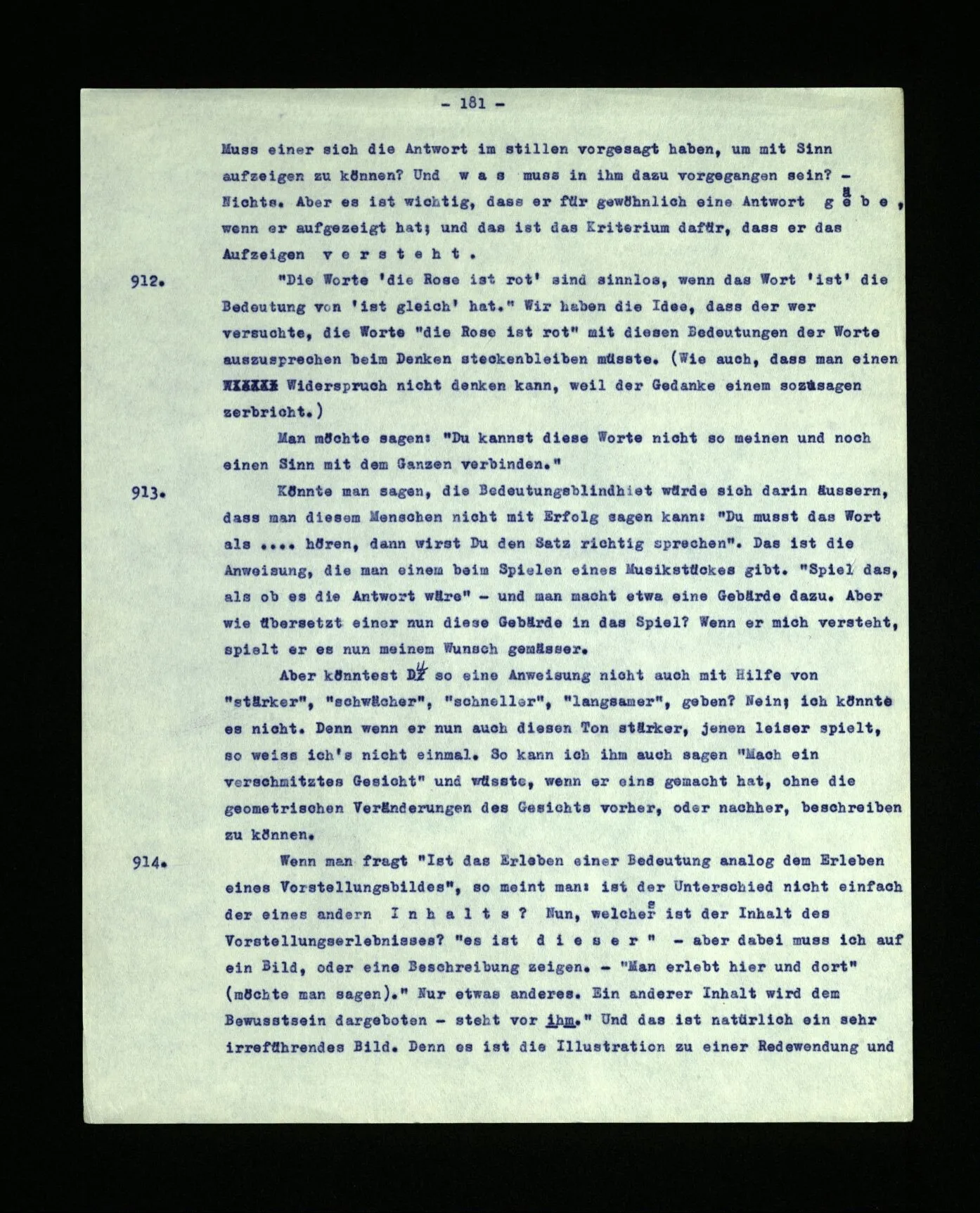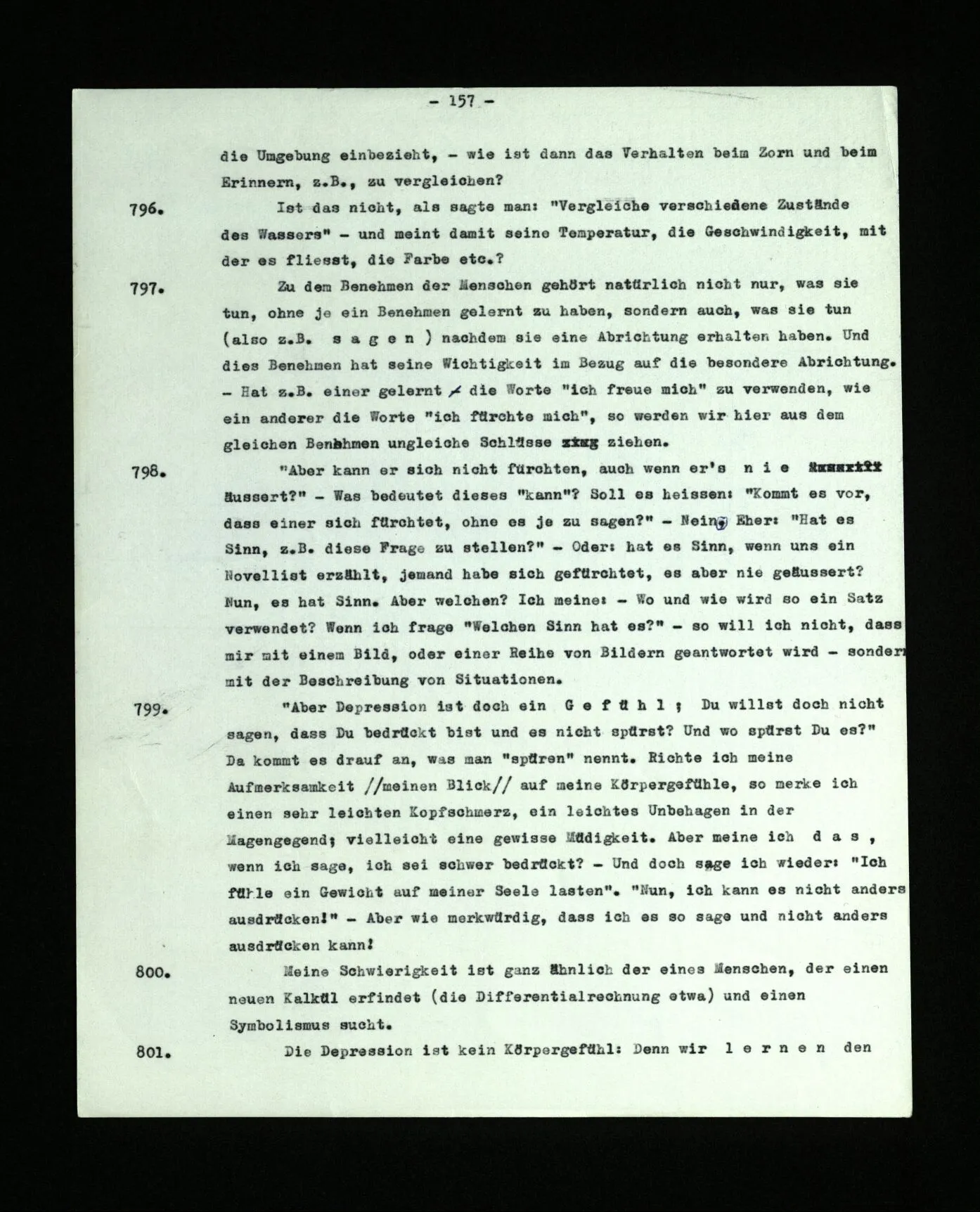 1801. Er fragt “Was hast Du mit dem Wort gemeint?” – Ich beantworte die Frage und setze hinzu: “Hättest Du mich früher gefragt, so hätte ich das gleiche geantwortet; meine Antwort war nicht eine Deutung, die mir jetzt eingefallen ist.” So war sie mir schon früher eingefallen? Nein. – Und wie konnte ich dann sagen: “Hättest Du mich früher gefragt, so hätte ich ‥‥”? Woraus schloß ich das? Aus gar nichts. Was teile ich ihm mit, wenn ich diesen Konditional ausspreche? Etwas, was manchmal von Wichtigkeit sein kann.