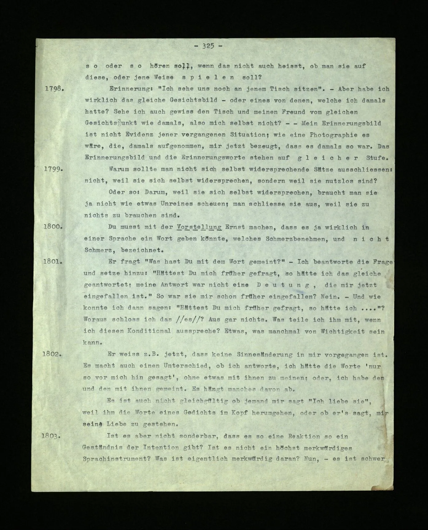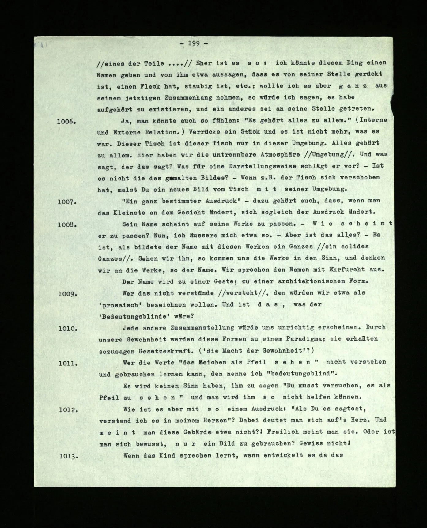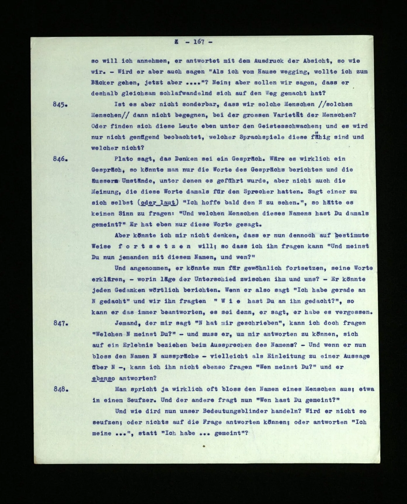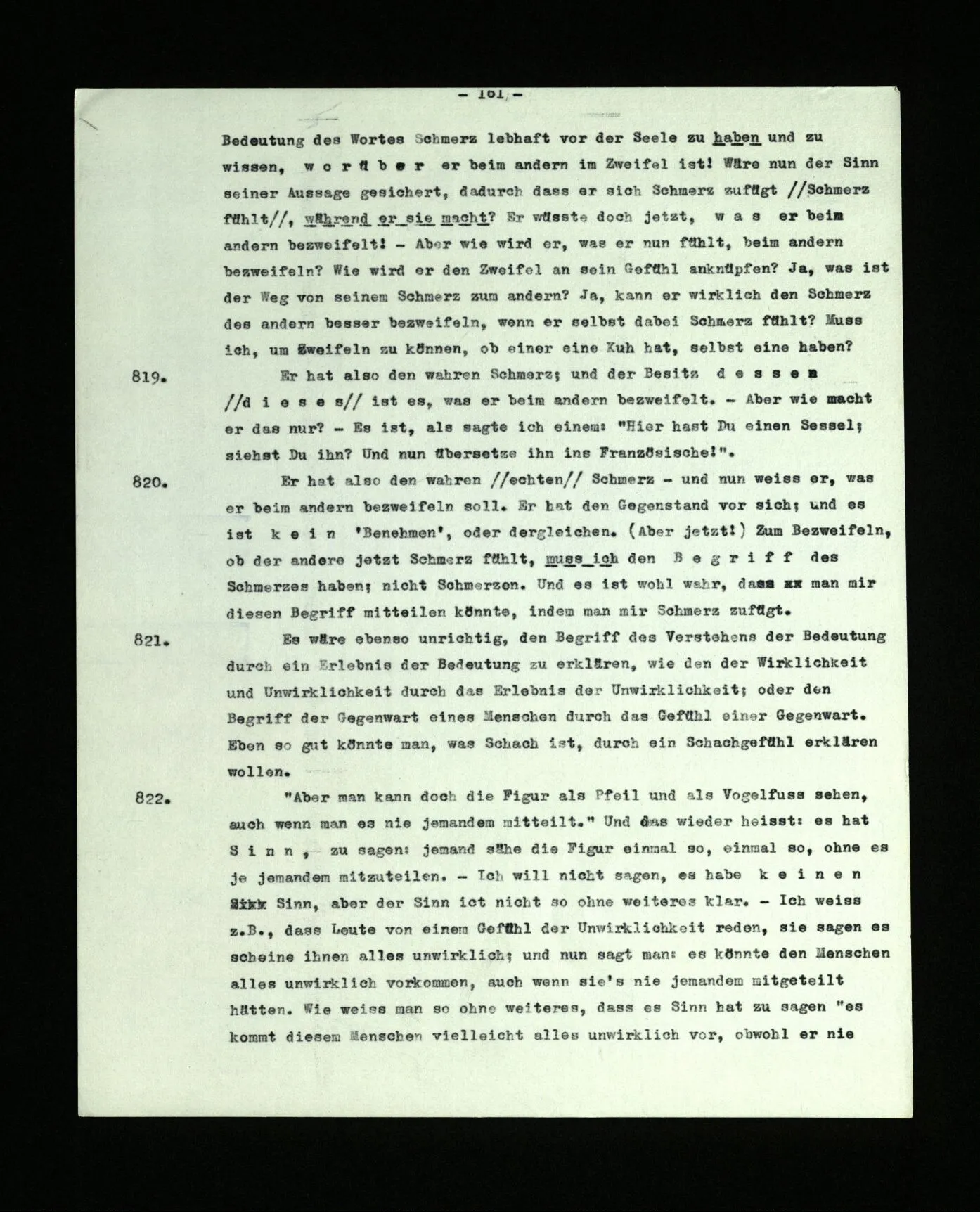 1801. Er fragt “Was hast Du mit dem Wort gemeint?” – Ich beantworte die Frage und setze hinzu: “Hättest Du mich früher gefragt, so hätte ich das gleiche geantwortet; meine Antwort war nicht eine Deutung, die mir jetzt eingefallen ist.” So war sie mir schon früher eingefallen? Nein. – Und wie konnte ich dann sagen: “Hättest Du mich früher gefragt, so hätte ich ‥‥”? Woraus schloß ich das? Aus gar nichts. Was teile ich ihm mit, wenn ich diesen Konditional ausspreche? Etwas, was manchmal von Wichtigkeit sein kann.