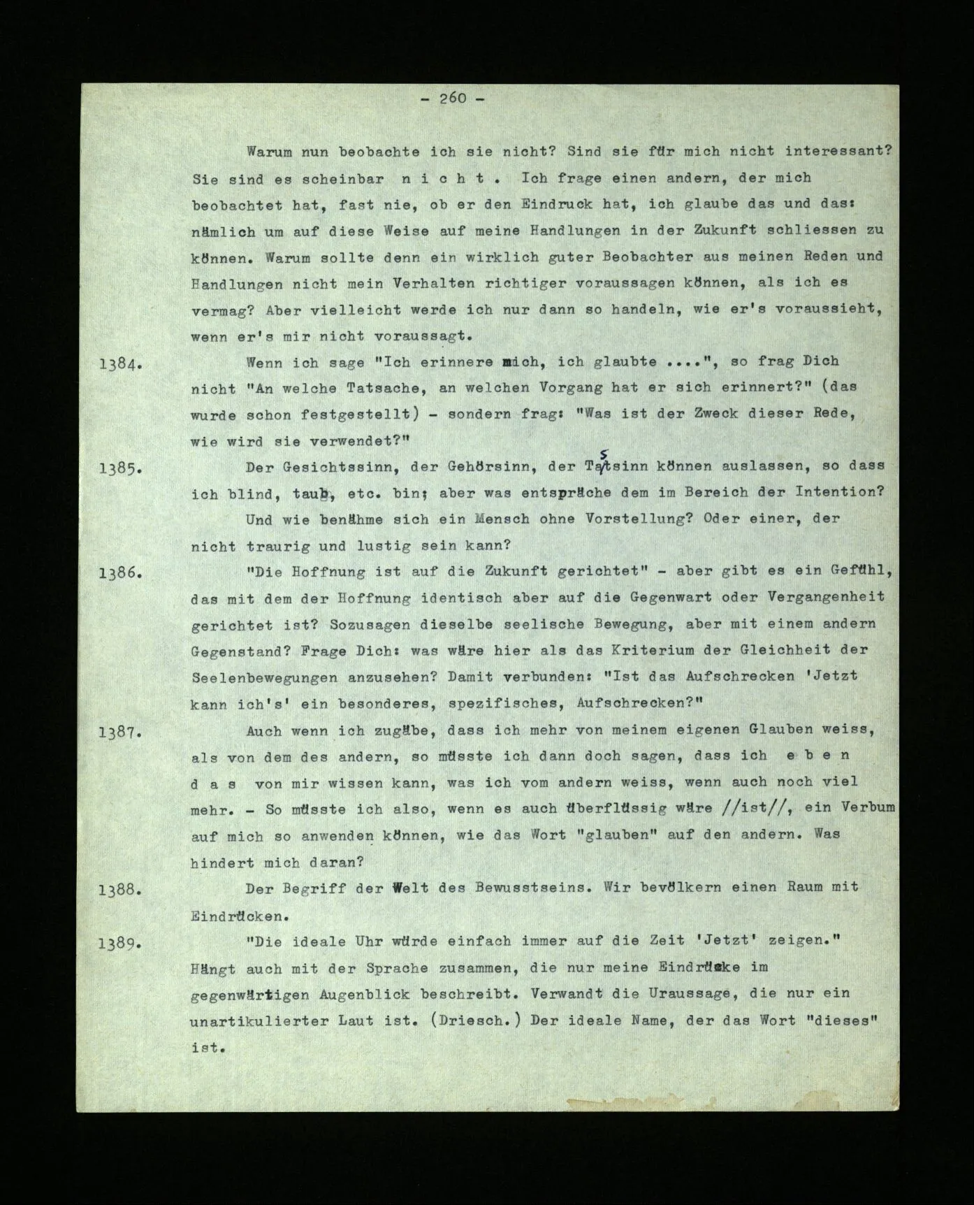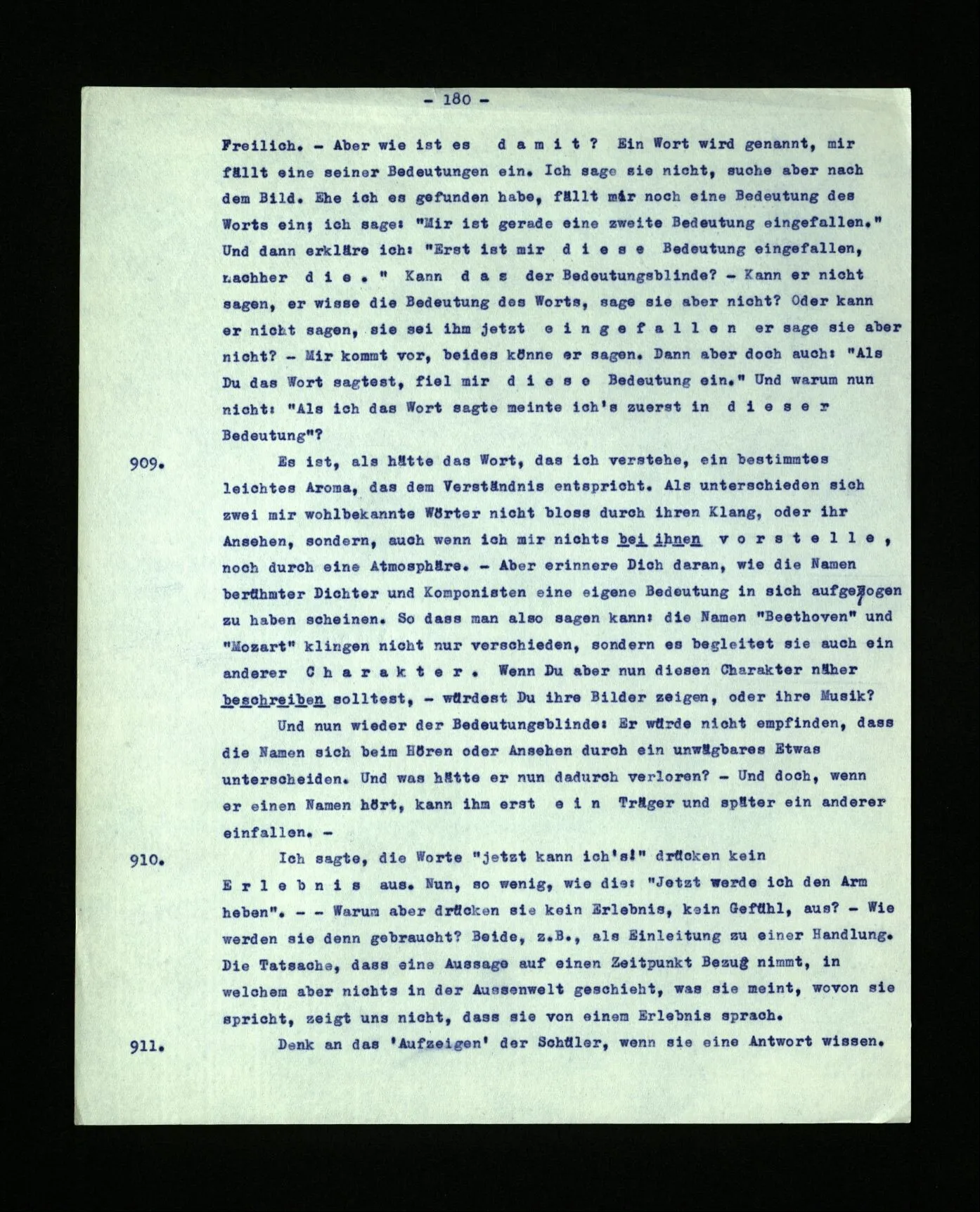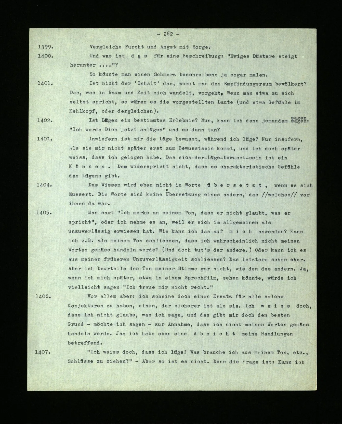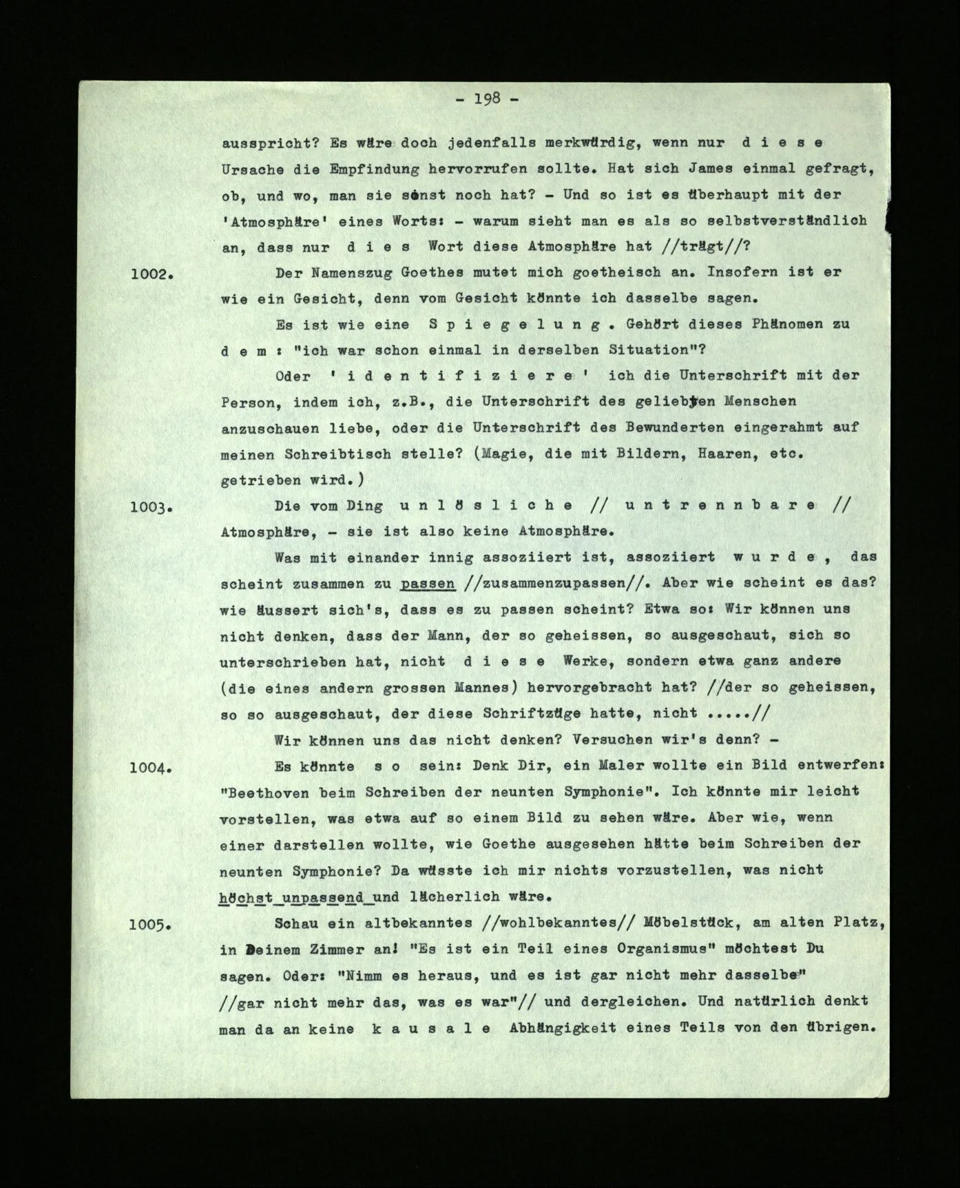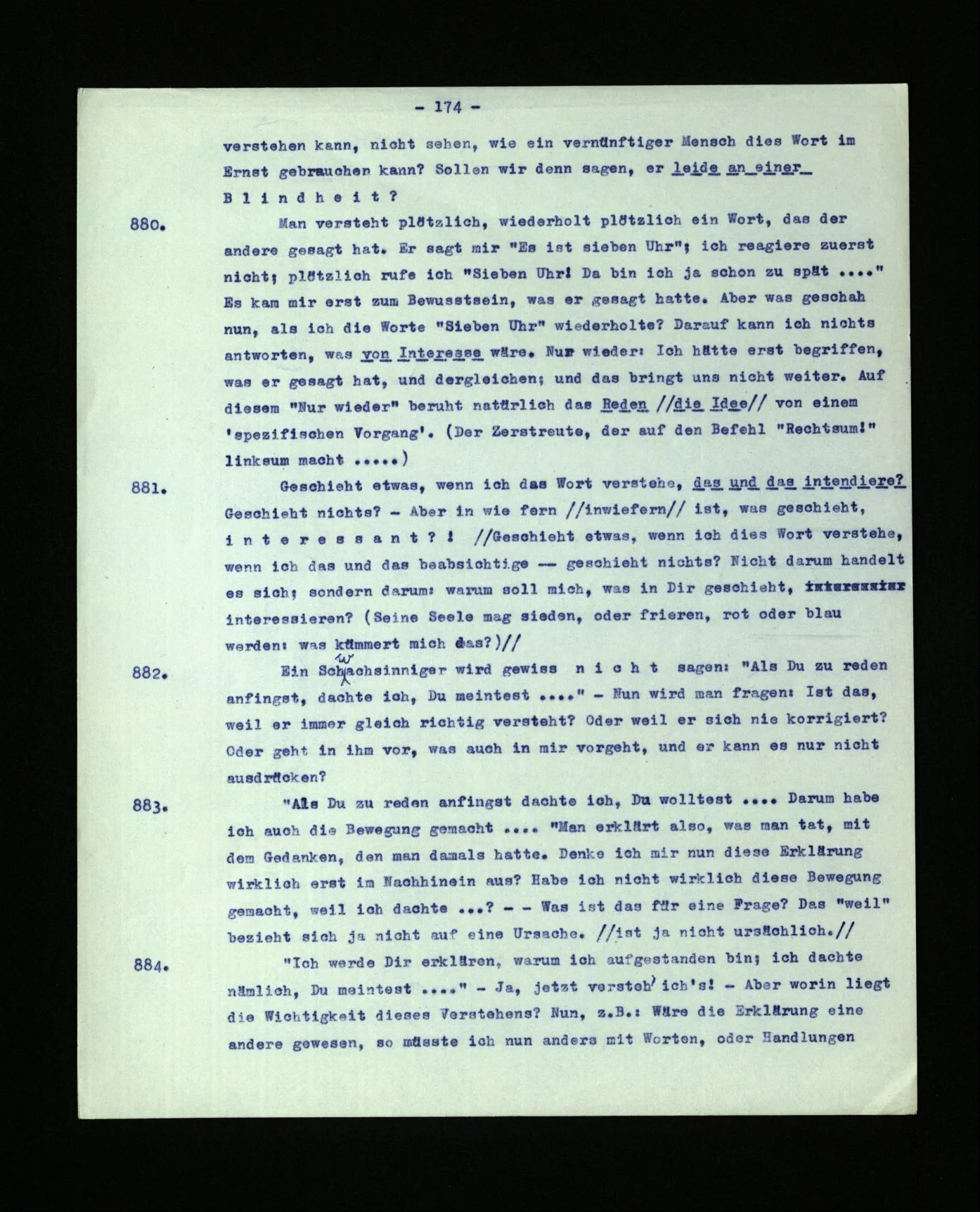 1801. Er fragt “Was hast Du mit dem Wort gemeint?” – Ich beantworte die Frage und setze hinzu: “Hättest Du mich früher gefragt, so hätte ich das gleiche geantwortet; meine Antwort war nicht eine Deutung, die mir jetzt eingefallen ist.” So war sie mir schon früher eingefallen? Nein. – Und wie konnte ich dann sagen: “Hättest Du mich früher gefragt, so hätte ich ‥‥”? Woraus schloß ich das? Aus gar nichts. Was teile ich ihm mit, wenn ich diesen Konditional ausspreche? Etwas, was manchmal von Wichtigkeit sein kann.