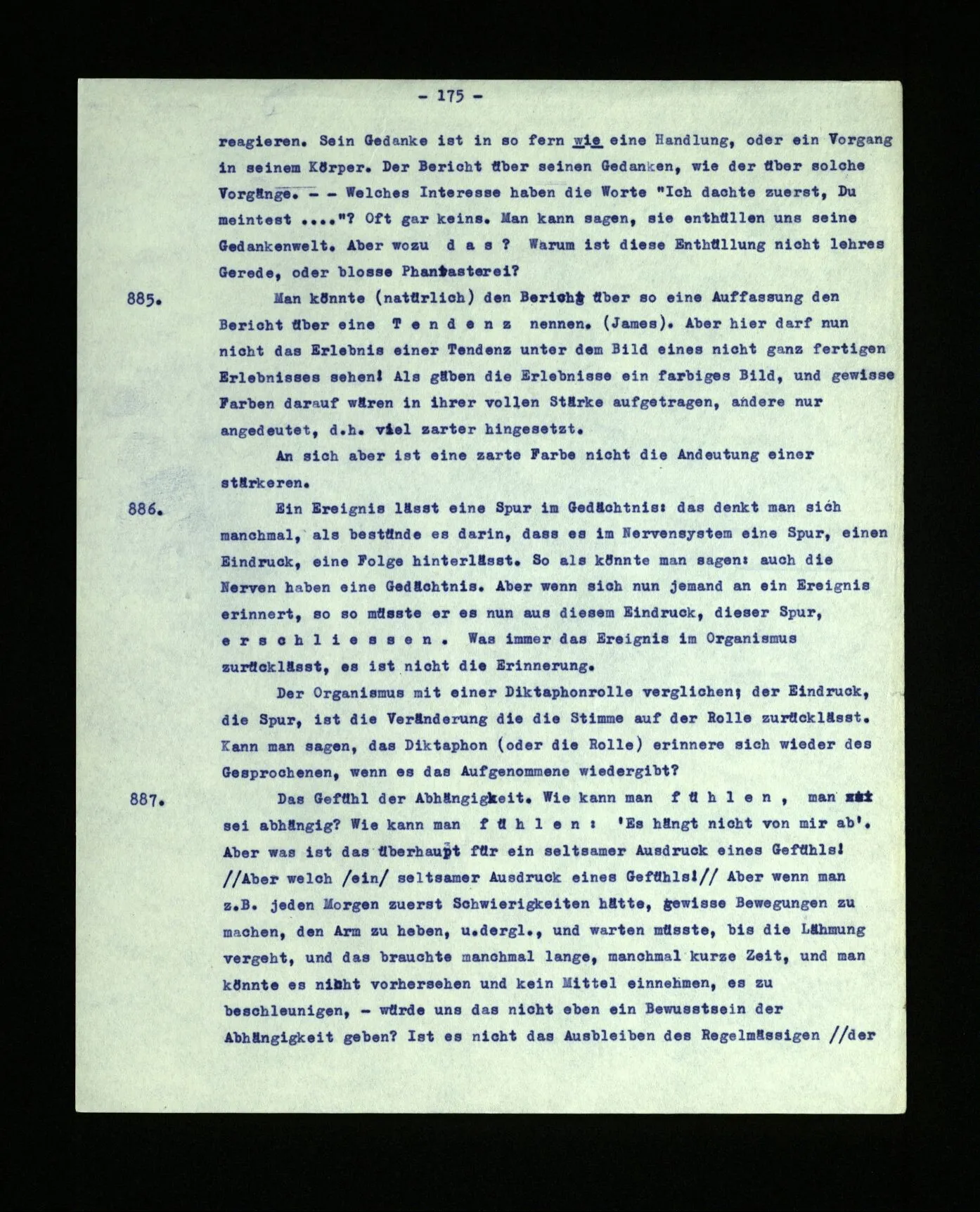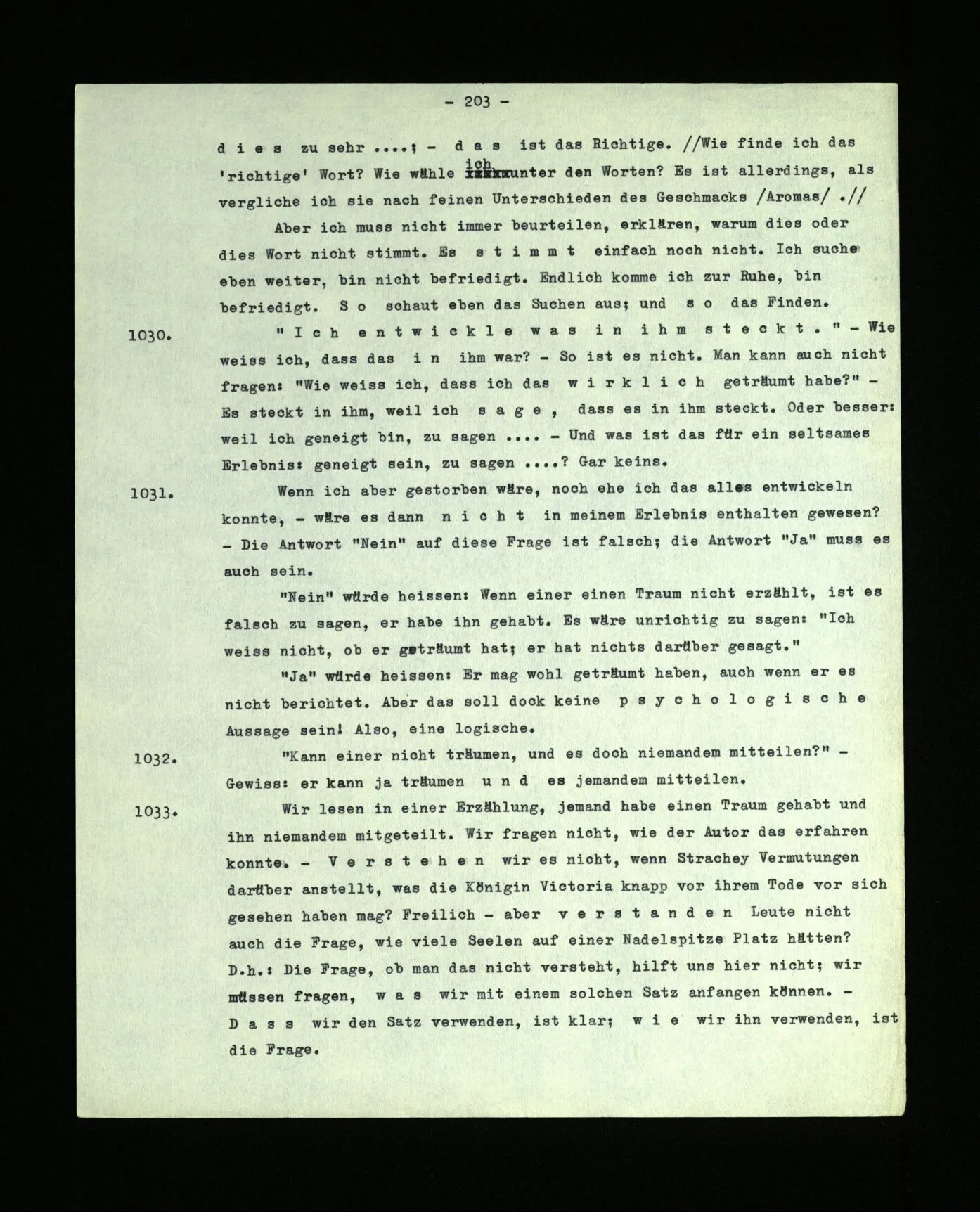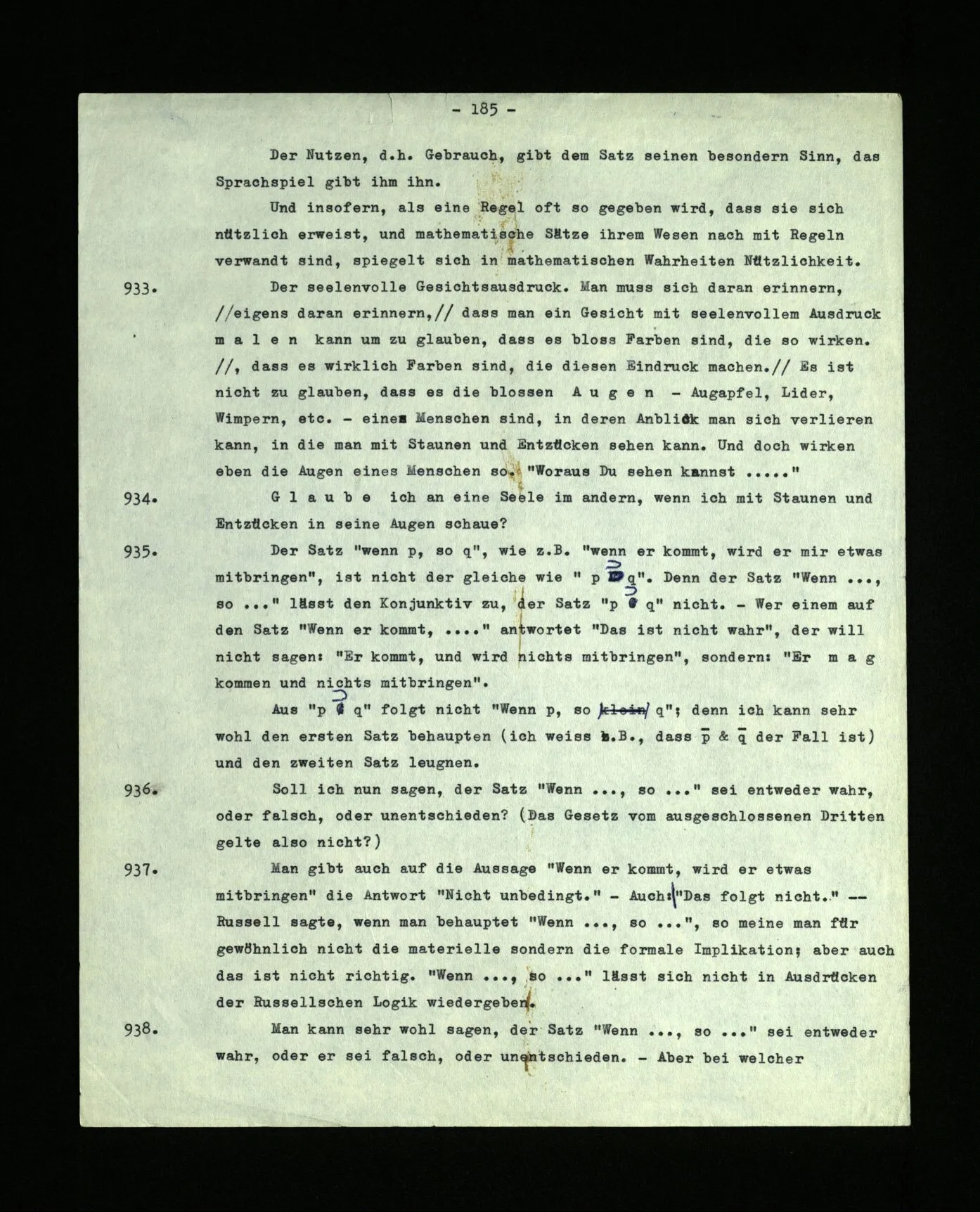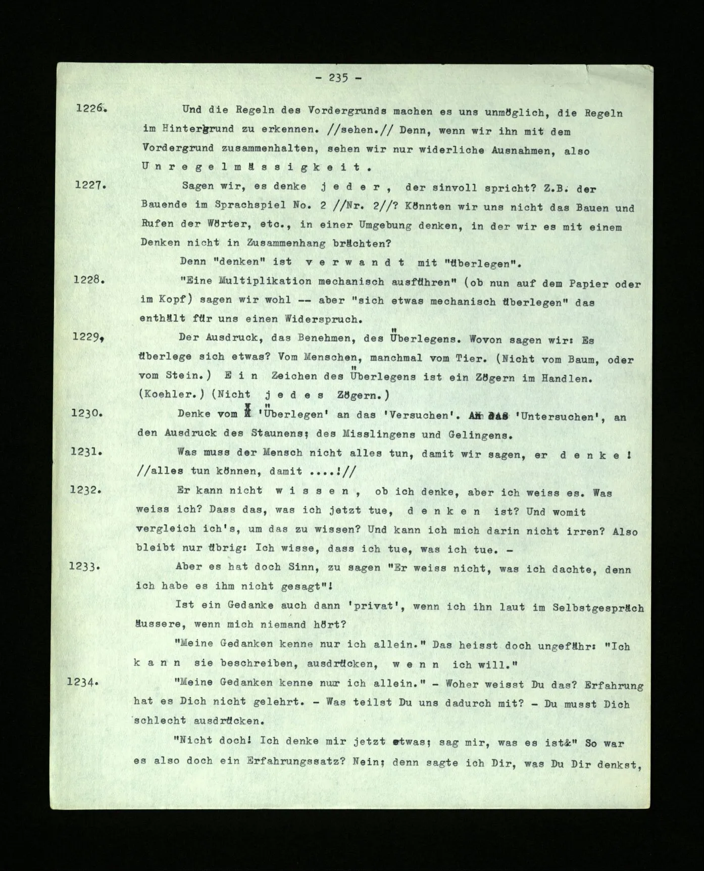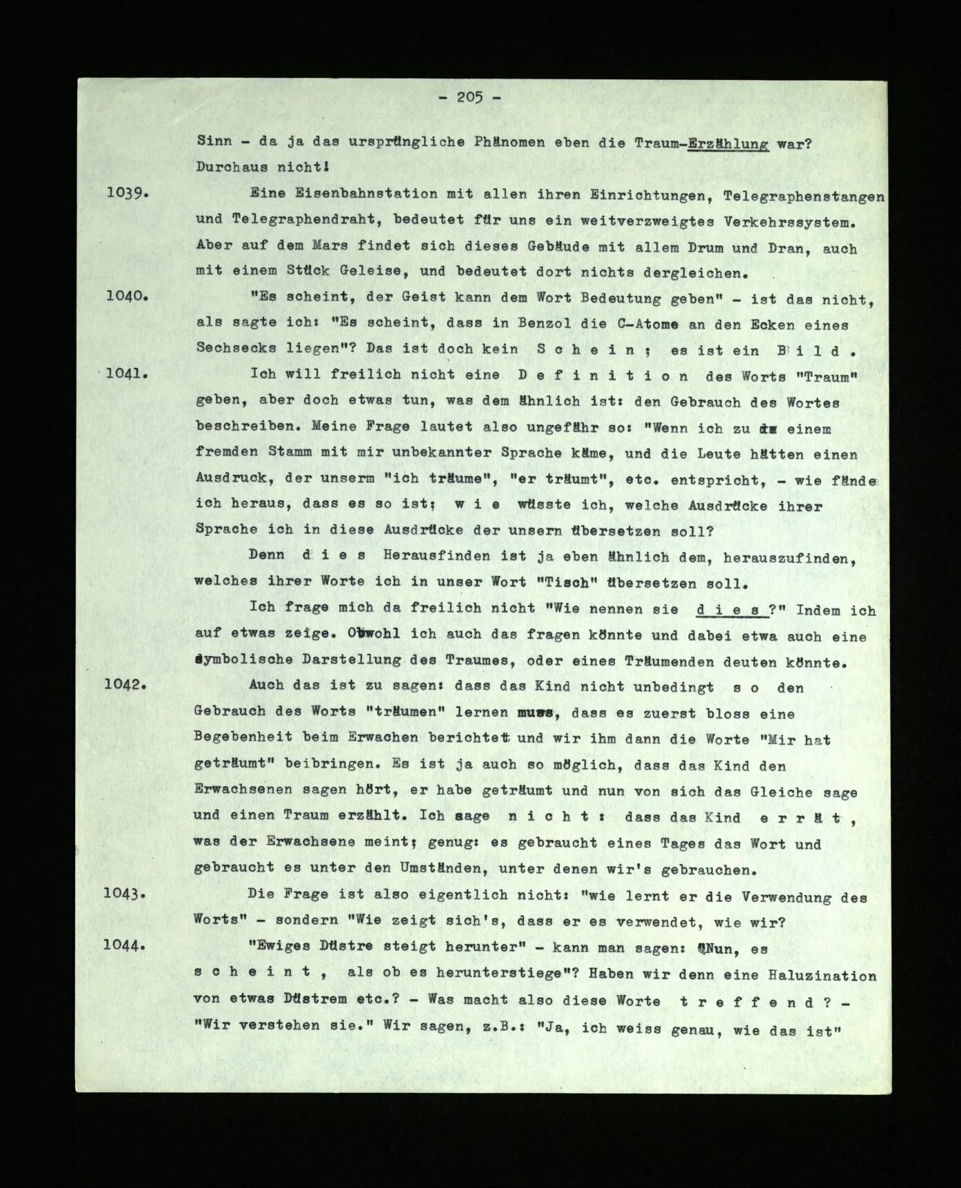 1801. Er fragt “Was hast Du mit dem Wort gemeint?” – Ich beantworte die Frage und setze hinzu: “Hättest Du mich früher gefragt, so hätte ich das gleiche geantwortet; meine Antwort war nicht eine Deutung, die mir jetzt eingefallen ist.” So war sie mir schon früher eingefallen? Nein. – Und wie konnte ich dann sagen: “Hättest Du mich früher gefragt, so hätte ich ‥‥”? Woraus schloß ich das? Aus gar nichts. Was teile ich ihm mit, wenn ich diesen Konditional ausspreche? Etwas, was manchmal von Wichtigkeit sein kann.