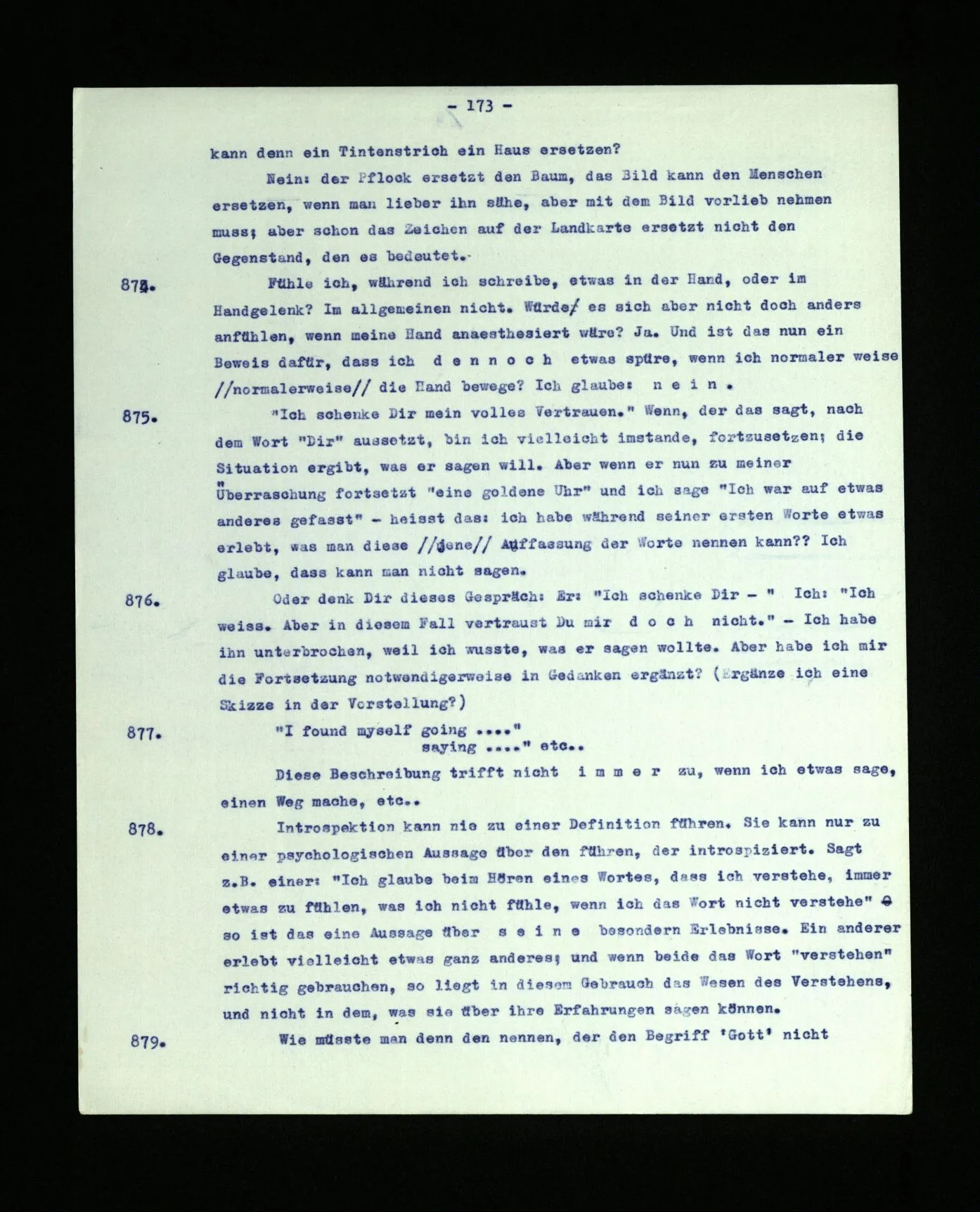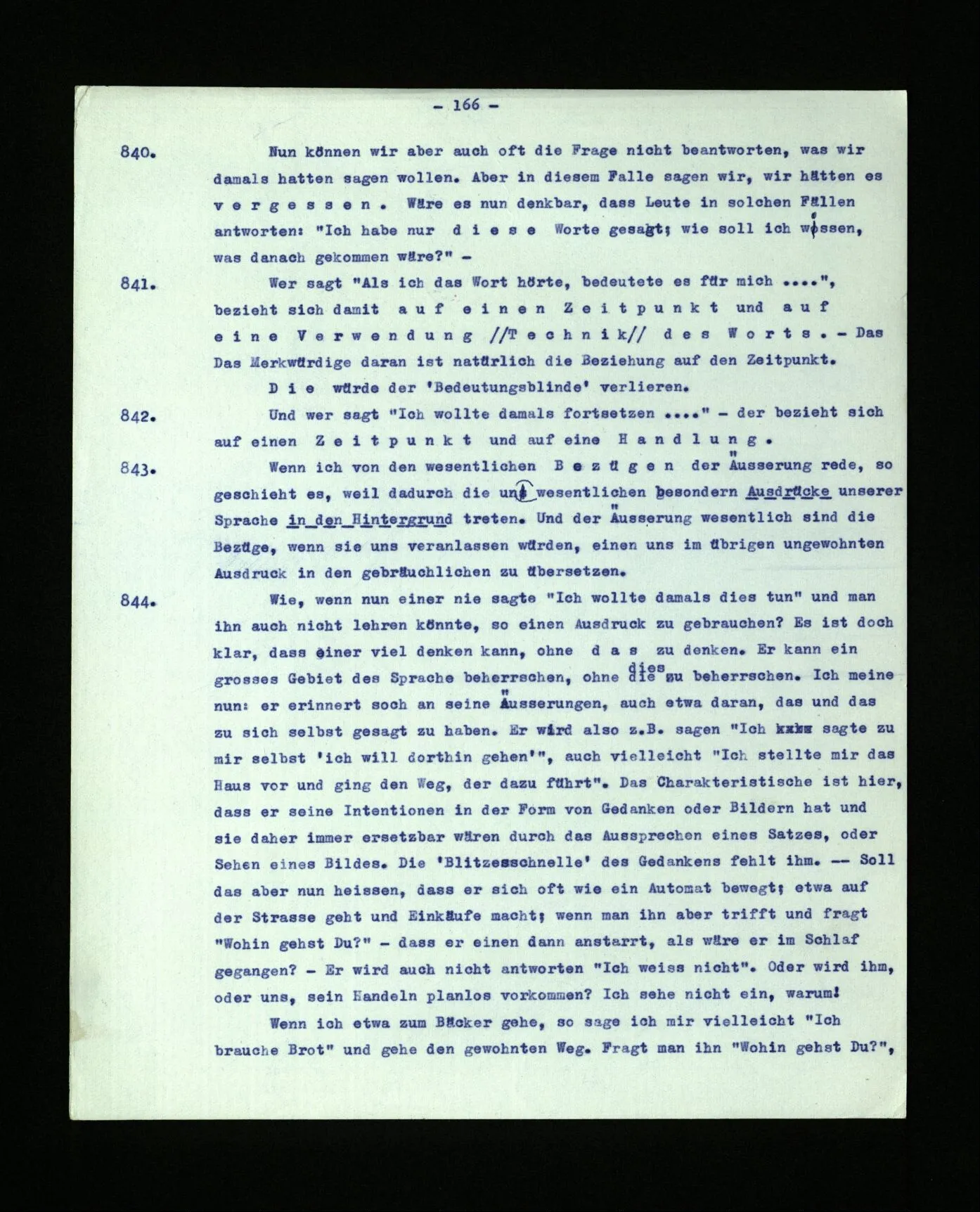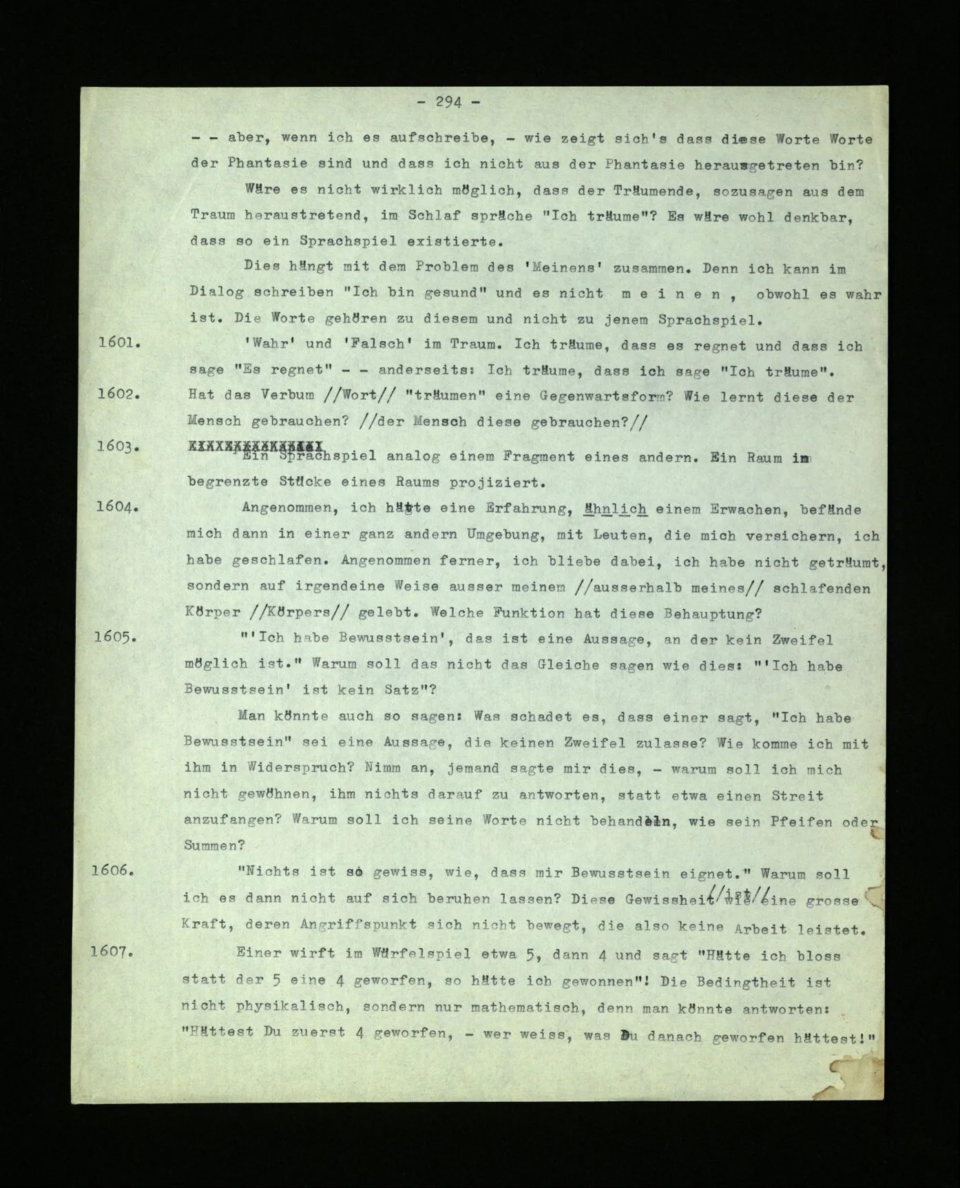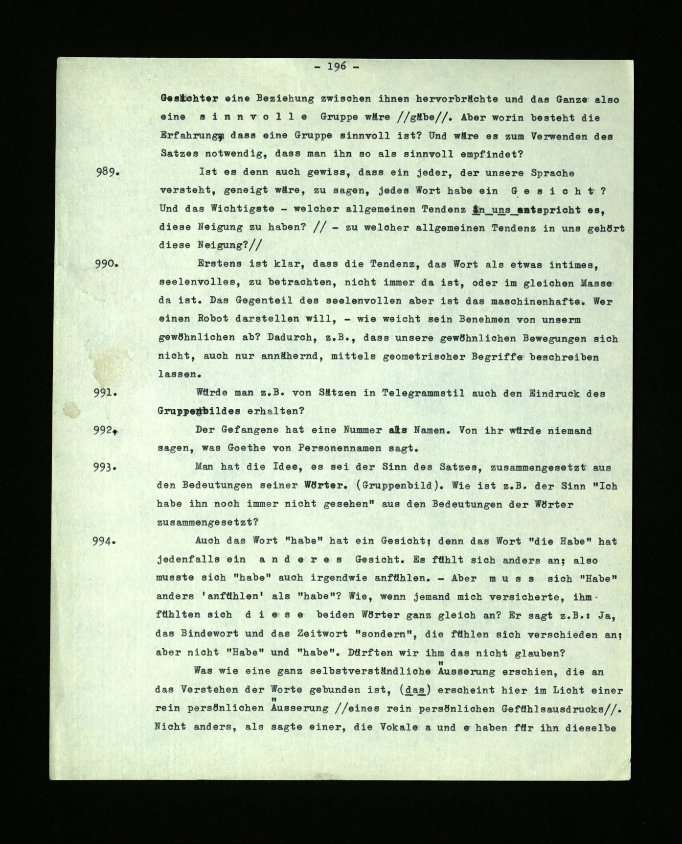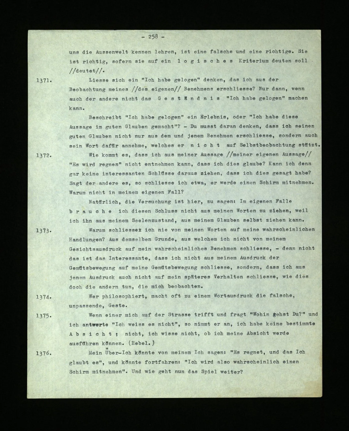 1801. Er fragt “Was hast Du mit dem Wort gemeint?” – Ich beantworte die Frage und setze hinzu: “Hättest Du mich früher gefragt, so hätte ich das gleiche geantwortet; meine Antwort war nicht eine Deutung, die mir jetzt eingefallen ist.” So war sie mir schon früher eingefallen? Nein. – Und wie konnte ich dann sagen: “Hättest Du mich früher gefragt, so hätte ich ‥‥”? Woraus schloß ich das? Aus gar nichts. Was teile ich ihm mit, wenn ich diesen Konditional ausspreche? Etwas, was manchmal von Wichtigkeit sein kann.
