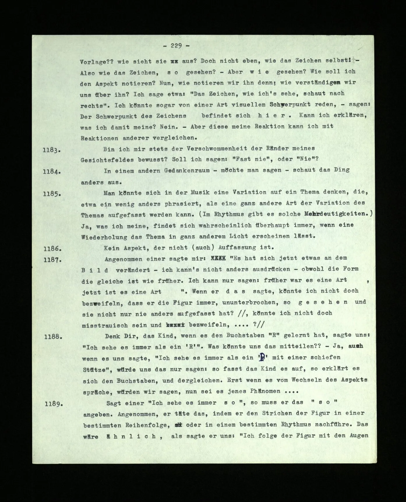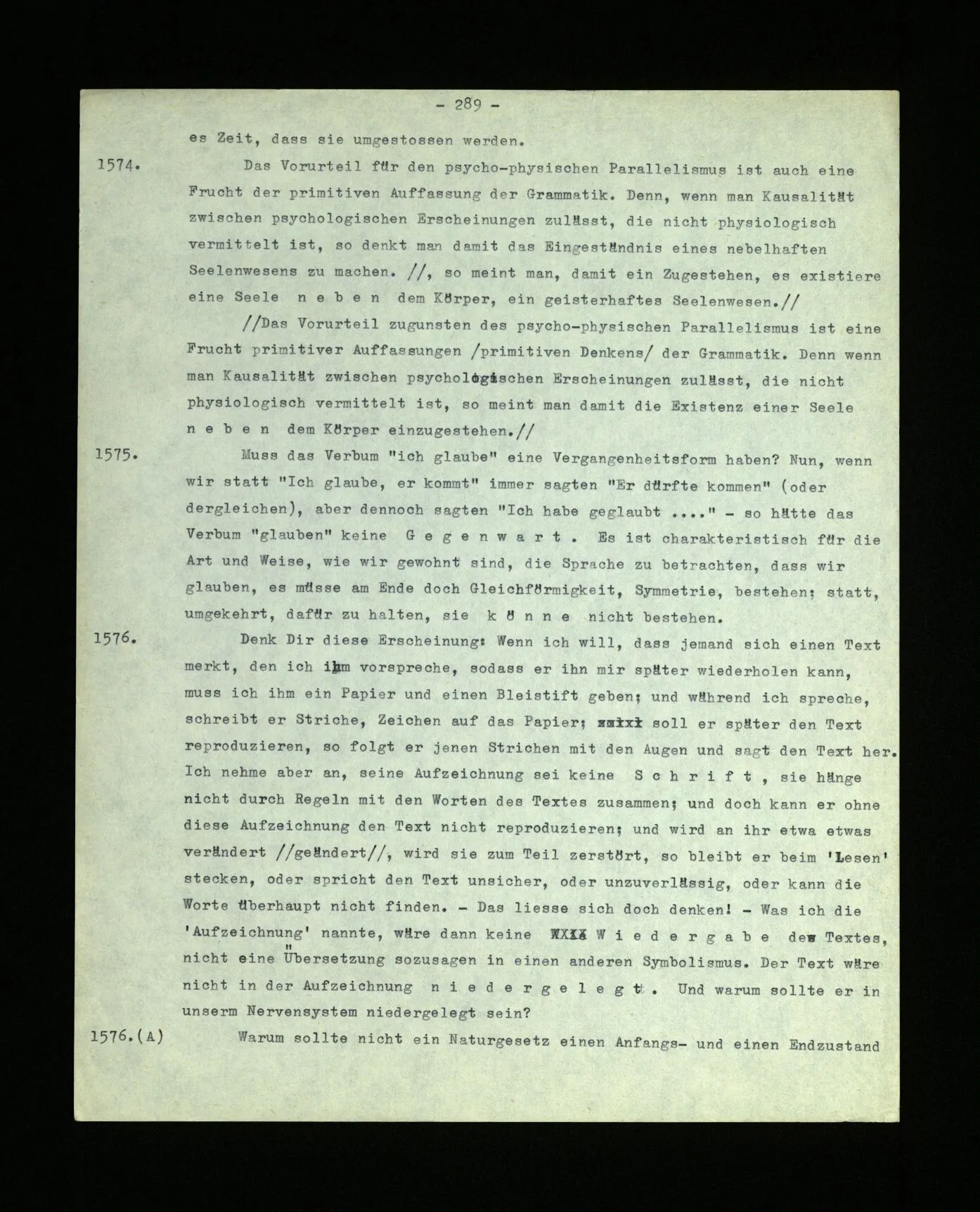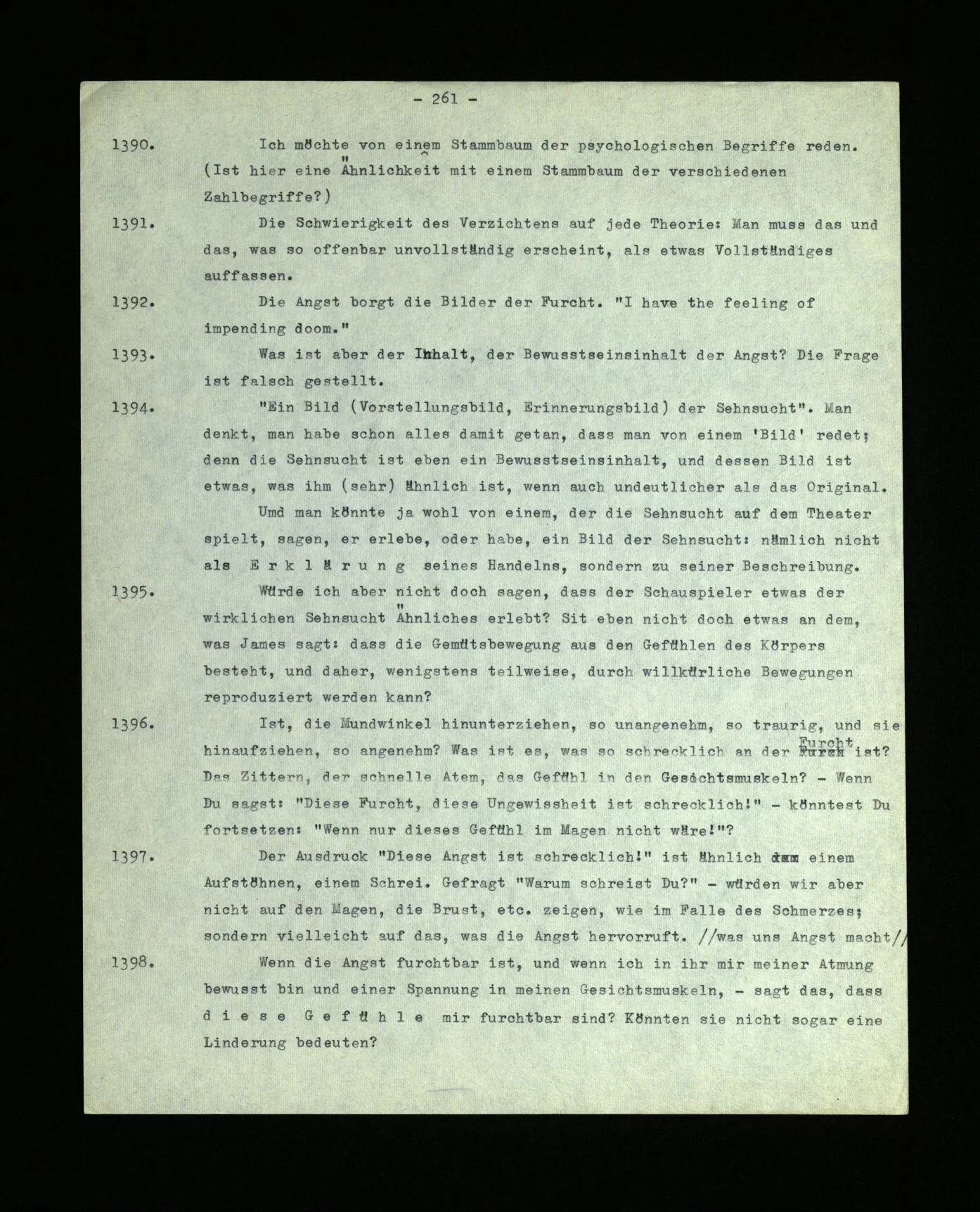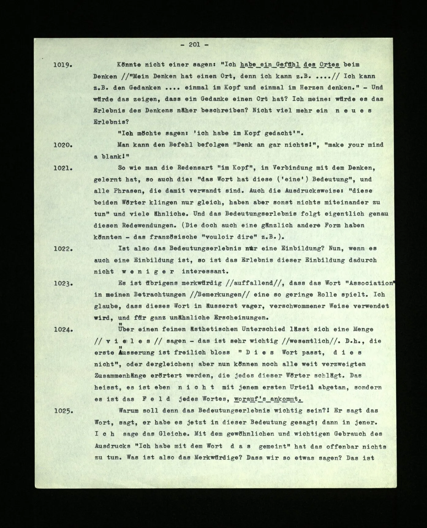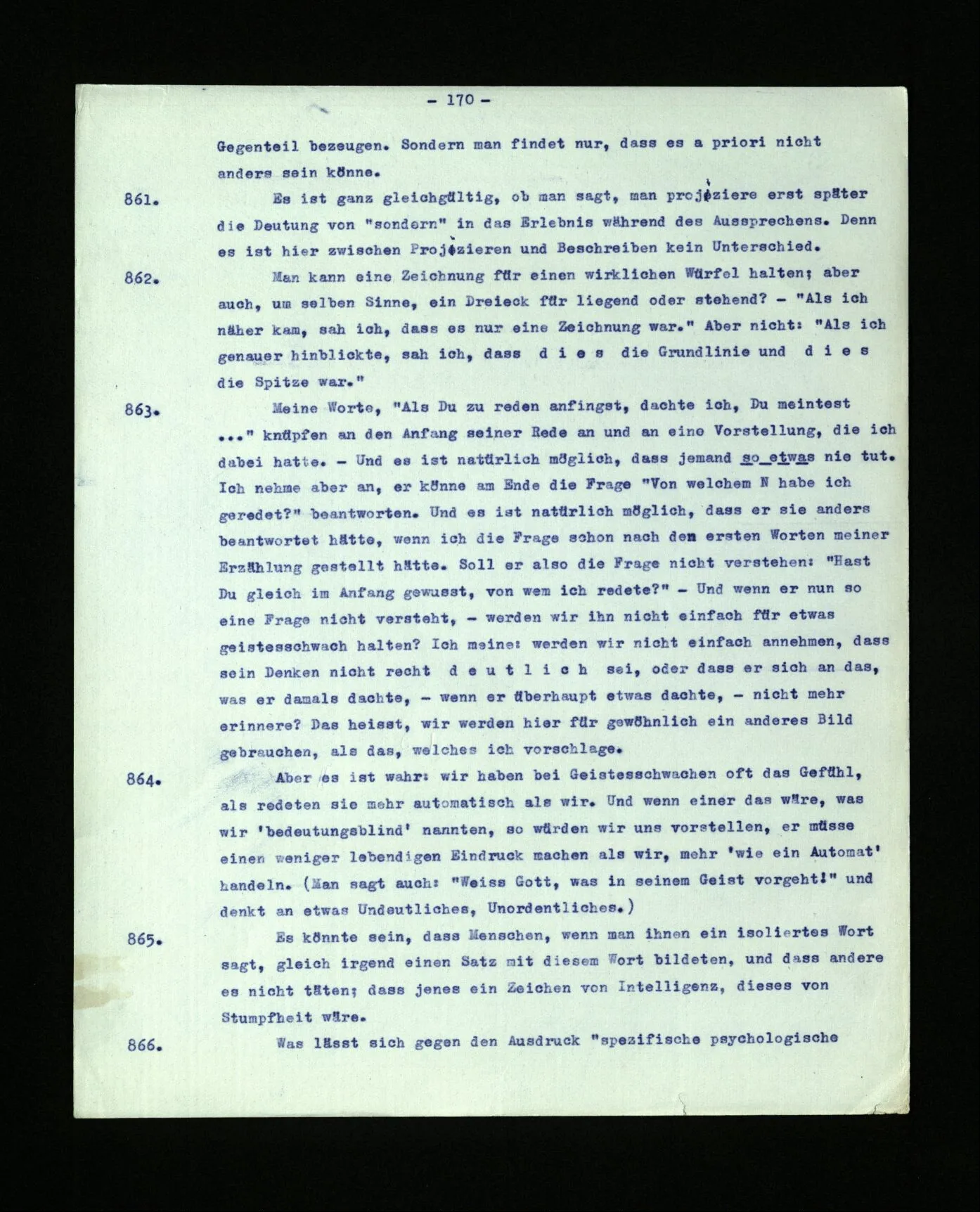 1801. Er fragt “Was hast Du mit dem Wort gemeint?” – Ich beantworte die Frage und setze hinzu: “Hättest Du mich früher gefragt, so hätte ich das gleiche geantwortet; meine Antwort war nicht eine Deutung, die mir jetzt eingefallen ist.” So war sie mir schon früher eingefallen? Nein. – Und wie konnte ich dann sagen: “Hättest Du mich früher gefragt, so hätte ich ‥‥”? Woraus schloß ich das? Aus gar nichts. Was teile ich ihm mit, wenn ich diesen Konditional ausspreche? Etwas, was manchmal von Wichtigkeit sein kann.