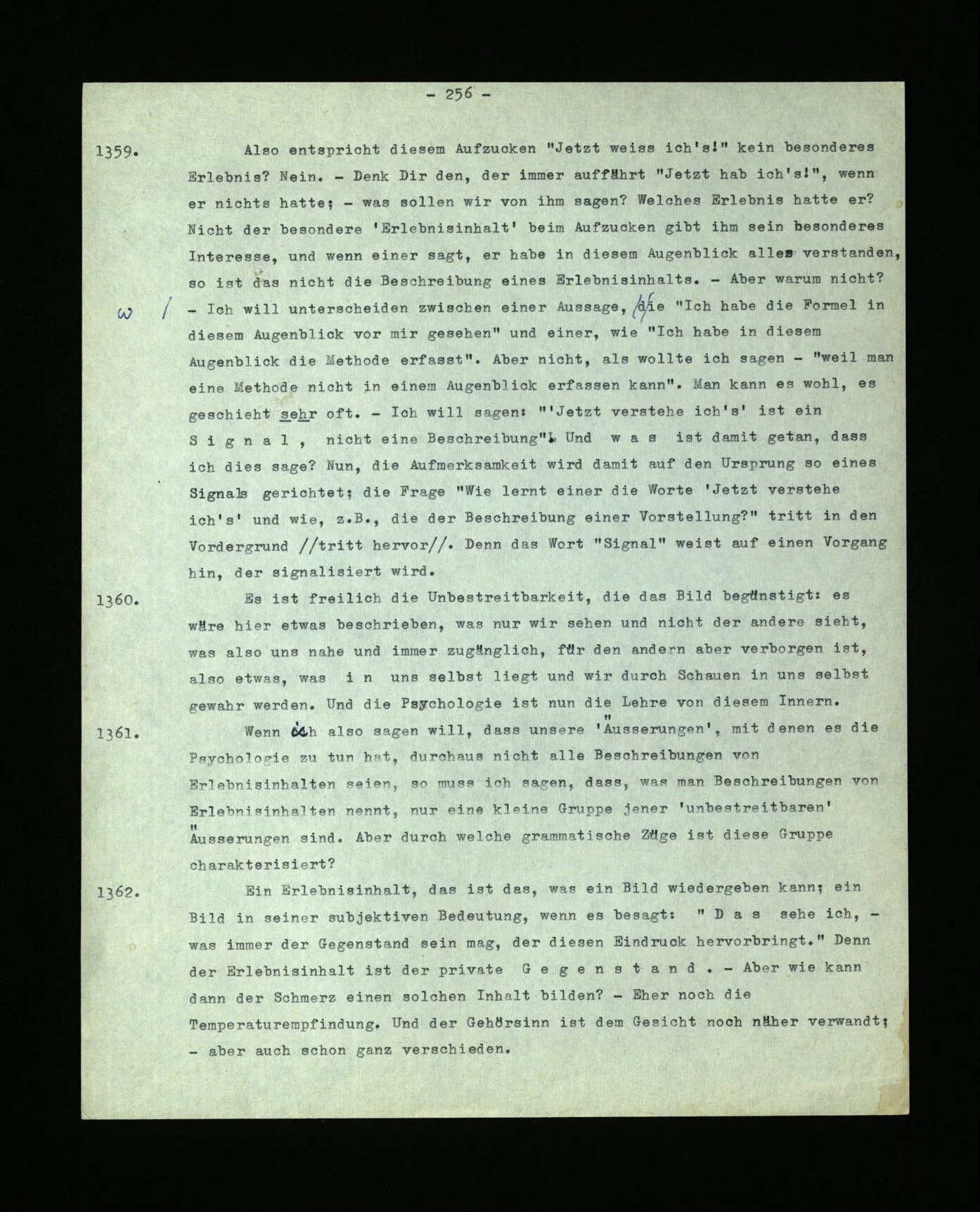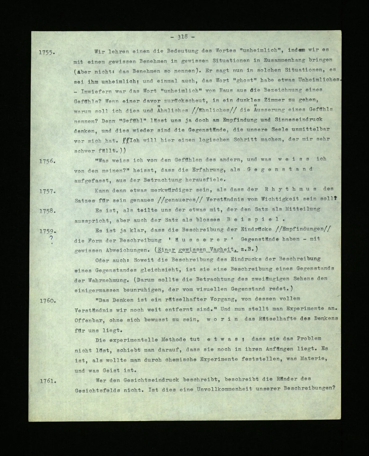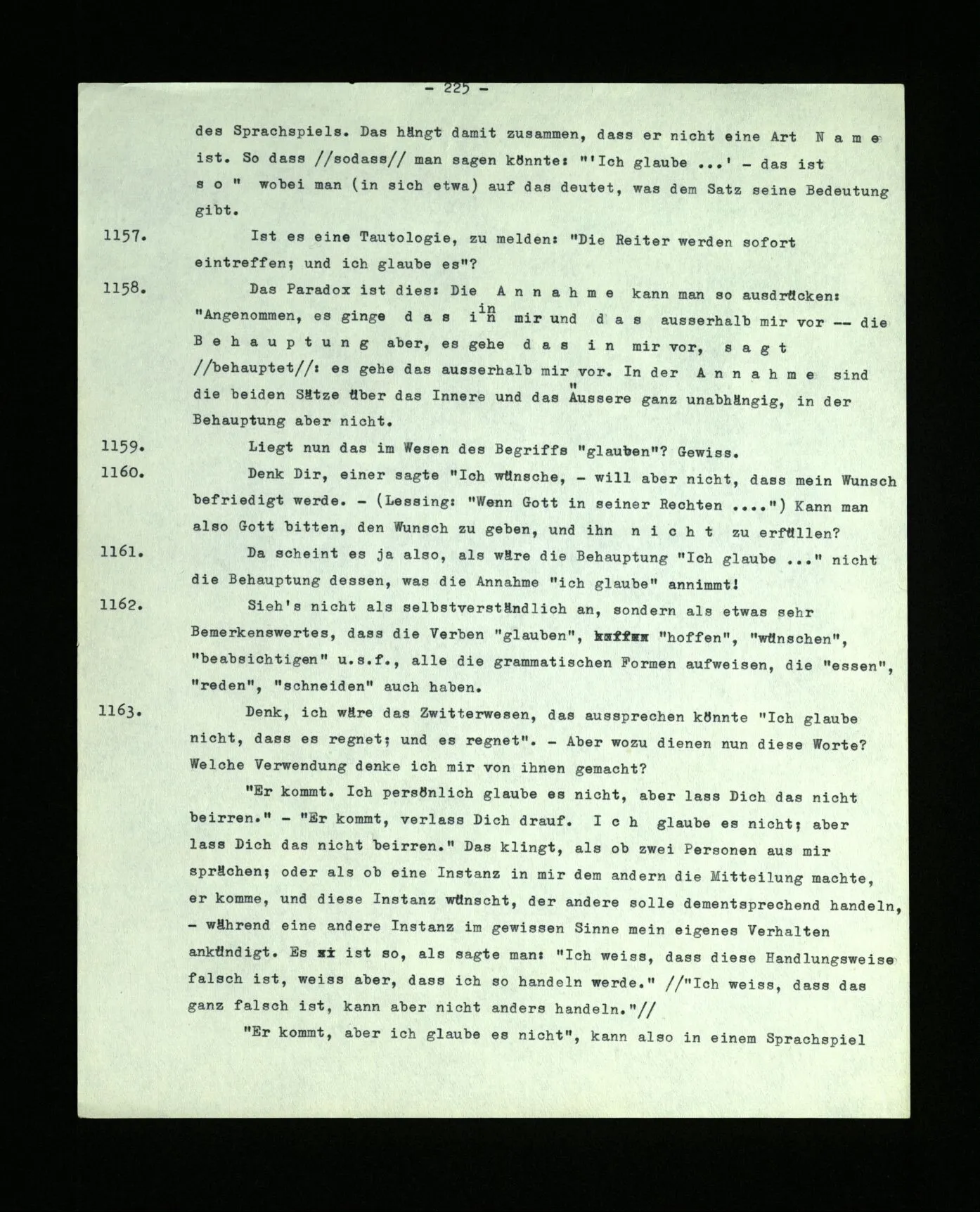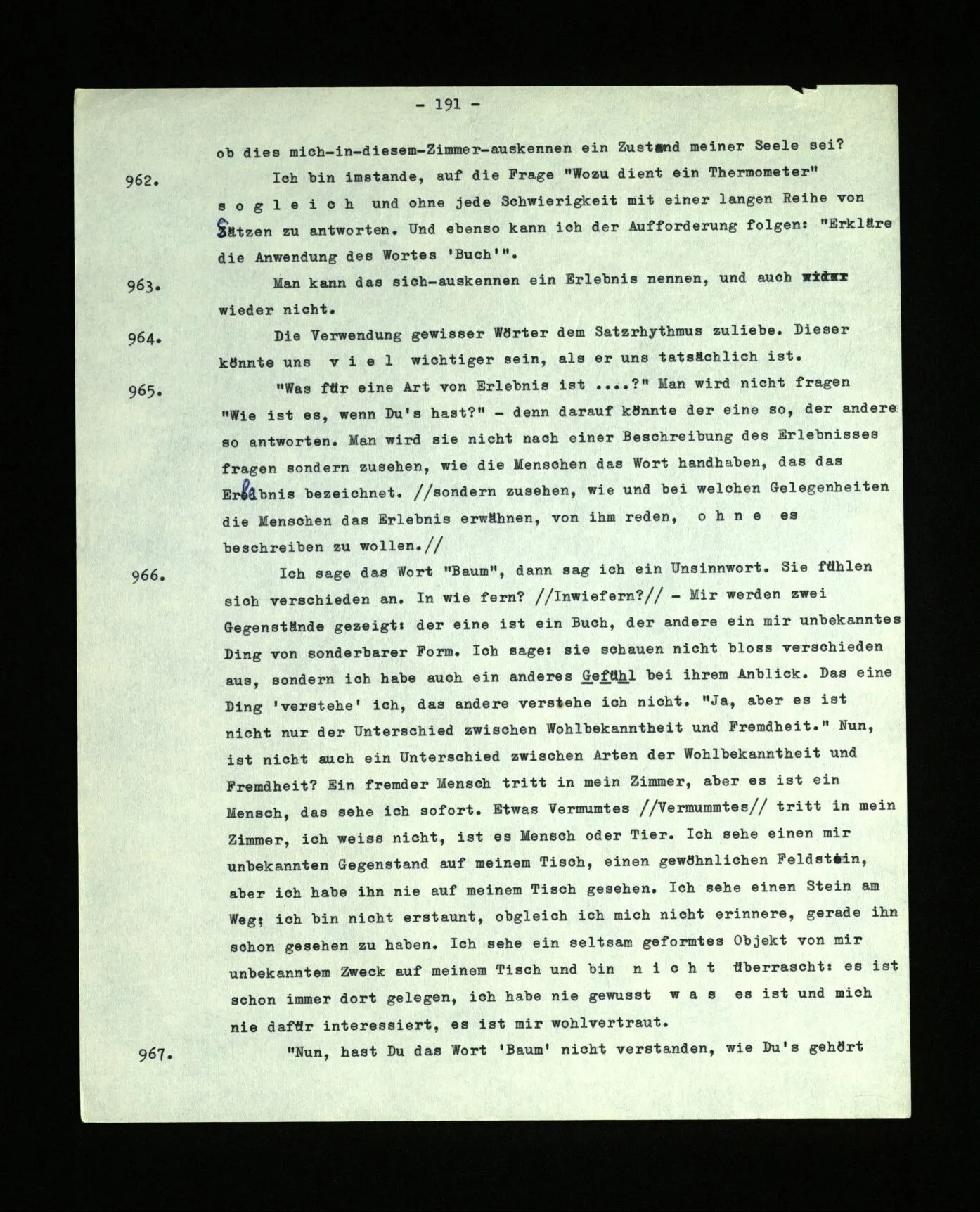 1801. Er fragt “Was hast Du mit dem Wort gemeint?” – Ich beantworte die Frage und setze hinzu: “Hättest Du mich früher gefragt, so hätte ich das gleiche geantwortet; meine Antwort war nicht eine Deutung, die mir jetzt eingefallen ist.” So war sie mir schon früher eingefallen? Nein. – Und wie konnte ich dann sagen: “Hättest Du mich früher gefragt, so hätte ich ‥‥”? Woraus schloß ich das? Aus gar nichts. Was teile ich ihm mit, wenn ich diesen Konditional ausspreche? Etwas, was manchmal von Wichtigkeit sein kann.